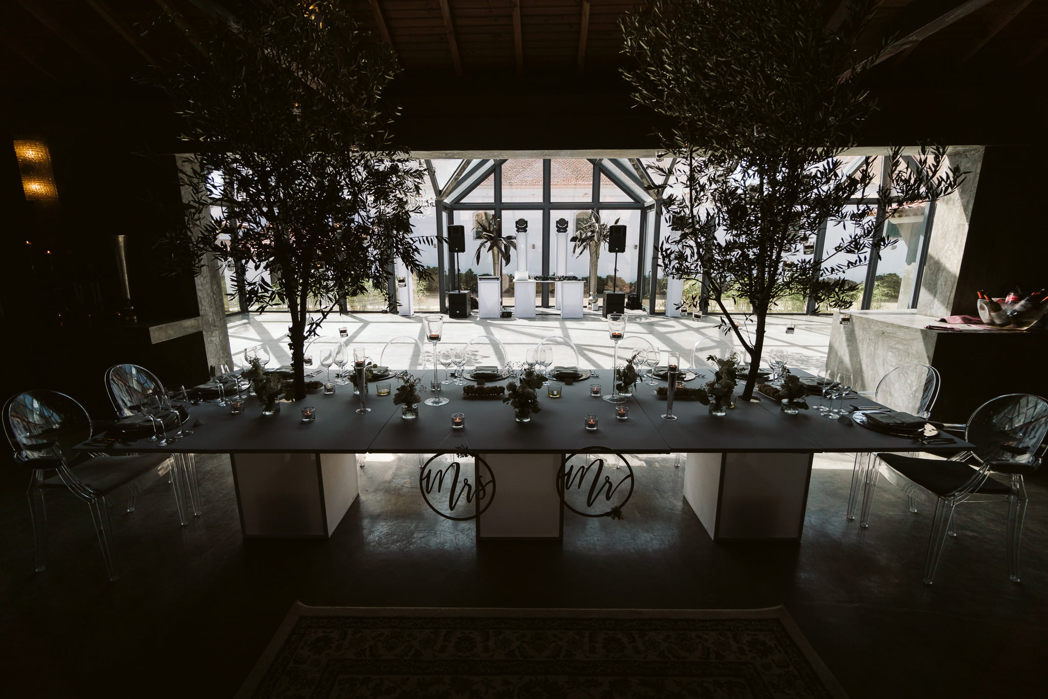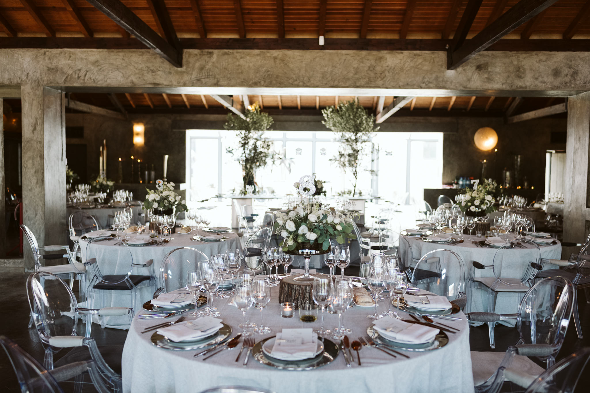 The reception space at Adega de Colares is architectural poetry. The long tables set against the massive wine barrels create a scale that is both grand and intimate. The decor was executed to perfection, leaning into the rustic elegance of the space without over-competing with its natural character.