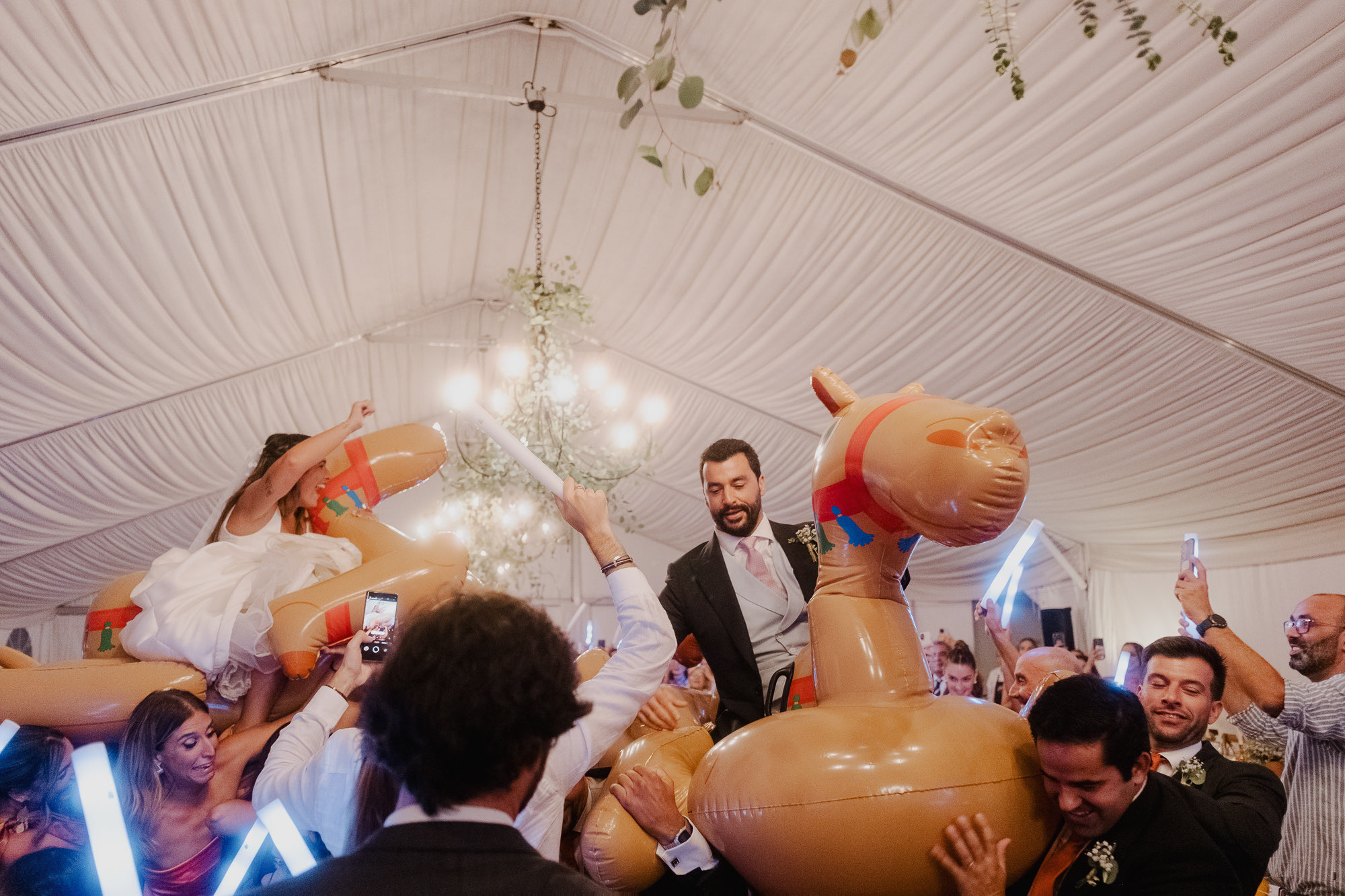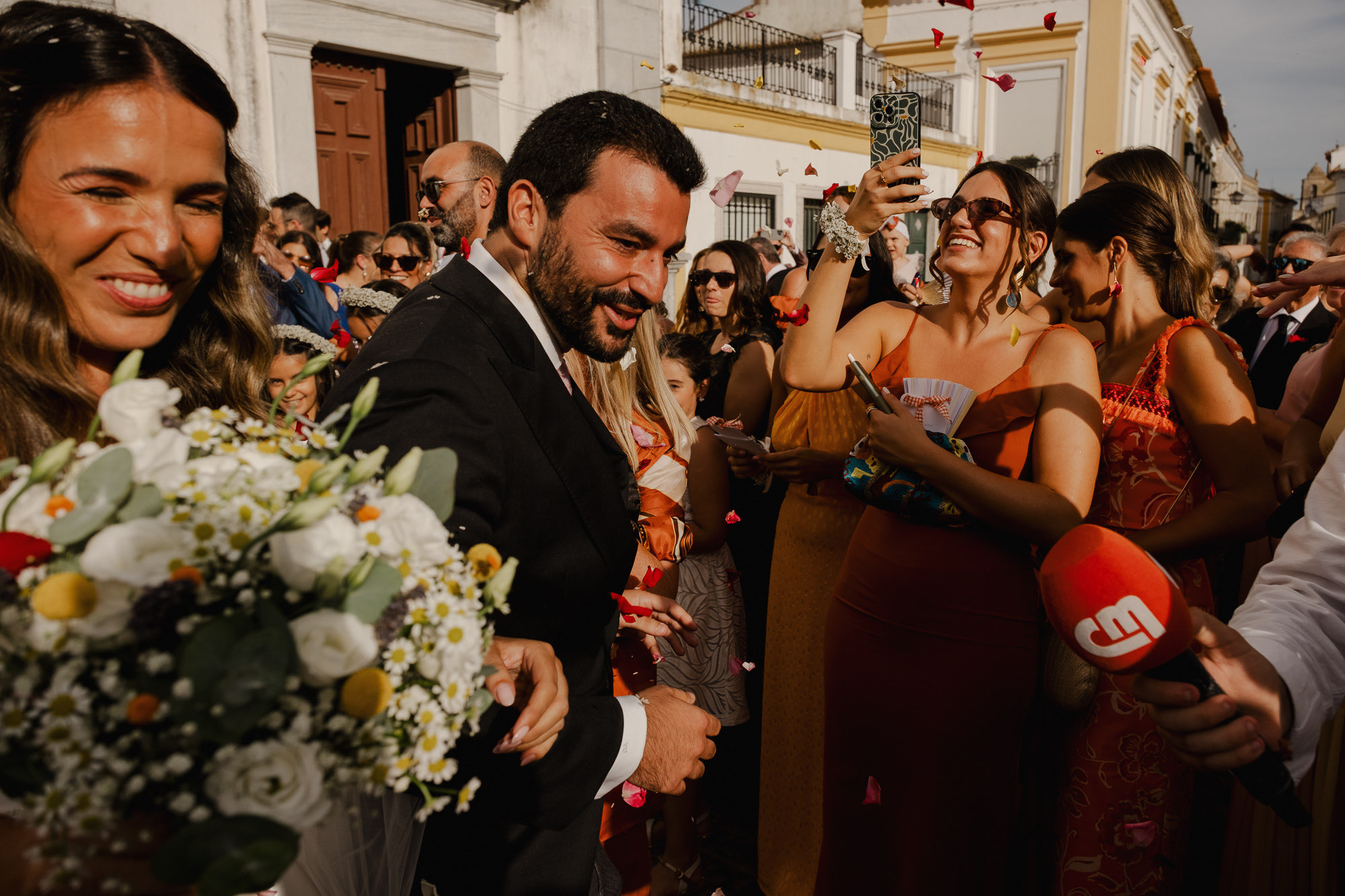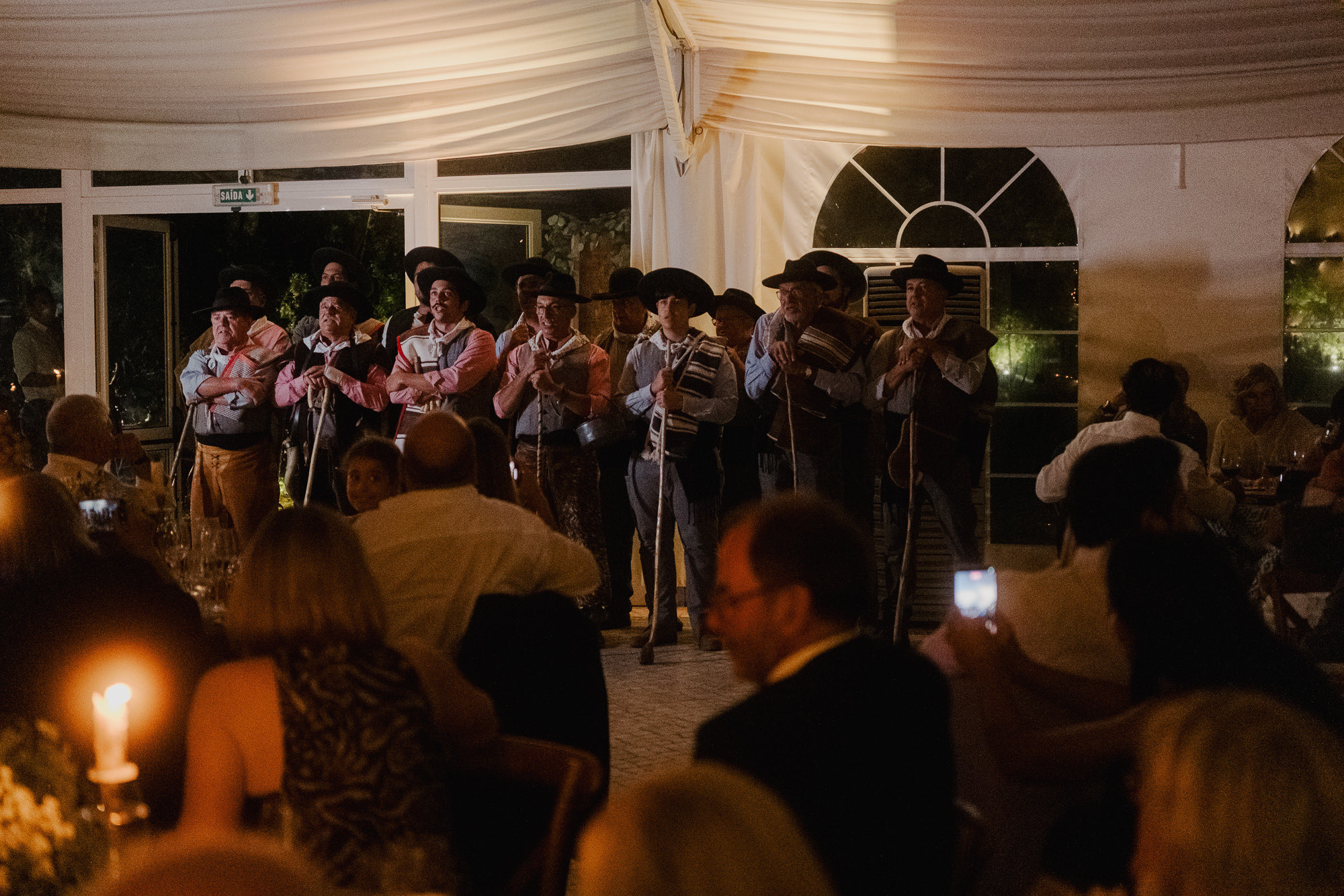 The exit from the church felt like “photographic warfare,” with everyone trying to get the shot, but I loved the adrenaline. The highlight? The couple entering the dinner carried on an inflated horse balloon by their bridal party. Between that and the traditional Alentejo singing, it was a visual feast.