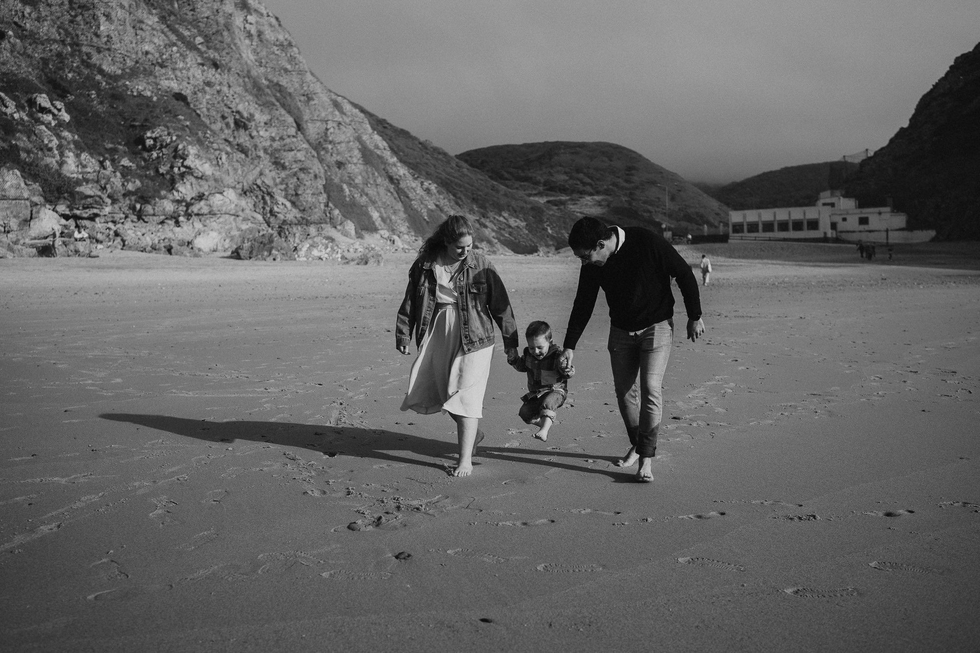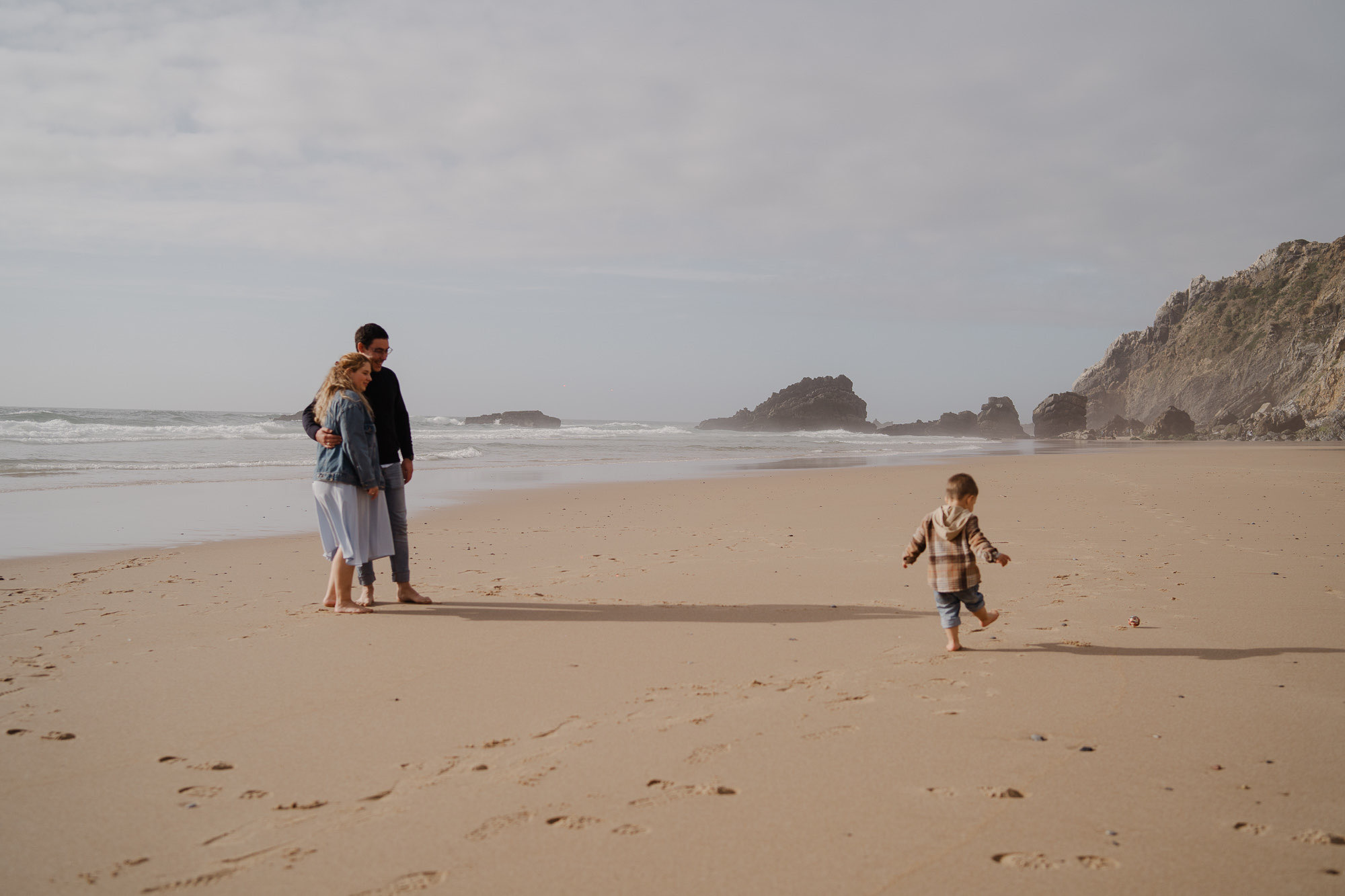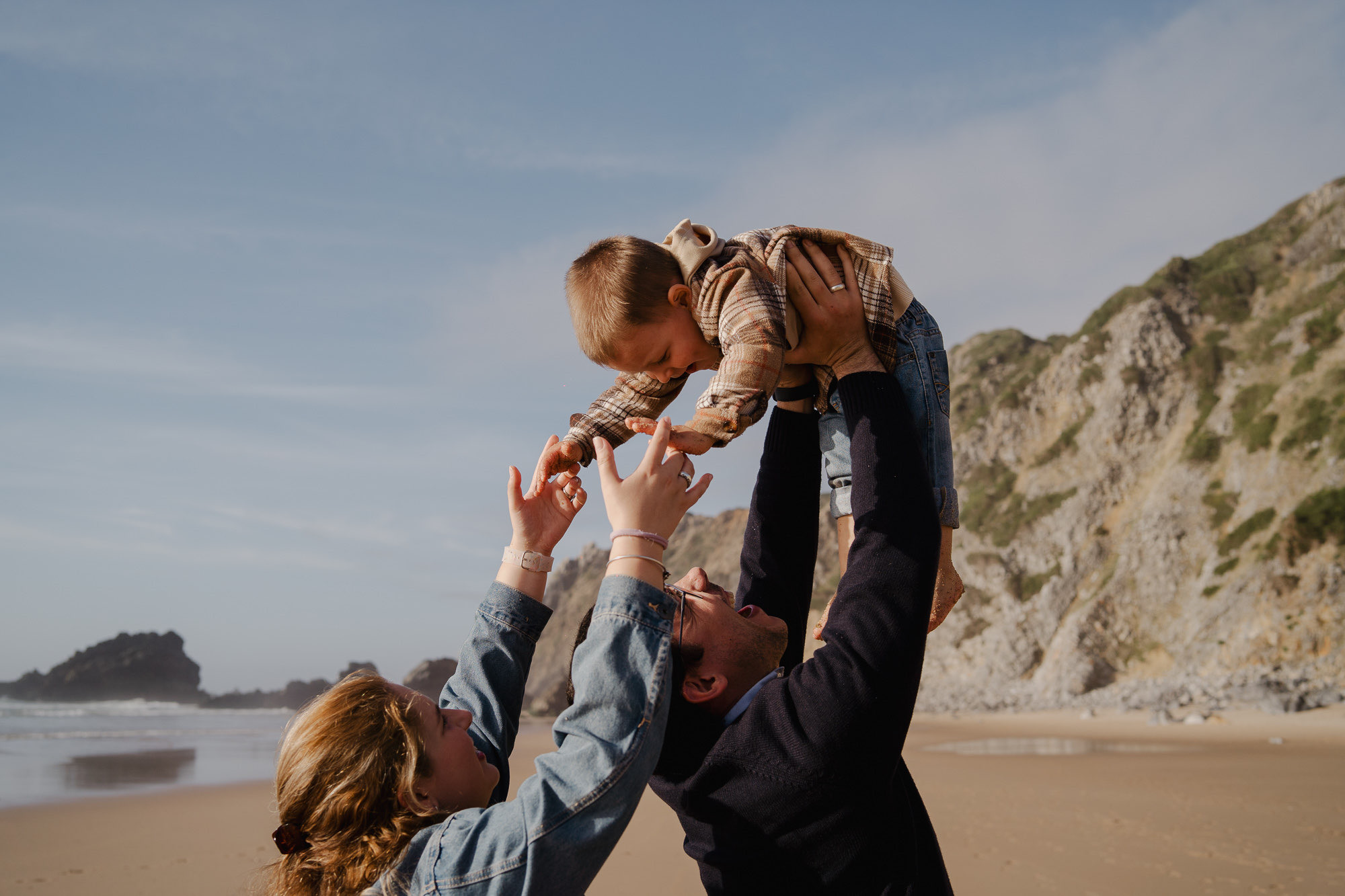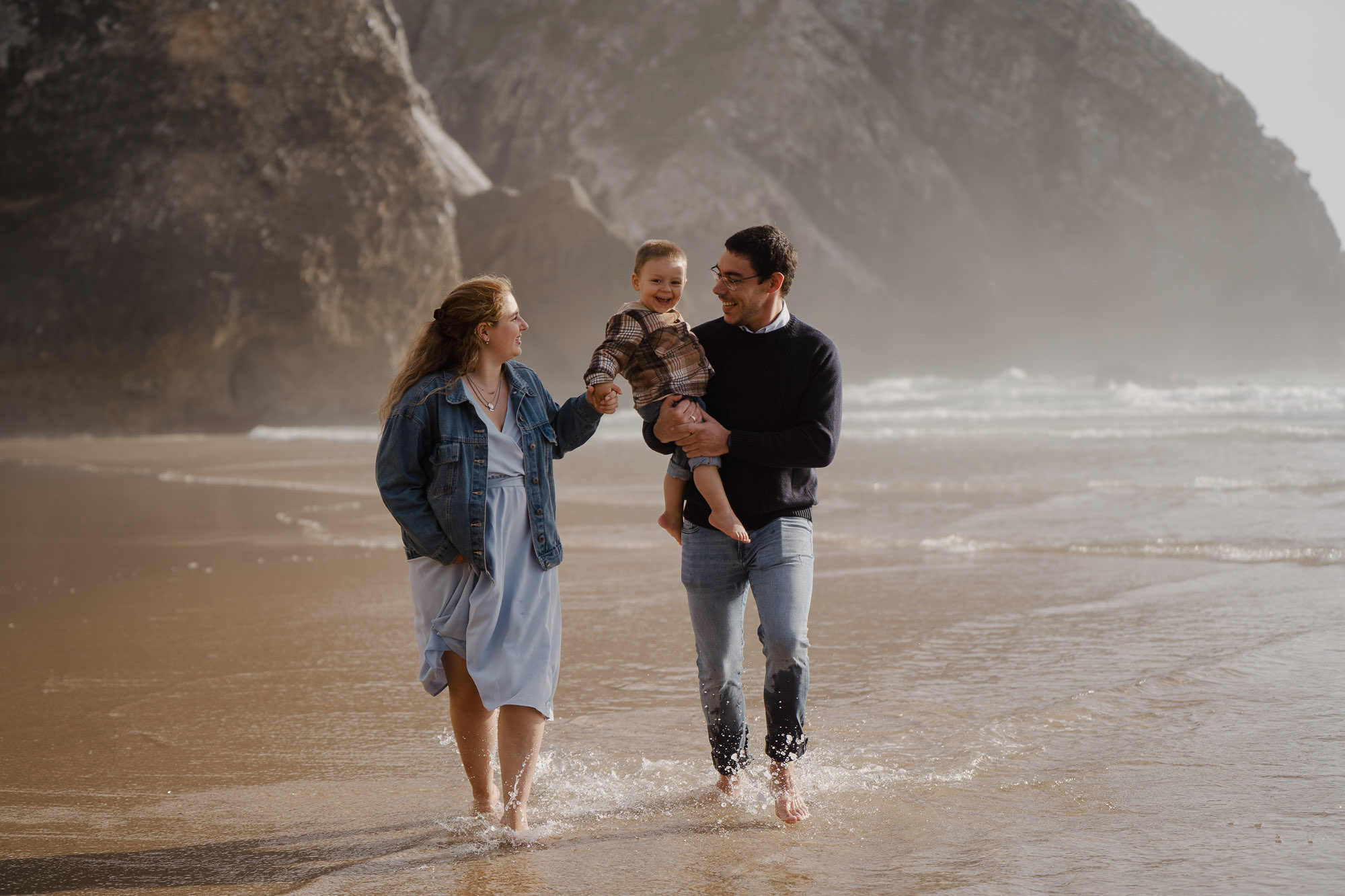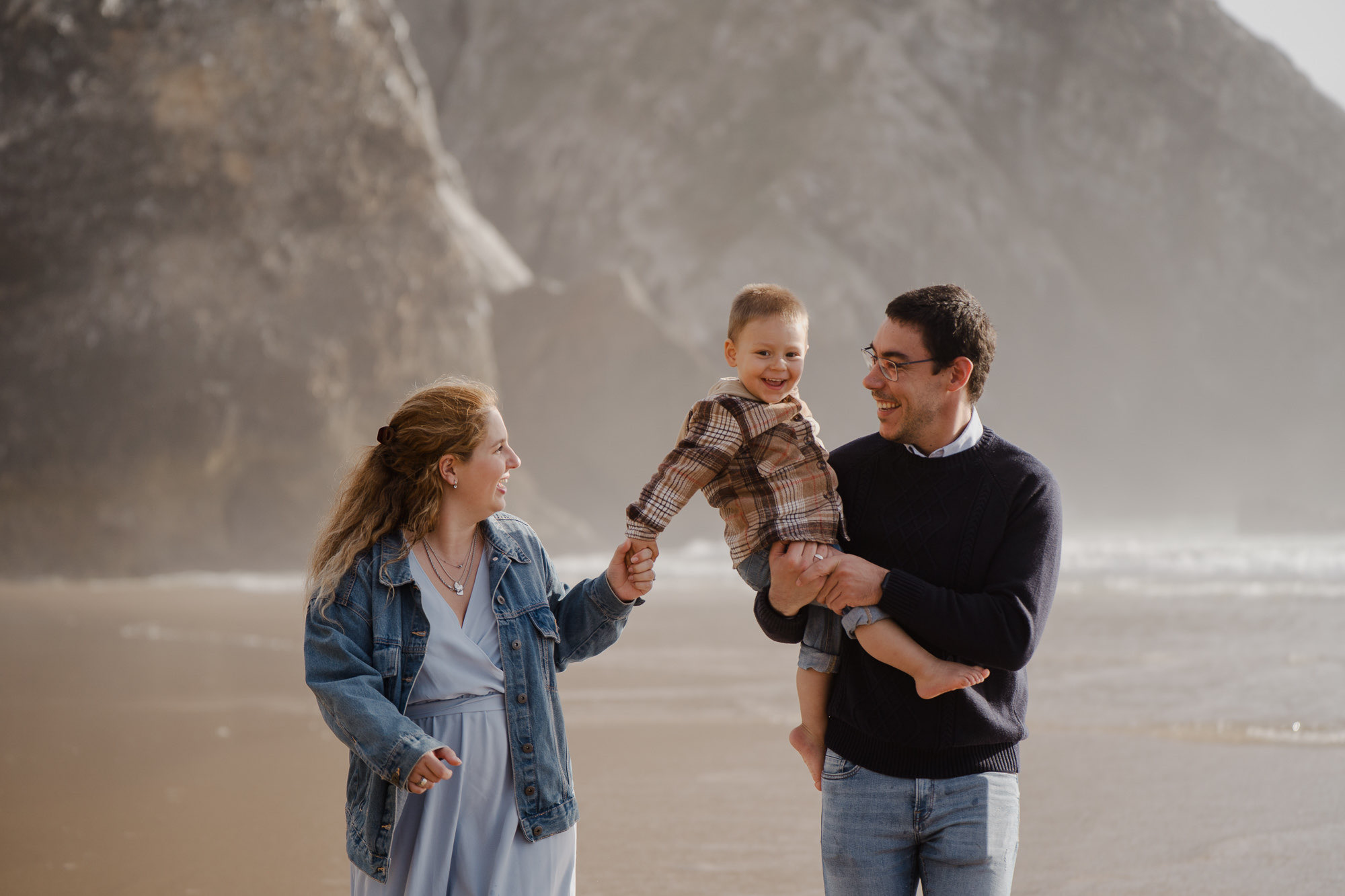 We arrived to find a wall of thick fog and a biting chill—a dream for anyone looking for “out of the ordinary” photos. Duarte ran wild through the clouds, and I edited these with a specific mood: cooler, blueish tones for the mist, while keeping their skin tones warm and alive. After the mountain mist, we headed down to the beach for some sun and sand. Peninha is unpredictable, but that’s exactly why it produces the most soulful images in Portugal.