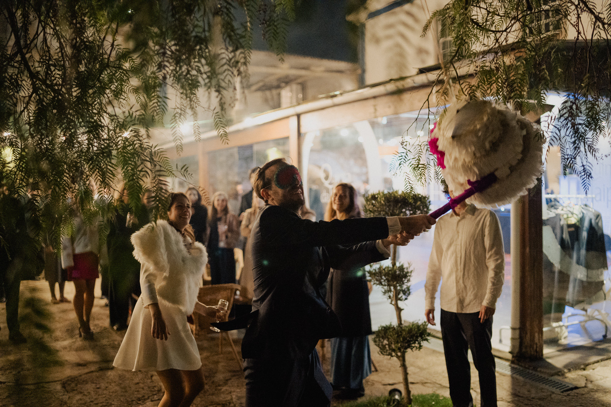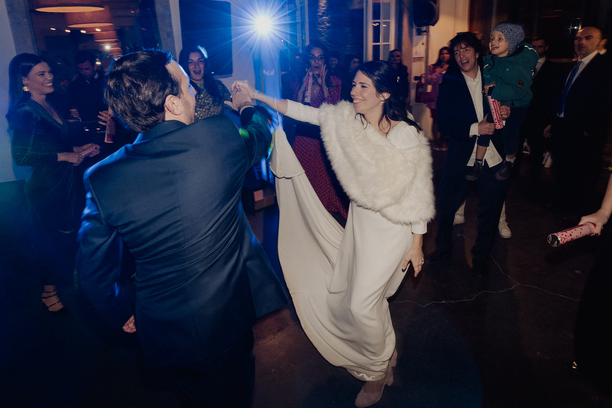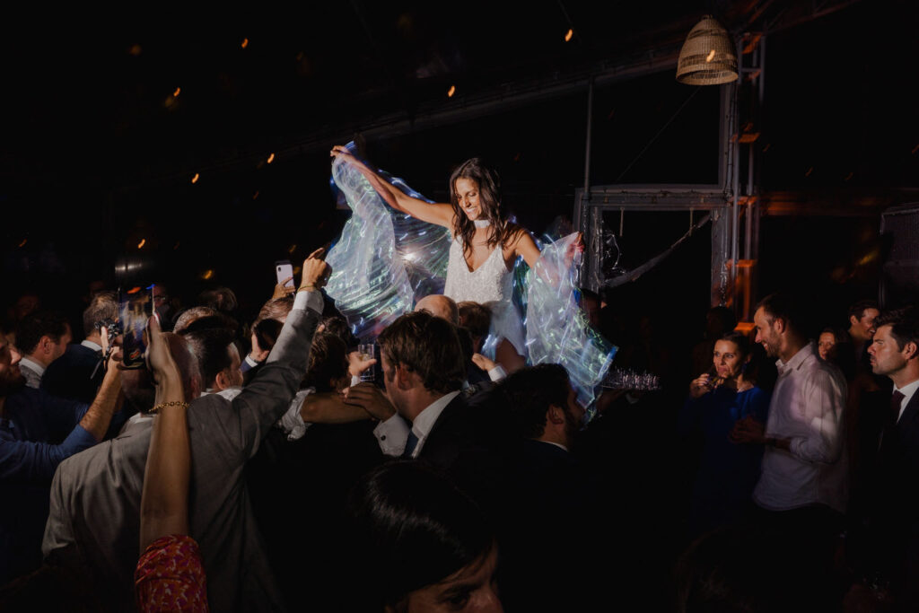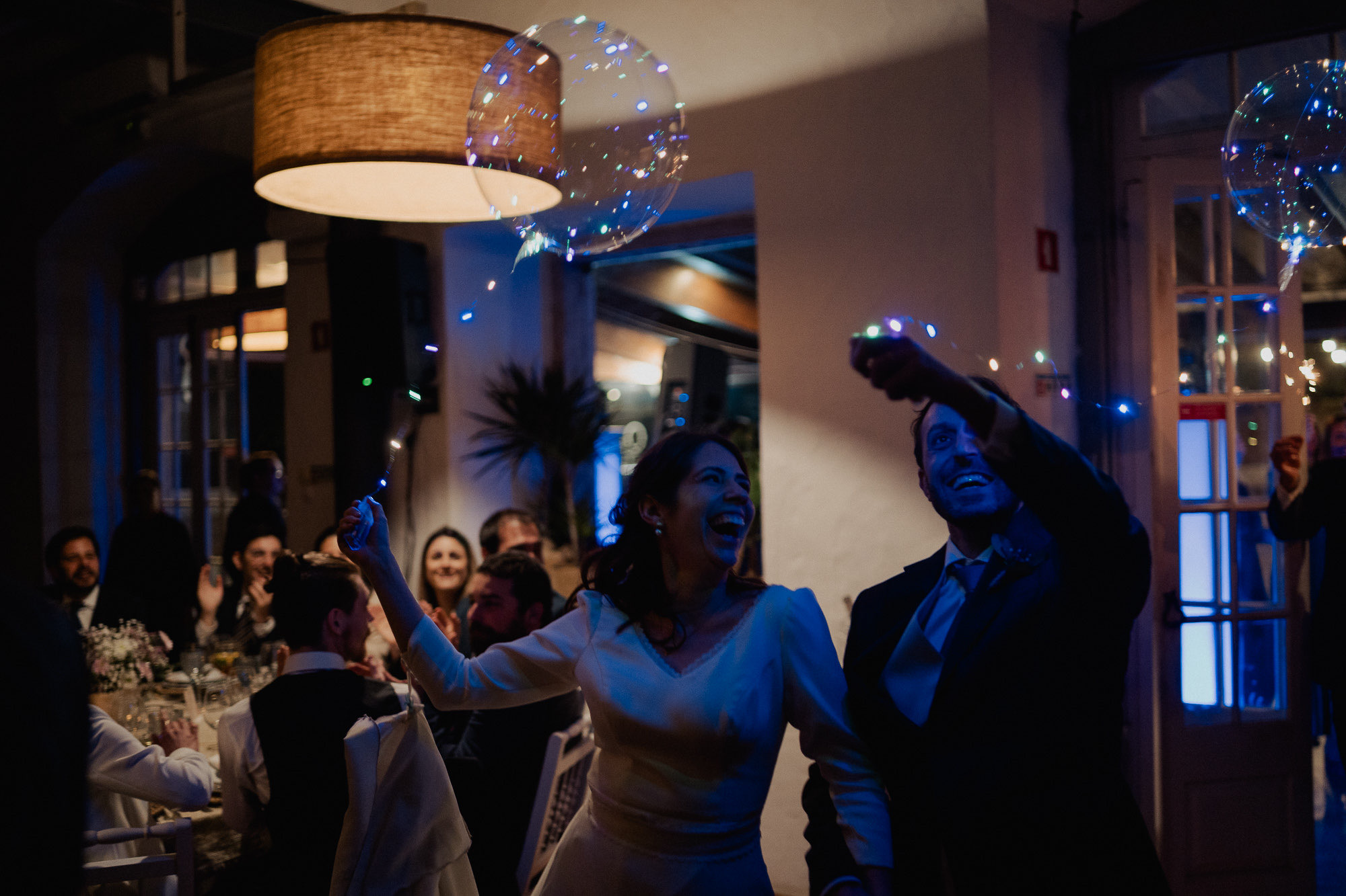They skipped the formal mini-session to spend more time with their people, which I love. But the shot of the night? The couple entering the dinner behind LED balloons. I caught their kiss through the reflection of the balloon. It’s not perfectly in focus, and that’s exactly why it’s one of my favorite shots ever. We ended the night with the bride in cowboy boots and a second dress—total rockstar vibes under the Alenquer stars.