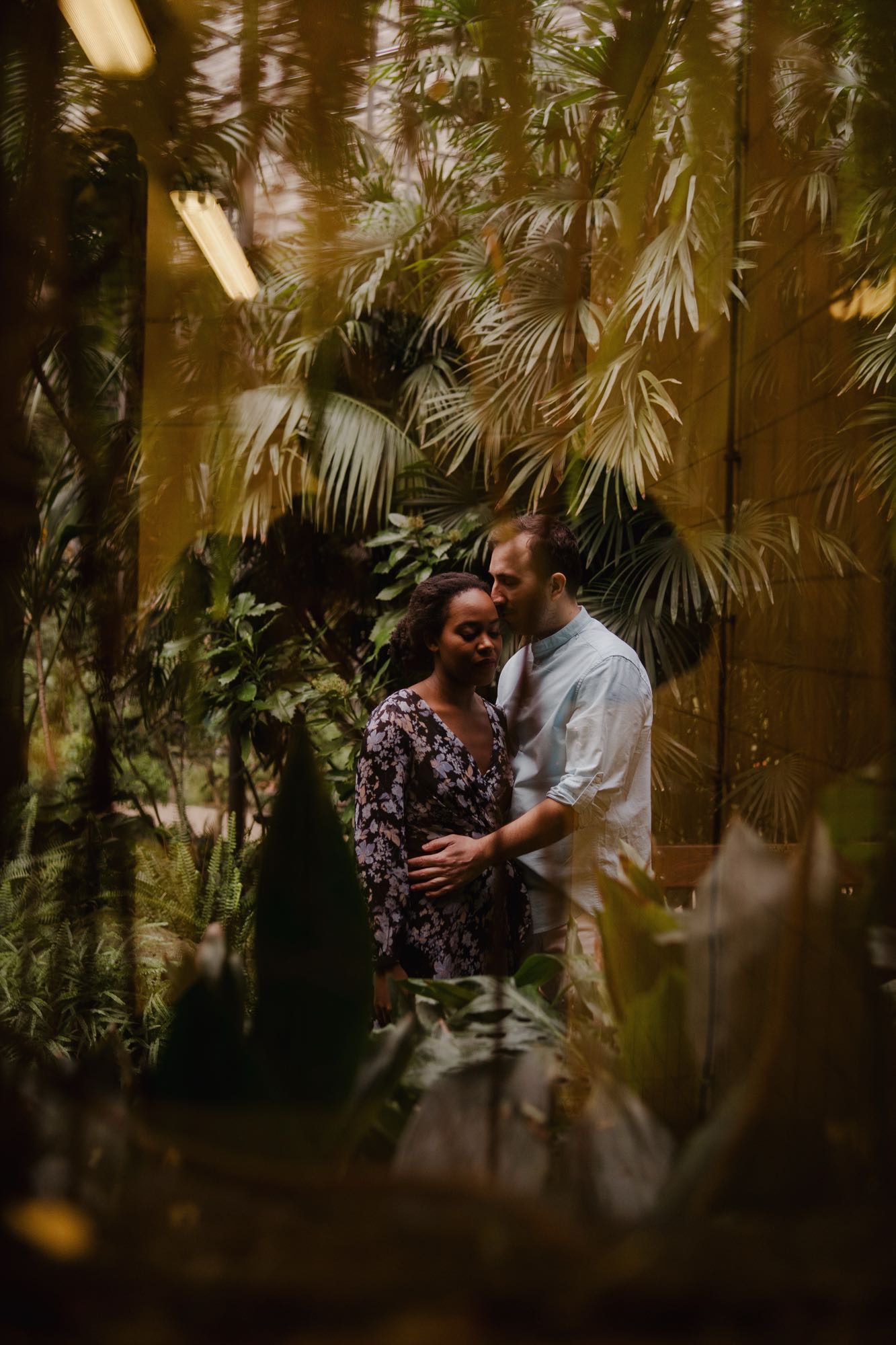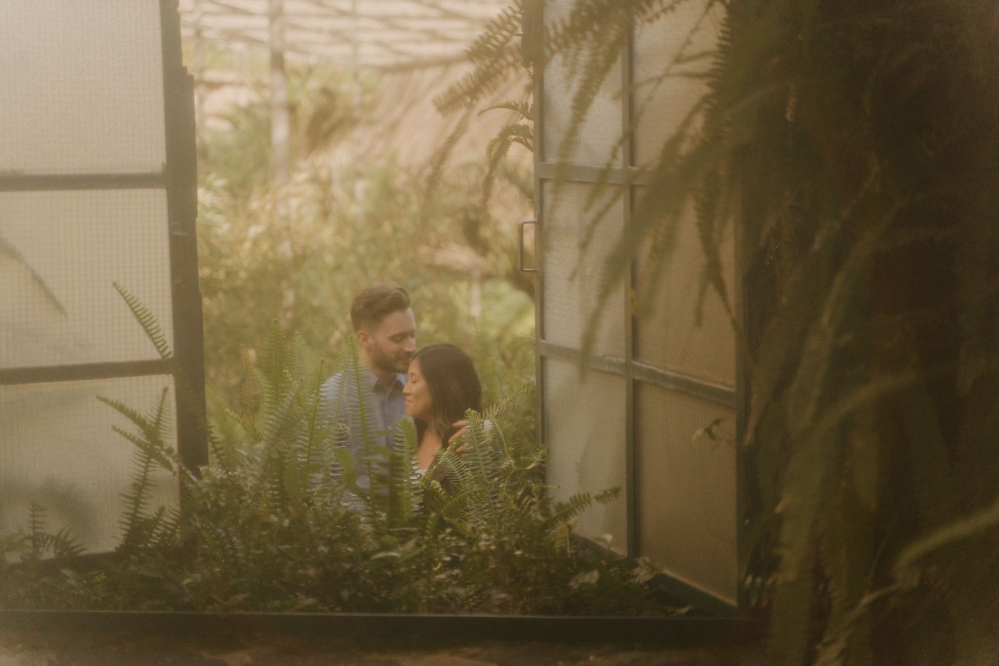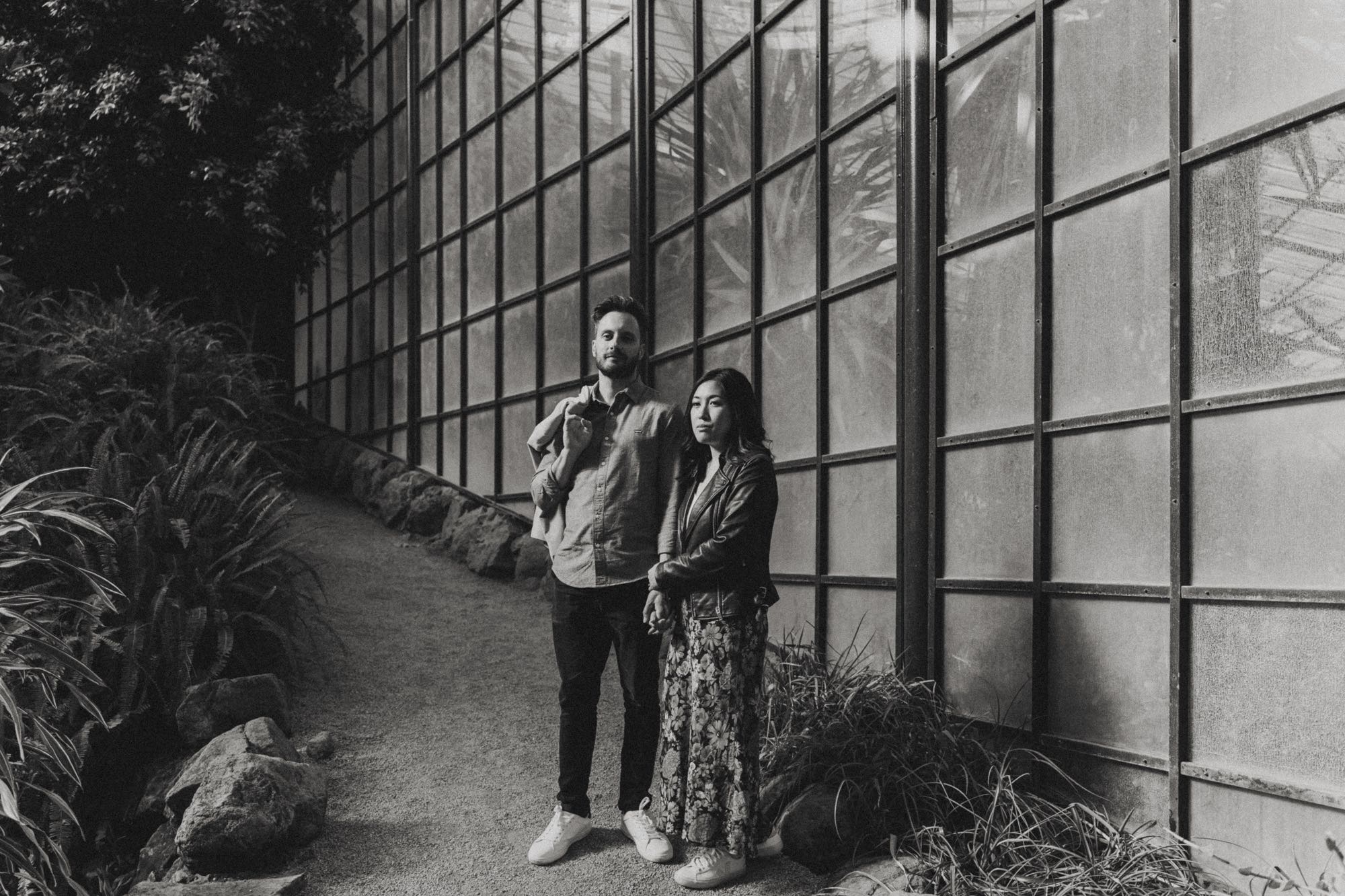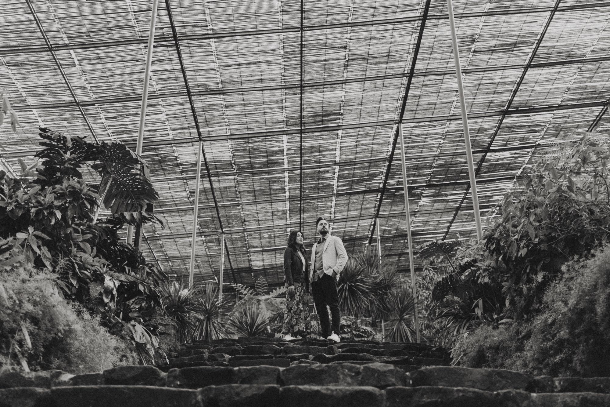 As we moved deeper into the glass-covered sections, the light became even more ethereal. There is a specific “greenhouse glow” that happens here—a soft, diffused light that is incredibly flattering. These capture that quiet, black-and-white intimacy that happens when the world outside the glass disappears, leaving only the two of you.