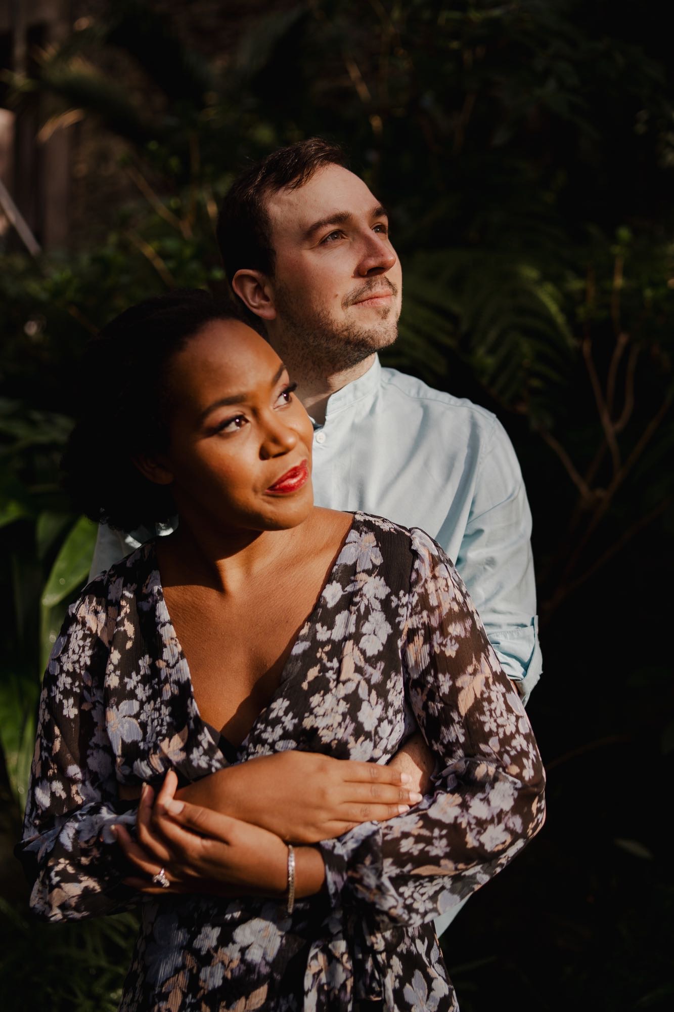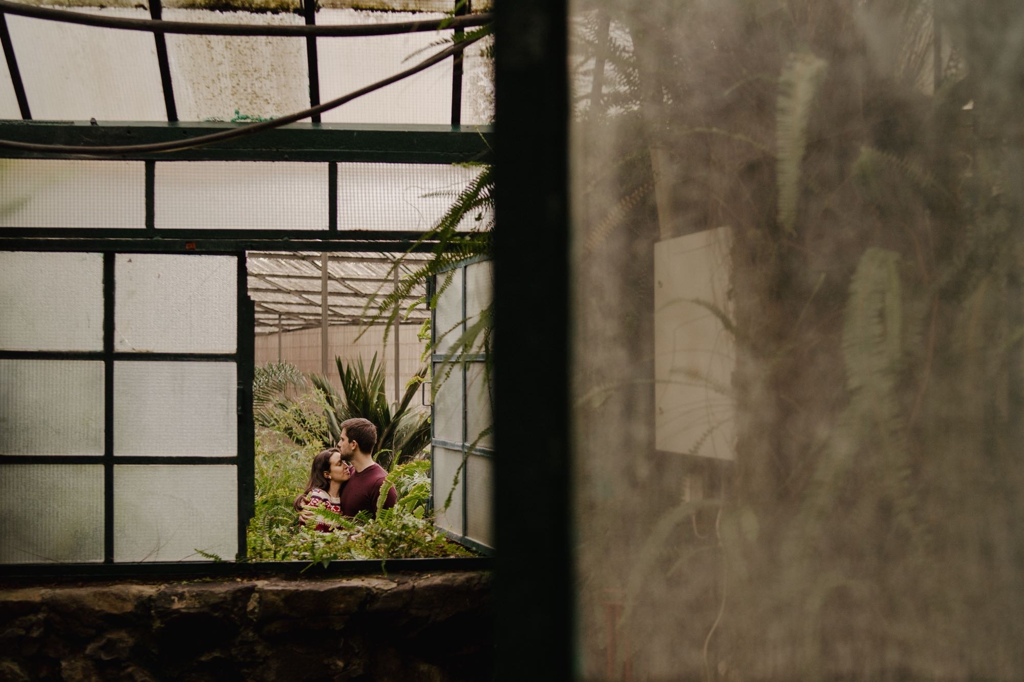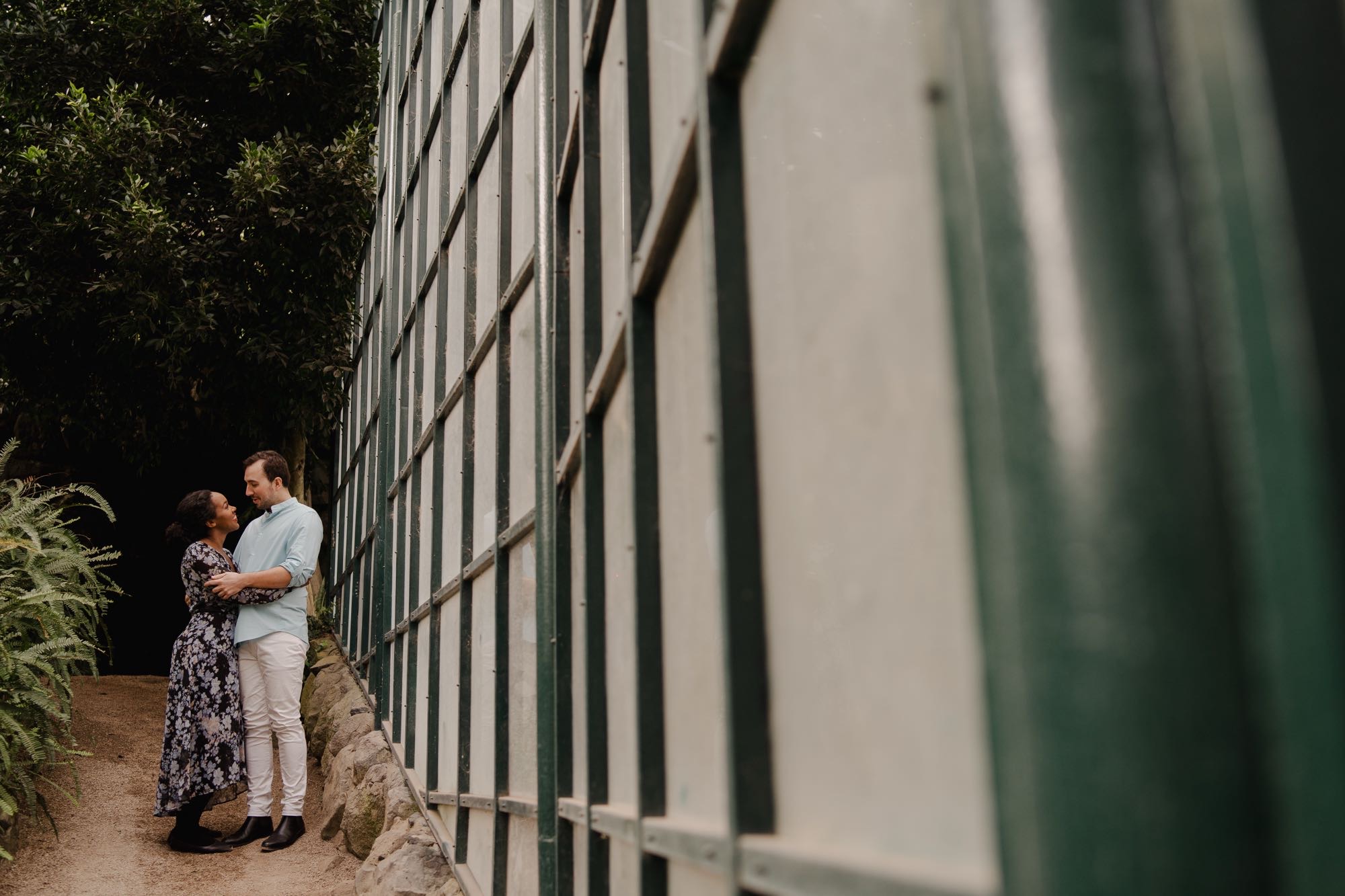 As we moved deeper into the glass-covered sections, the light became even more ethereal. There is a specific “greenhouse glow” that happens here—a soft, diffused light that is incredibly flattering. These capture that quiet, black-and-white intimacy that happens when the world outside the glass disappears, leaving only the two of you.