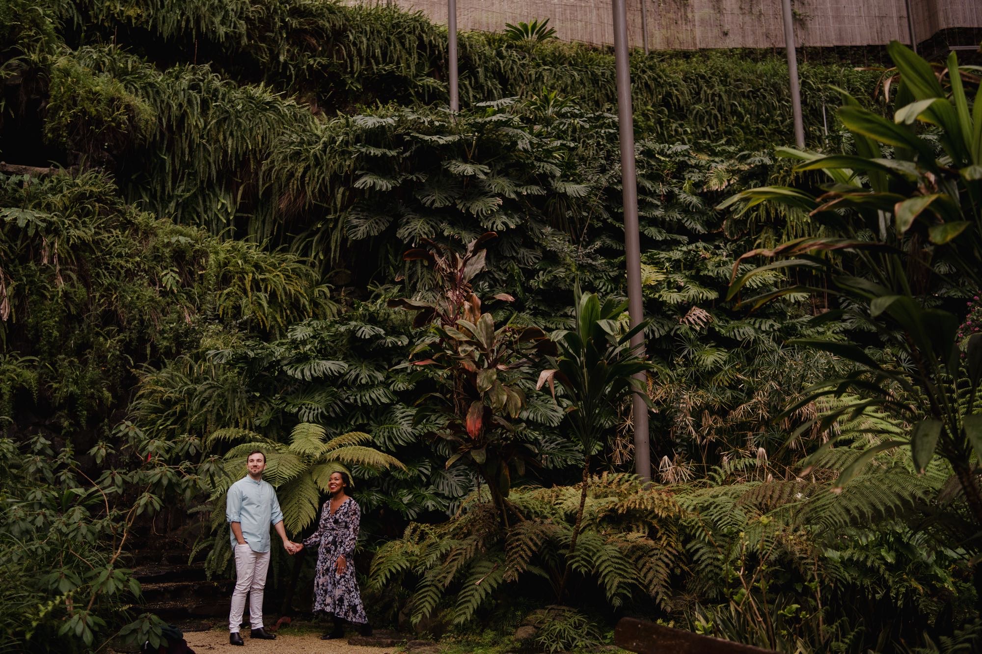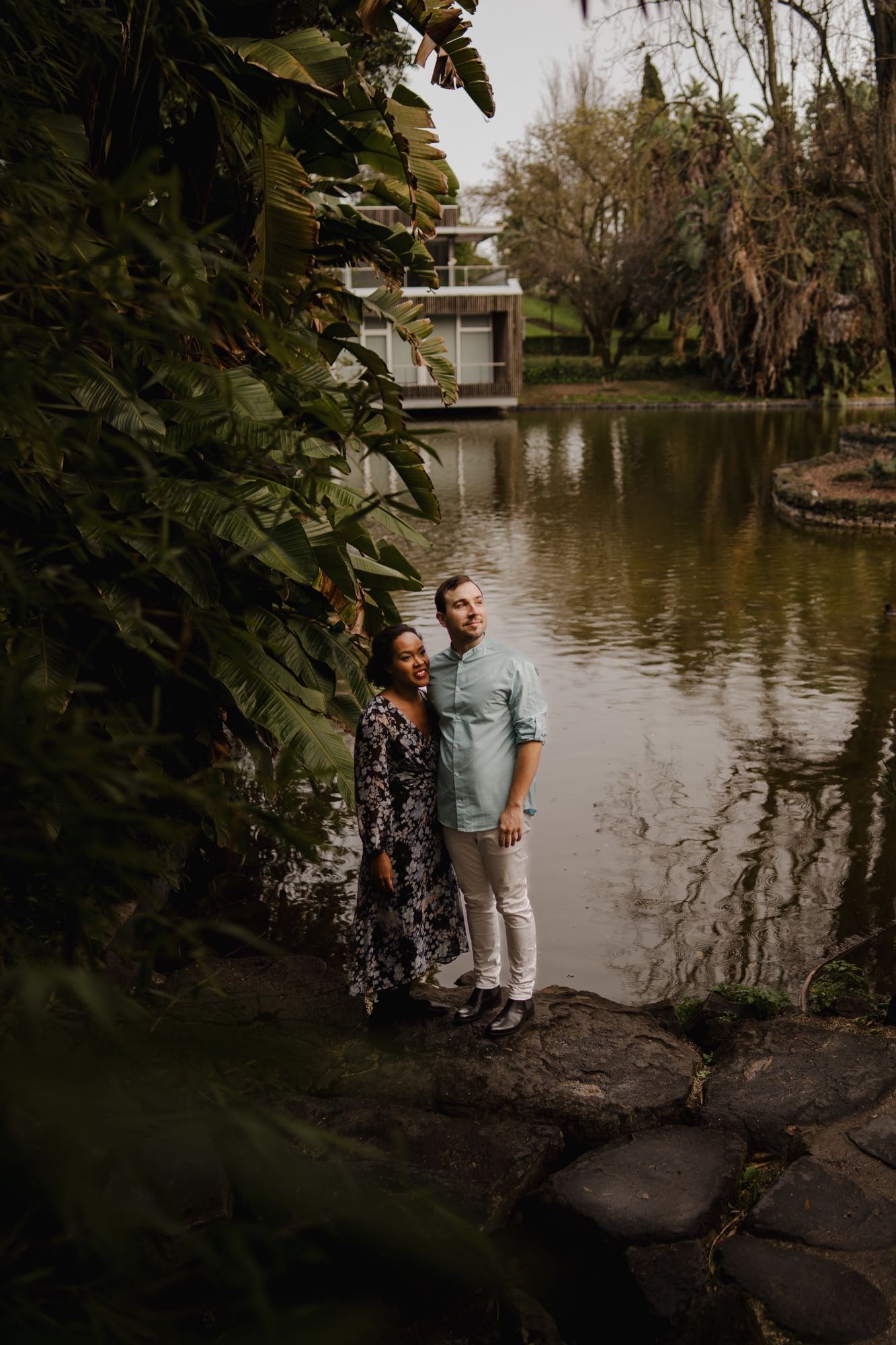 Engagement sessions should, above all, be fun. As we explored the upper terraces and the small ponds the playfulness came out. Whether it’s a stolen kiss behind a leaf or a wide-angle shot showing the vastness of the tropical forest, these moments are the heartbeat of a Lisbon couple photoshoot.