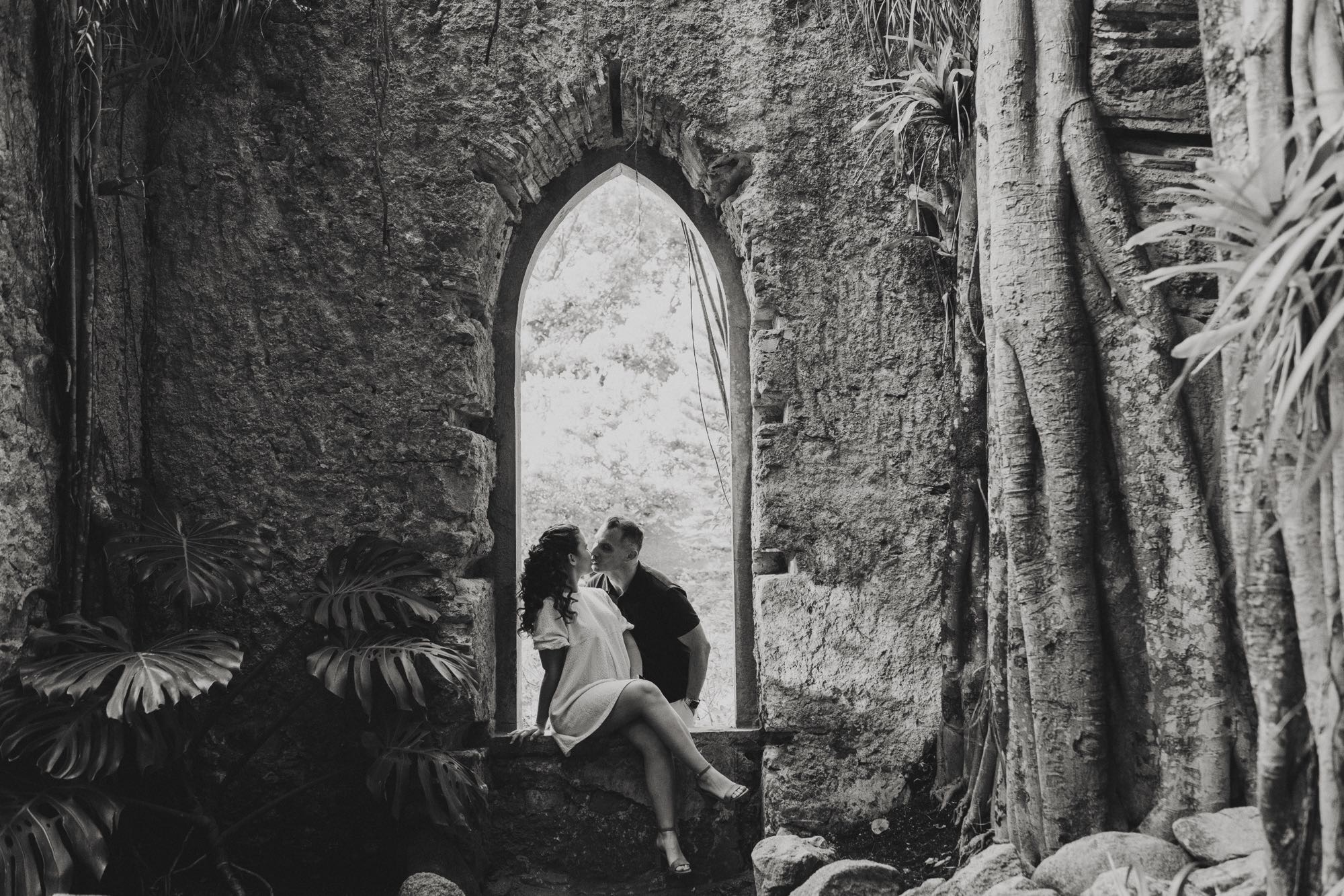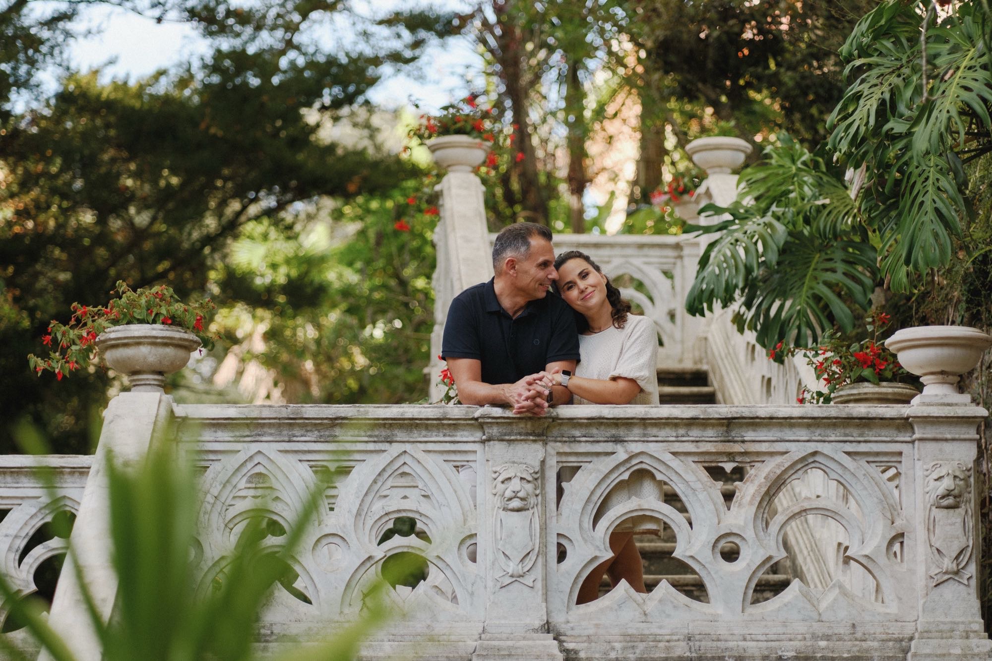 We finished the session exploring the “ruined” chapel and the sprawling gardens. The light filtering through the stone windows (Photos 32 & 33) creates a sacred, quiet energy. From the wide-angle shots of the Palace exterior to the playful moments on the stone benches, this session proves that engagement photography in Monserrate is the gold standard for couples who want a mix of nature and high-art architecture.