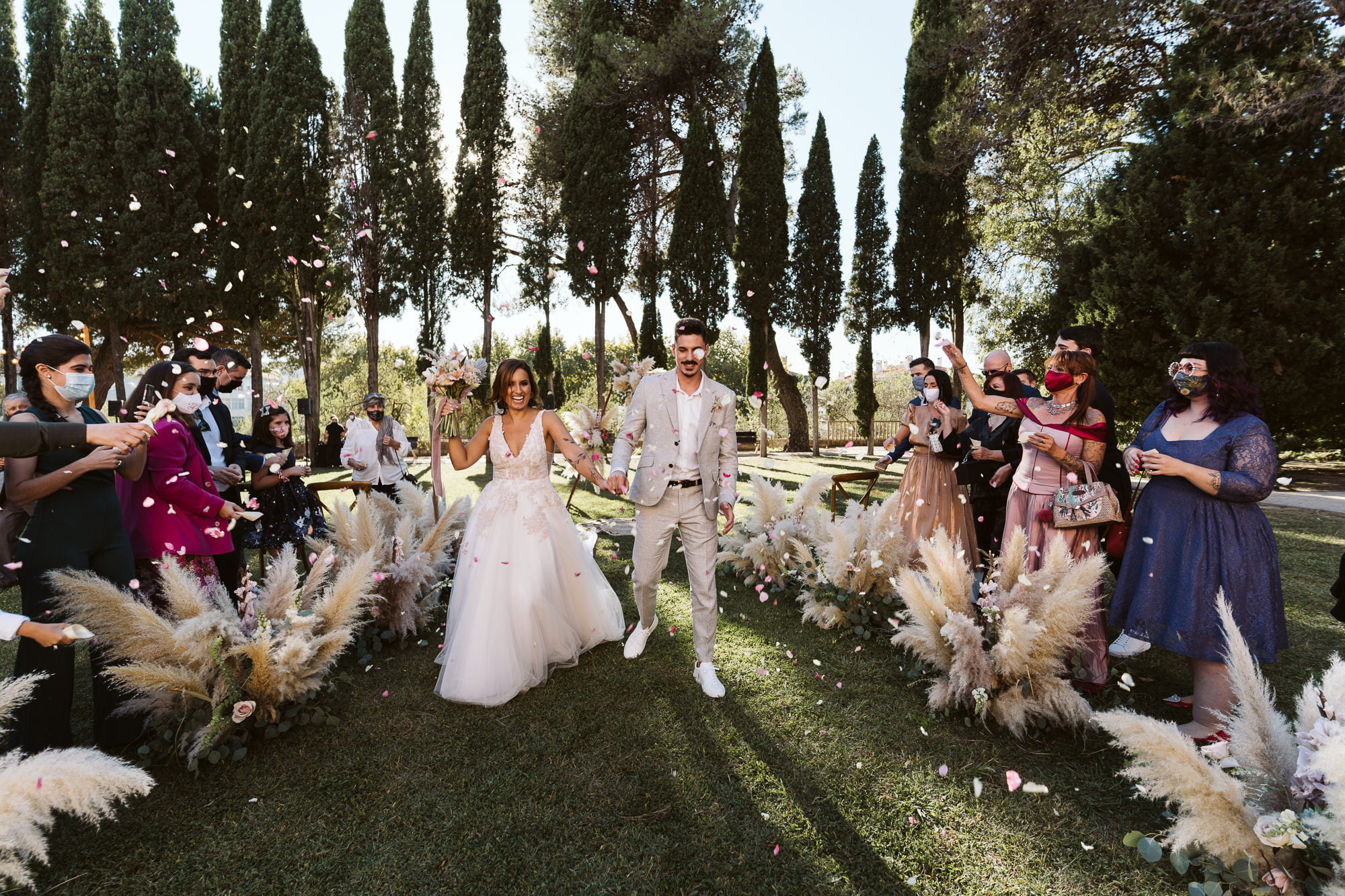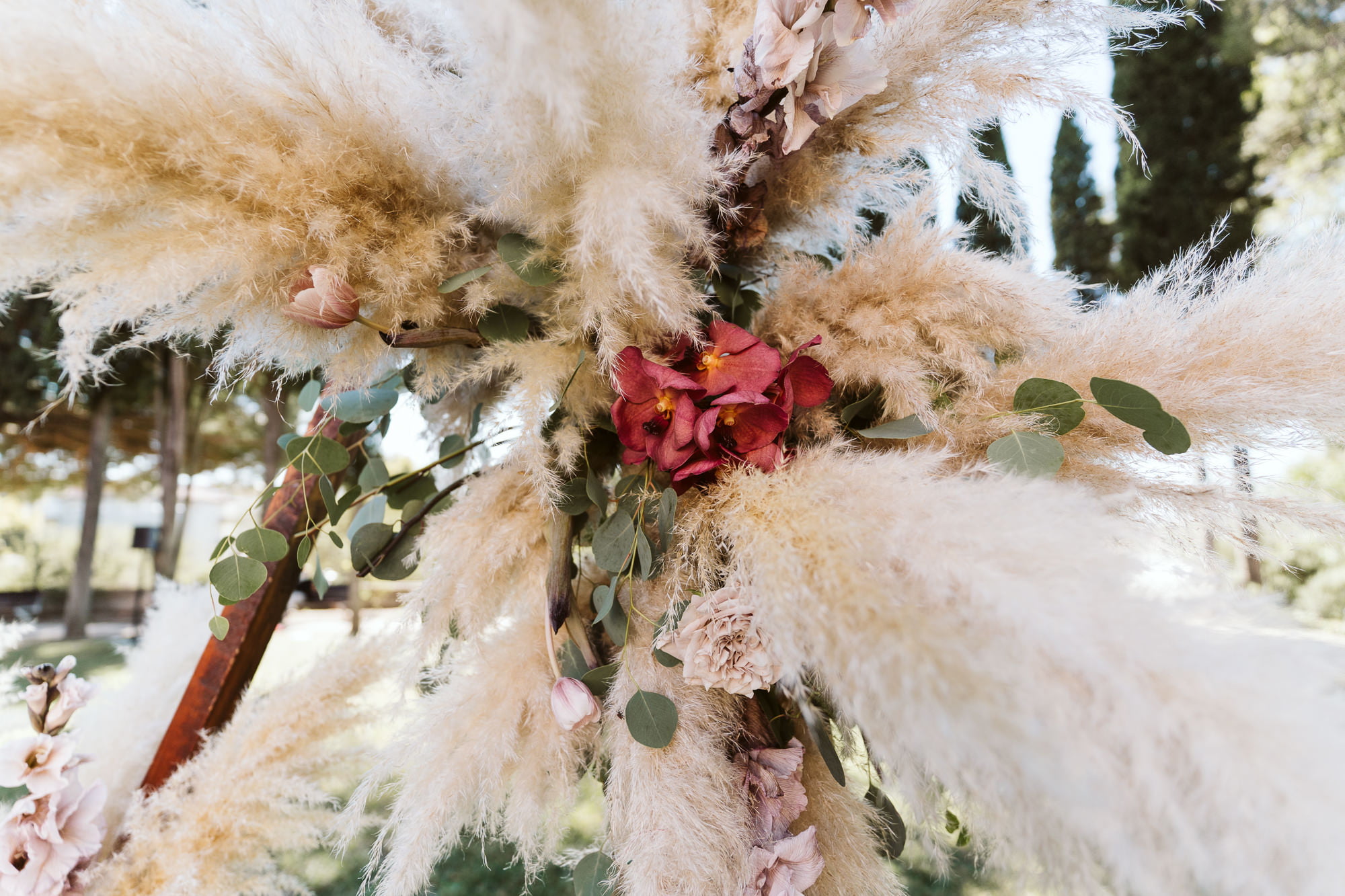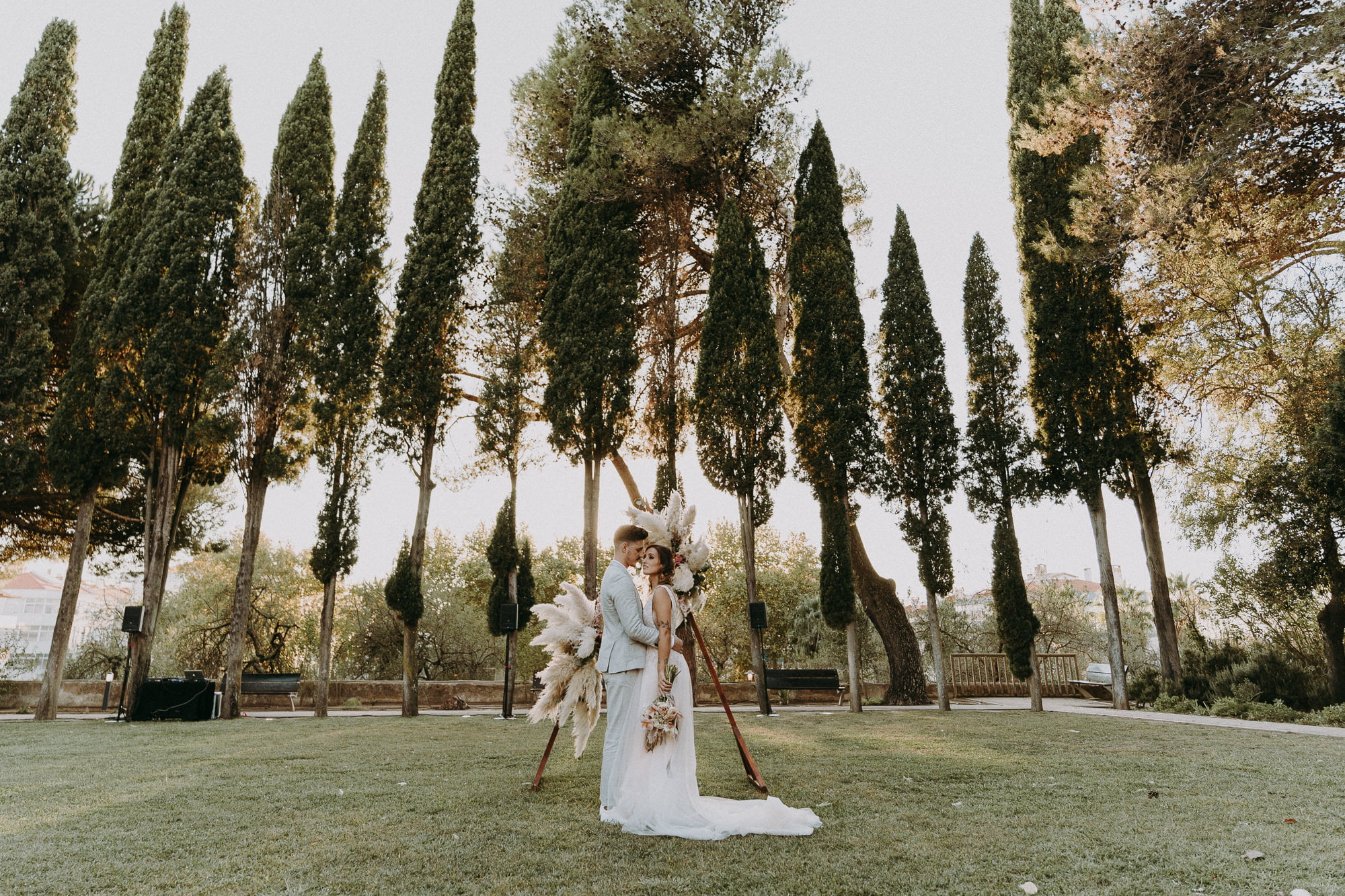 The “Boho” Contrast: While the palace is formal, the lush gardens and fountains allow for a “boho-chic” transition—exactly what Dóris achieved with pampas grass and colorful floral arches.