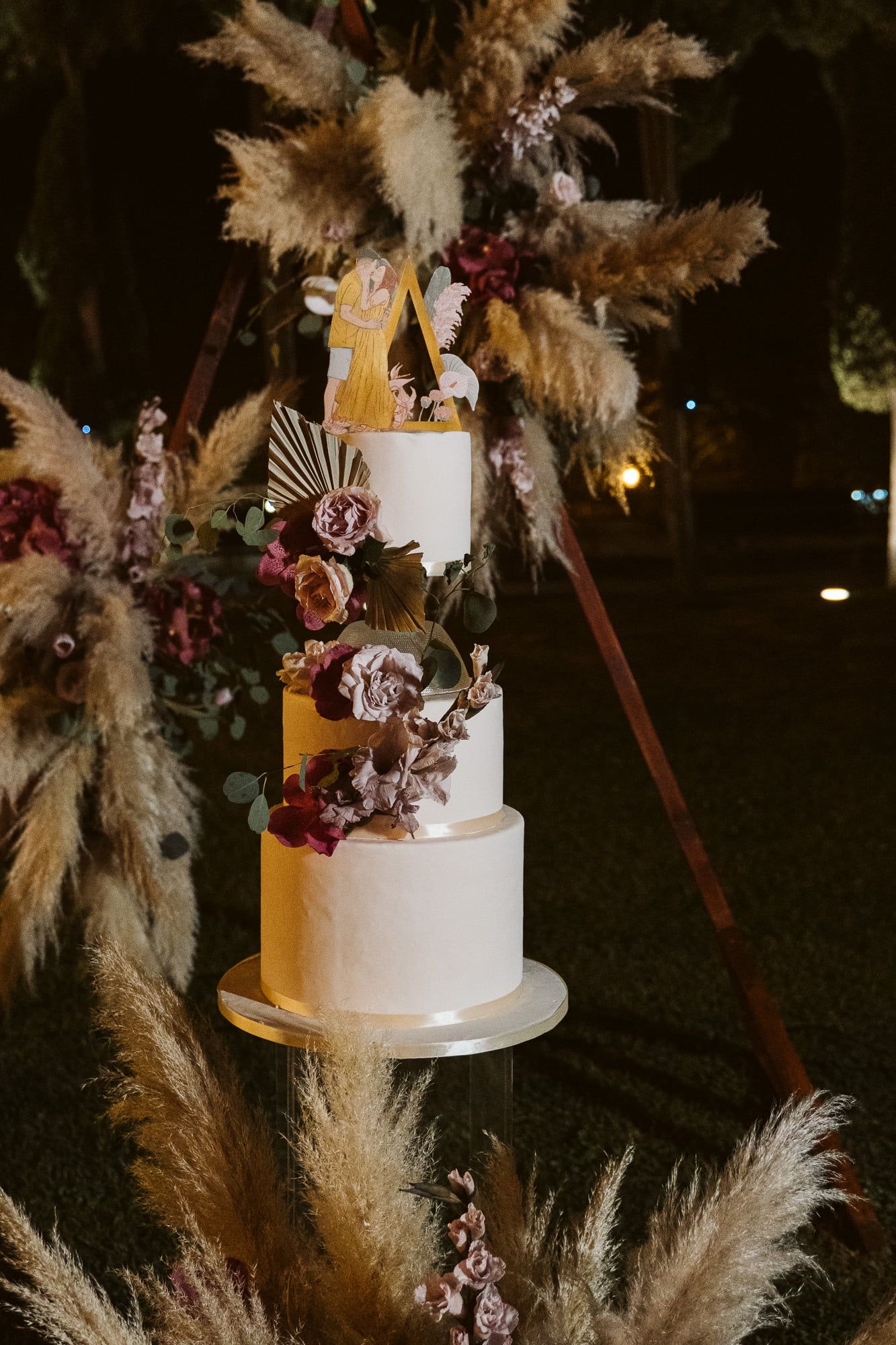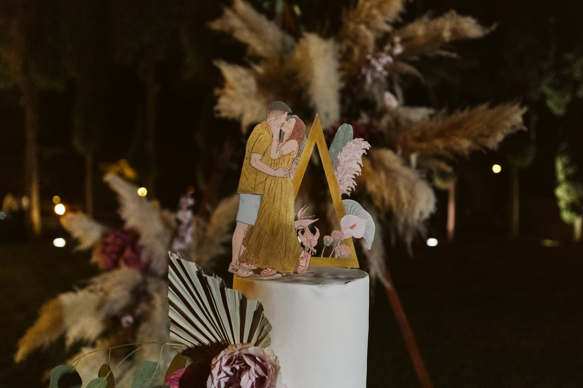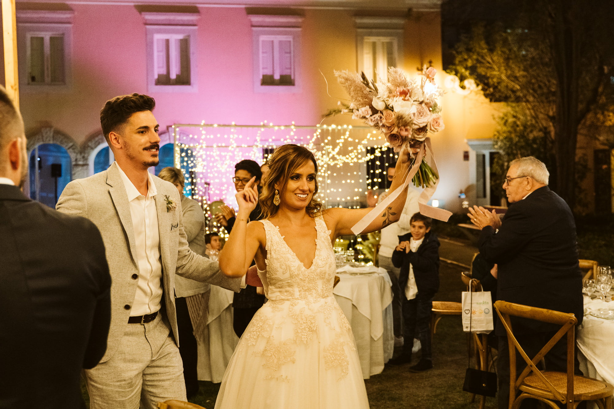 The “Boho” Contrast: While the palace is formal, the lush gardens and fountains allow for a “boho-chic” transition—exactly what Dóris achieved with pampas grass and colorful floral arches.