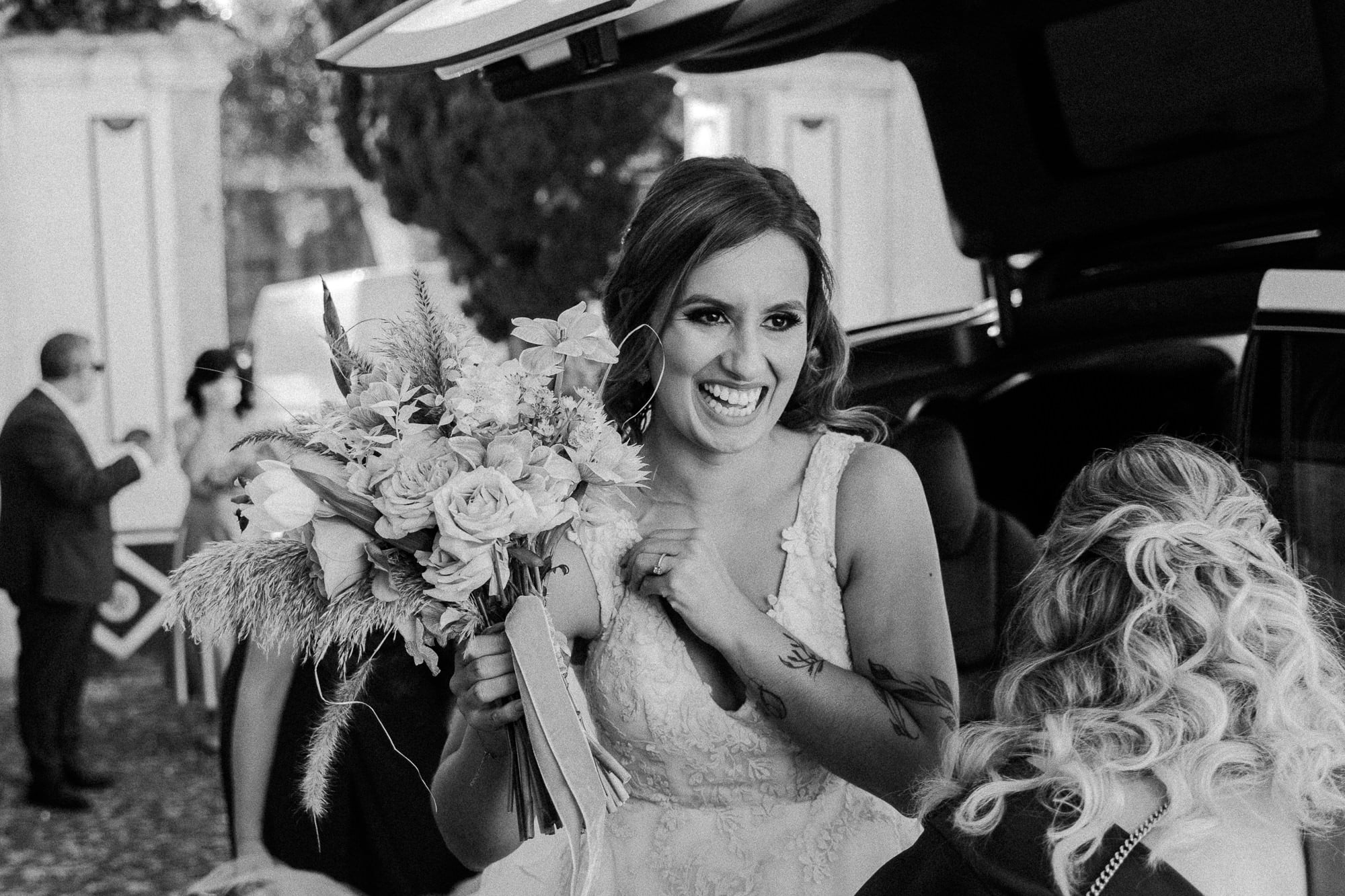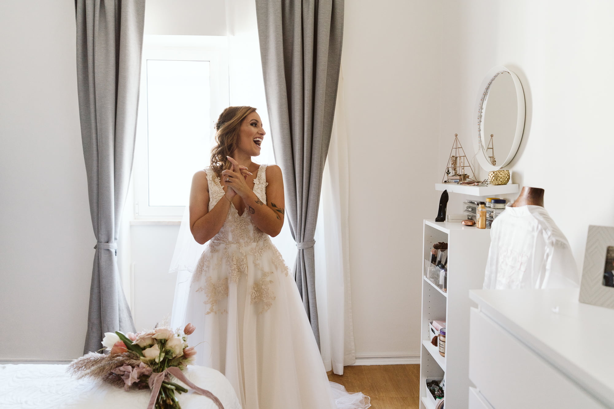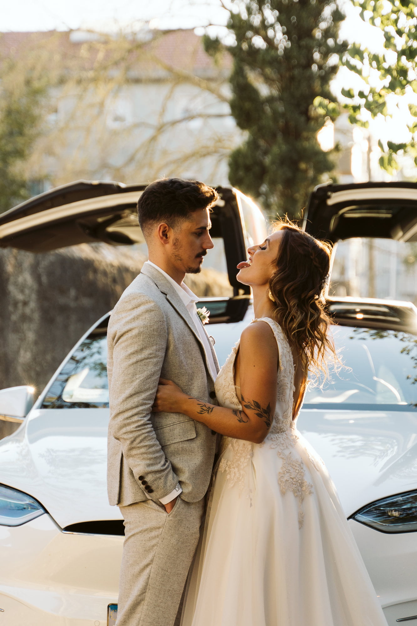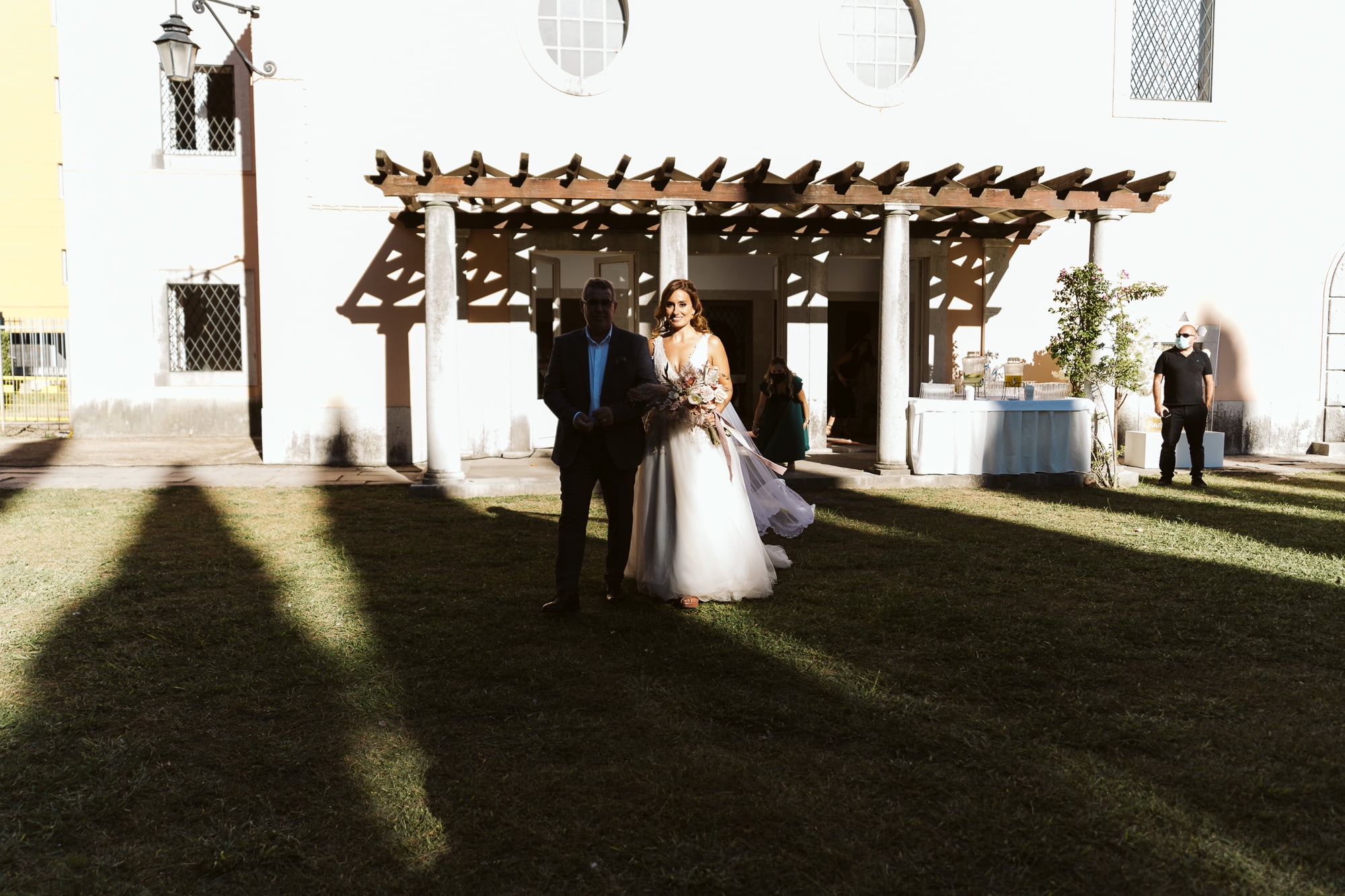 The day began in the center of Lisbon. Dóris and Diogo opted for preparations in their own stylish homes, grounding the start of their story in a place that truly felt like them. Dóris leaned into a flowy, ethereal boho aesthetic, while Diogo kept it modern and relaxed in a sharp grey suit without a tie—the perfect look for a warm Portuguese celebration.