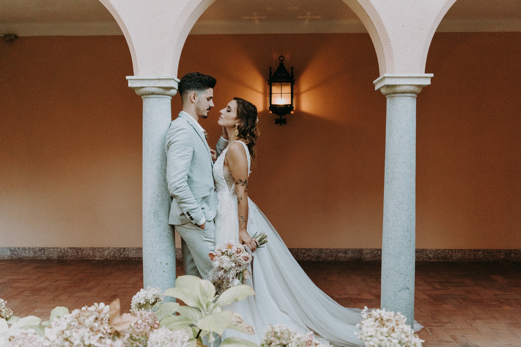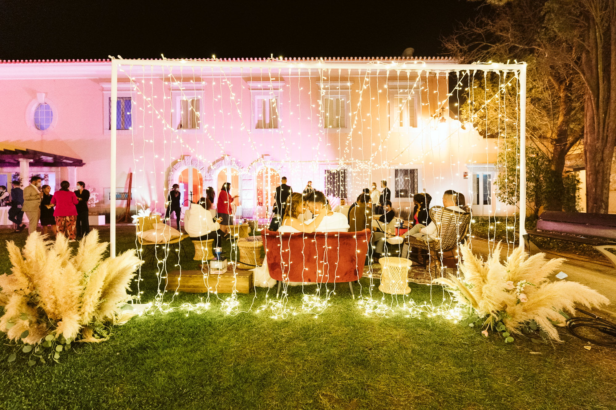 As seen in Dóris and Diogo’s wedding, you can use the lush gardens for your ceremony and decorate with natural elements like pampas grass and colorful floral arches to soften the palace’s formal architecture.