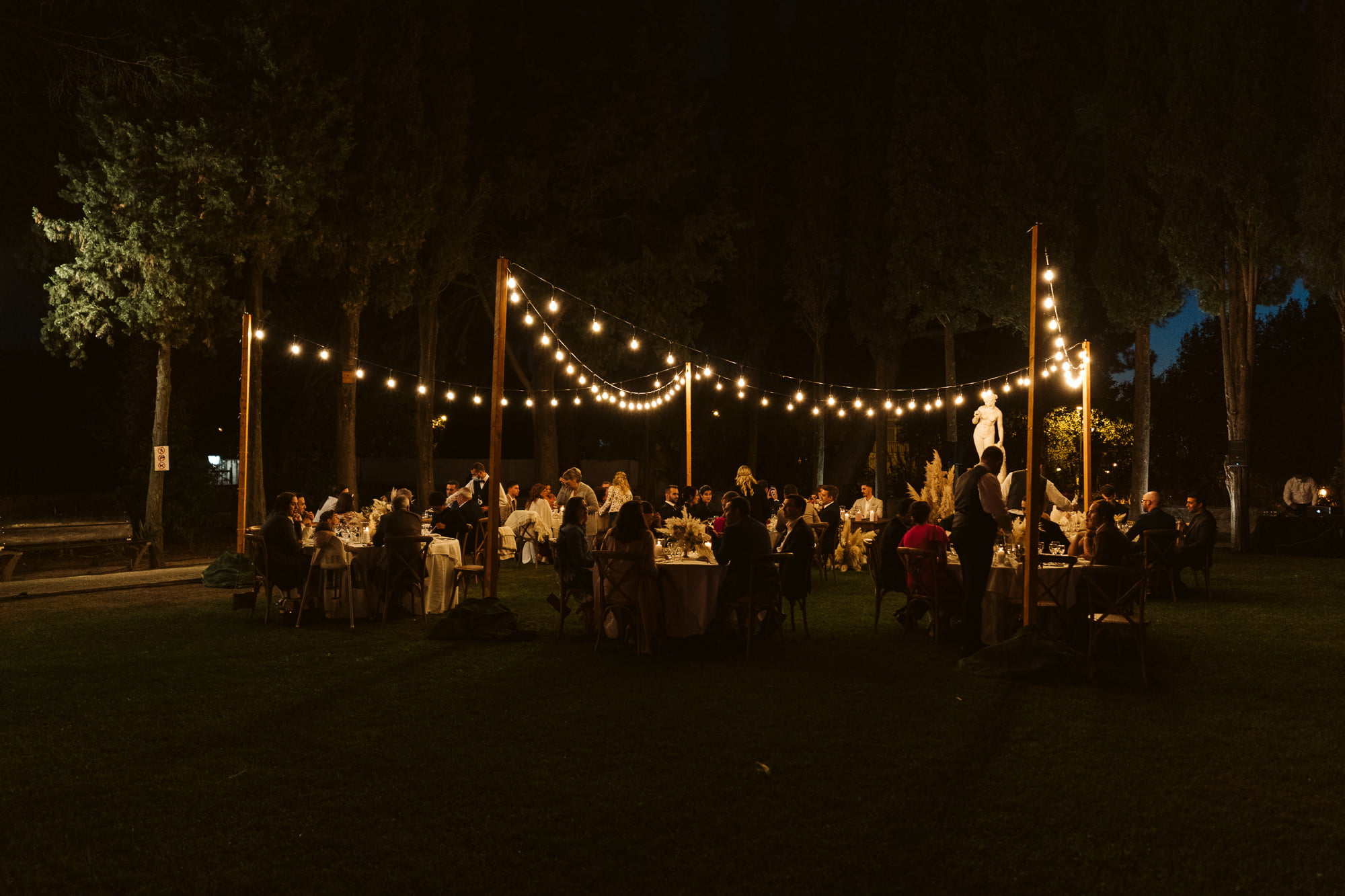 Hosting an outdoor dinner with camp lights creates a cozy, magical atmosphere. You can also set up unique features like a shisha bar with colorful cushions to provide a relaxed social space for guests.
