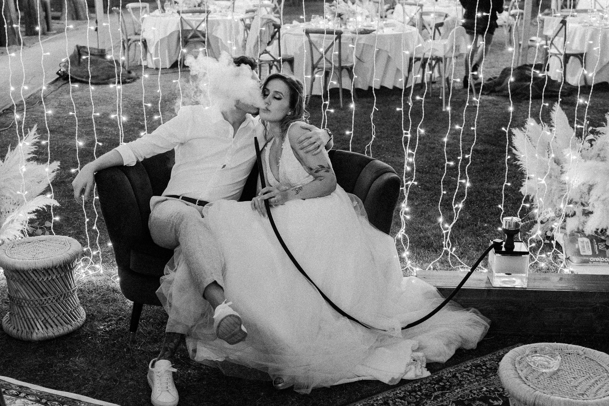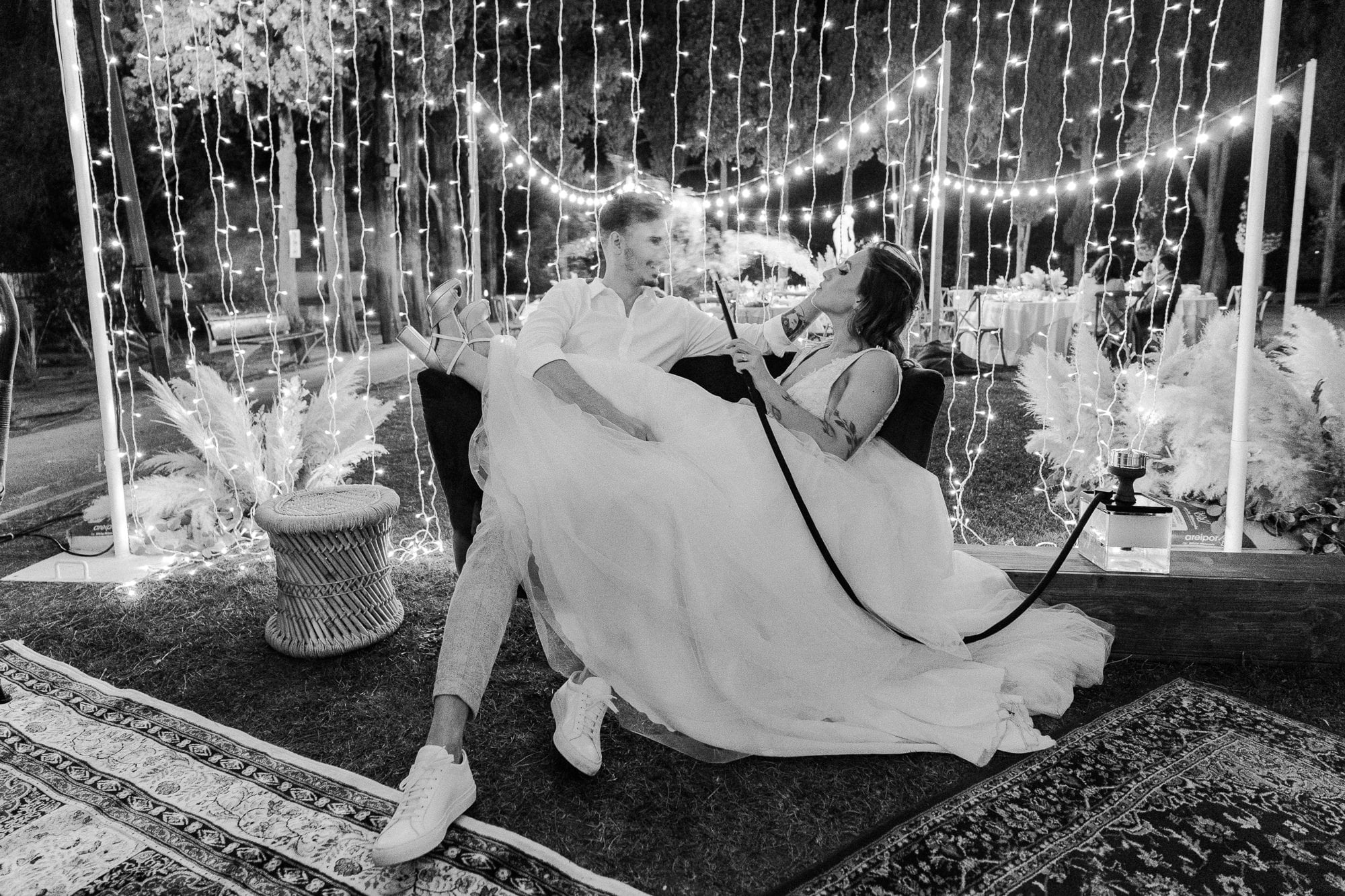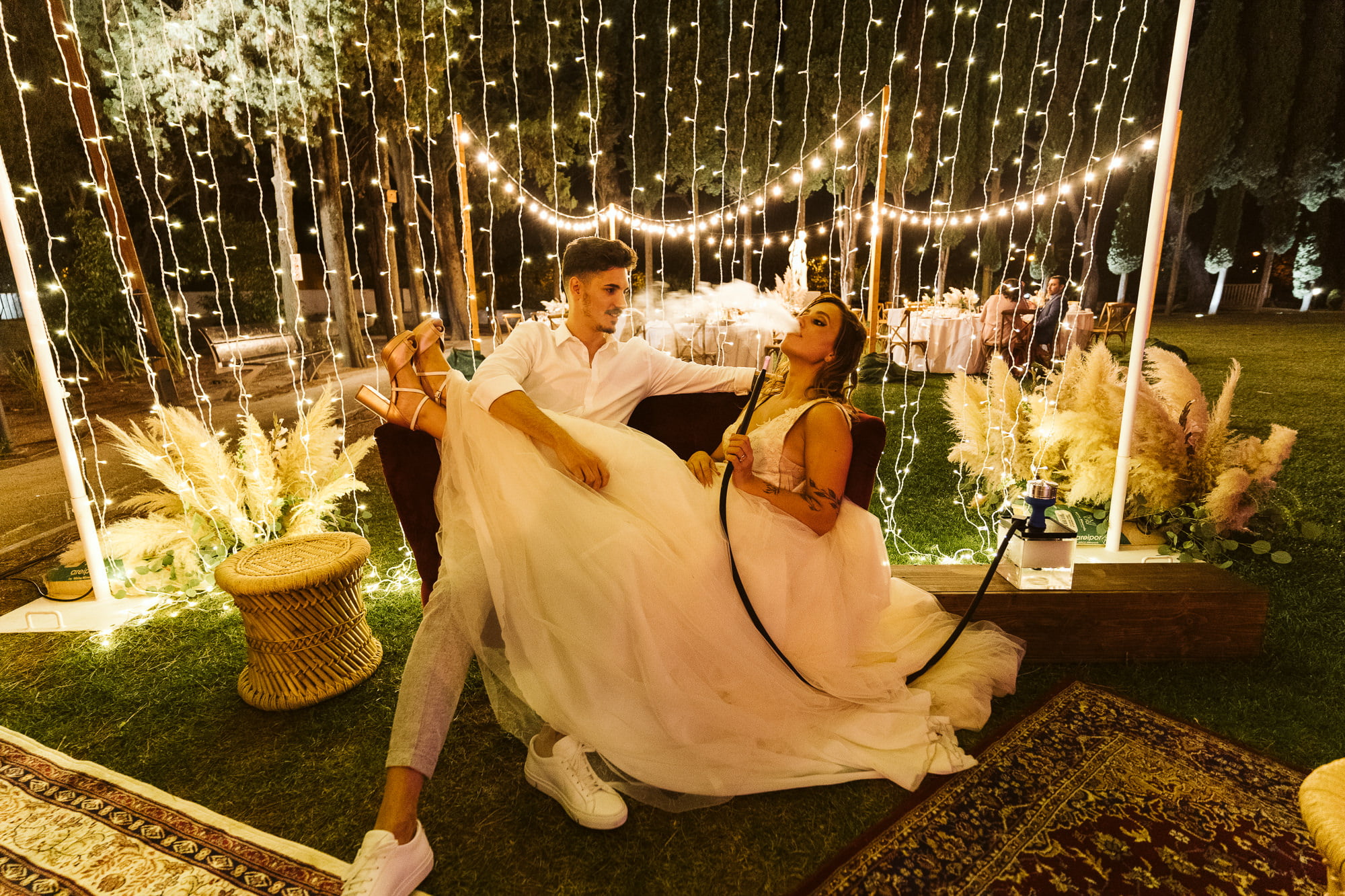 The reception was a sensory experience. Dinner was held outdoors, illuminated by stylish camp lights that kept the boho atmosphere alive under the stars. The highlight? A dedicated shisha bar area with low tables and colorful cushions that turned the garden into a mystical lounge.