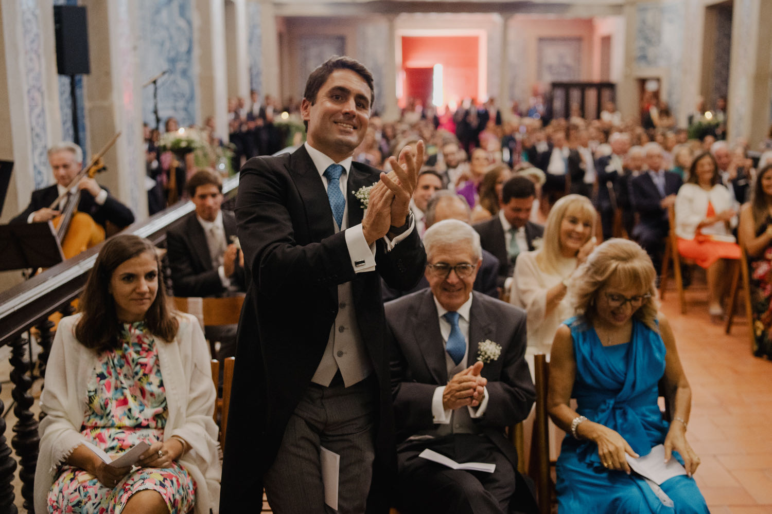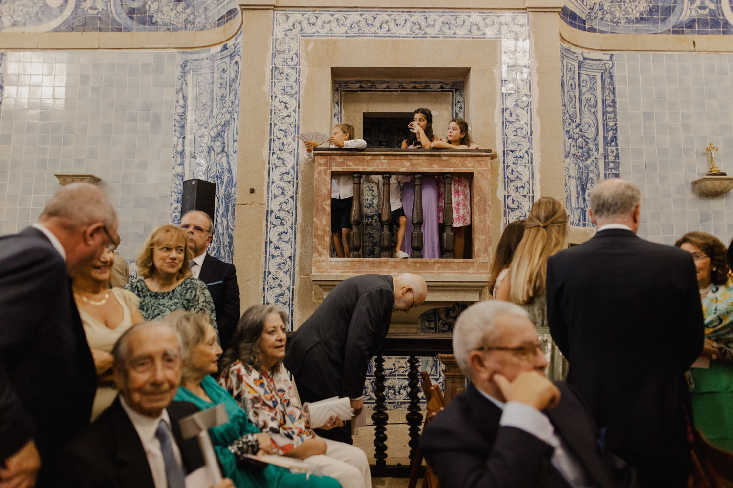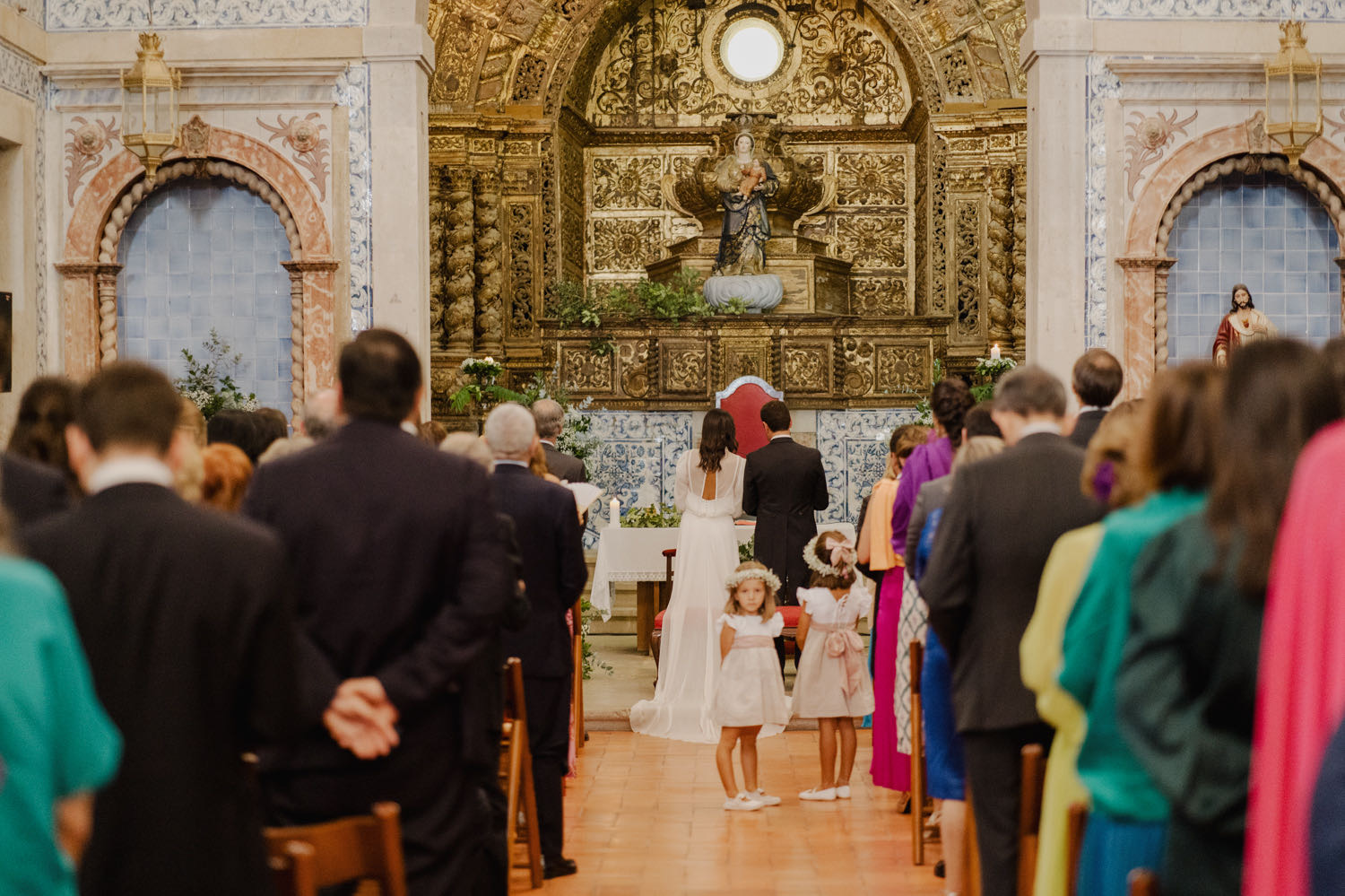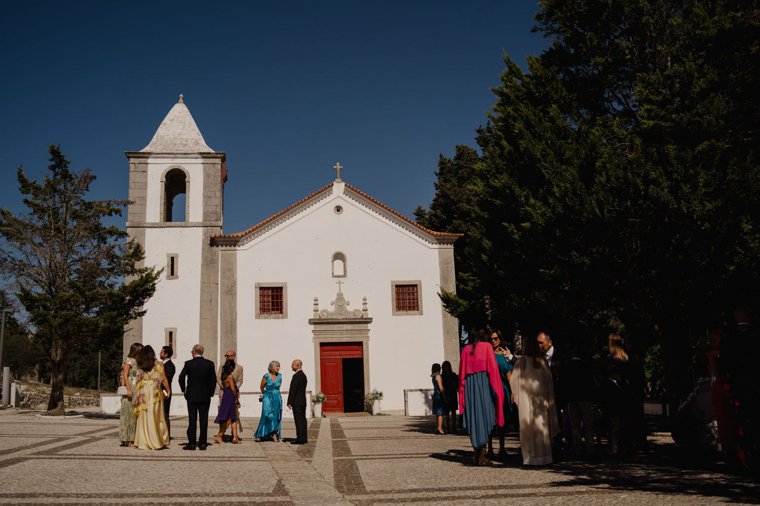 The ceremony was held at the Church of Sesimbra Castle (Castelo de Sesimbra). Perched high above the Atlantic, the setting is breathtaking. To do it justice, we utilized drone photography to capture the scale of the castle walls against the coastline. Inside, an orchestra filled the stone halls with a captivating musical atmosphere that made the “I dos” feel truly cinematic.