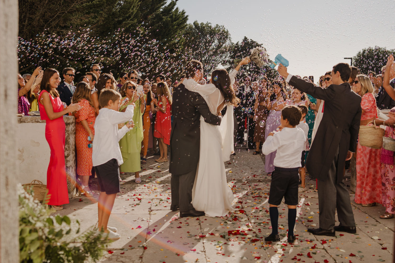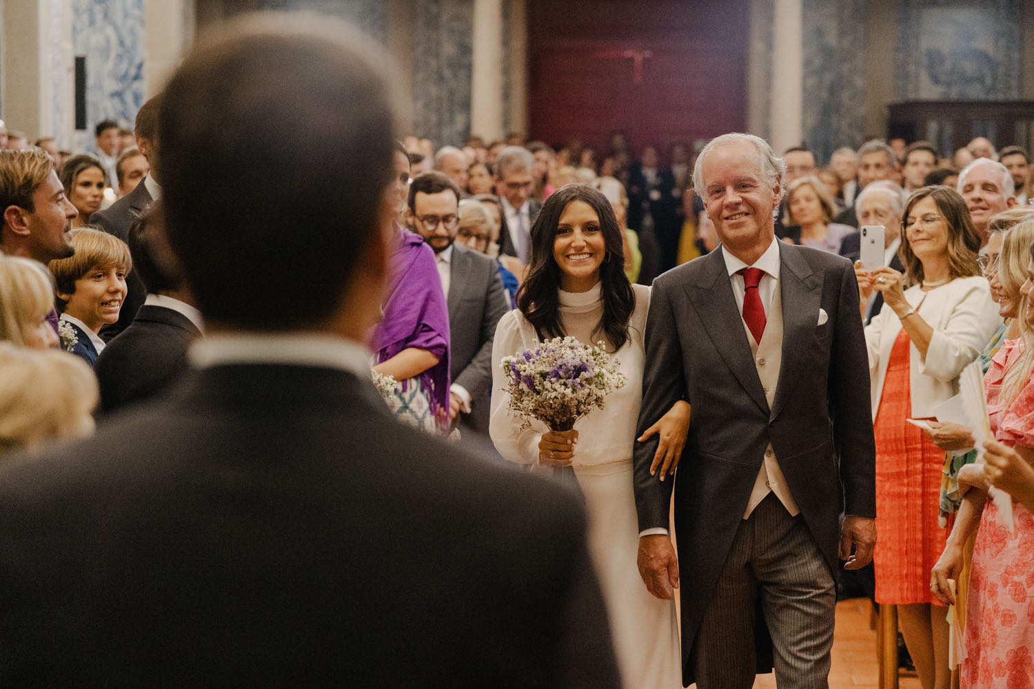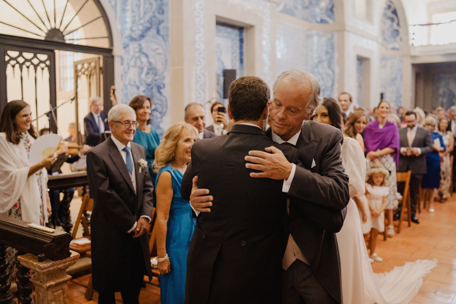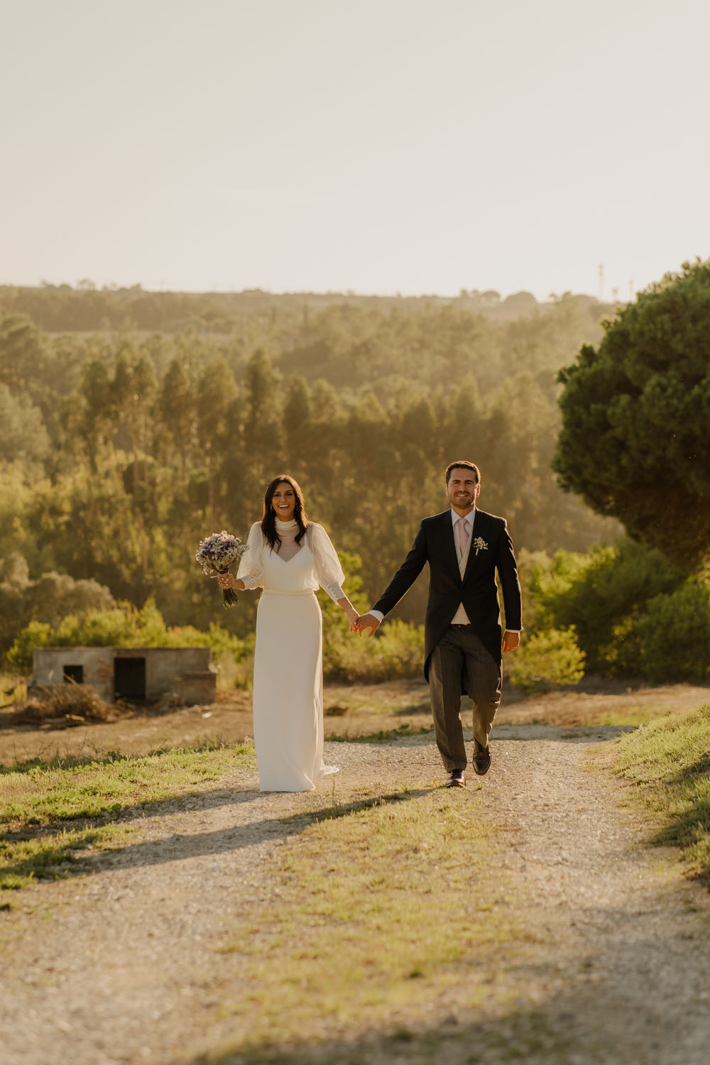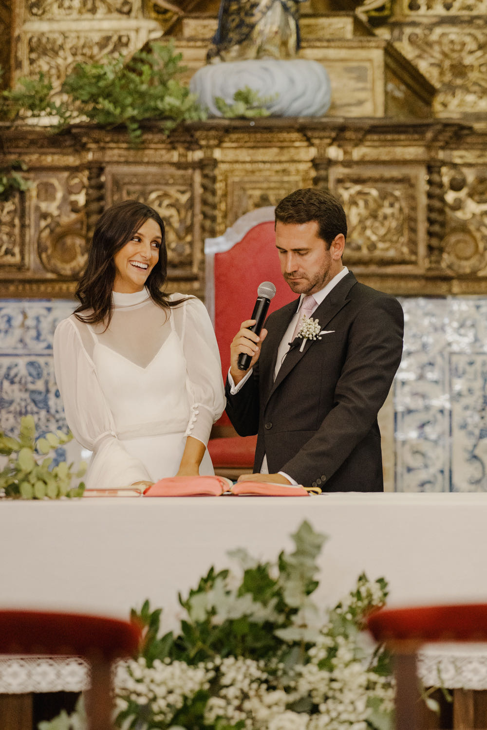 The ceremony was held at the Church of Sesimbra Castle (Castelo de Sesimbra). Perched high above the Atlantic, the setting is breathtaking. To do it justice, we utilized drone photography to capture the scale of the castle walls against the coastline. Inside, an orchestra filled the stone halls with a captivating musical atmosphere that made the “I dos” feel truly cinematic.