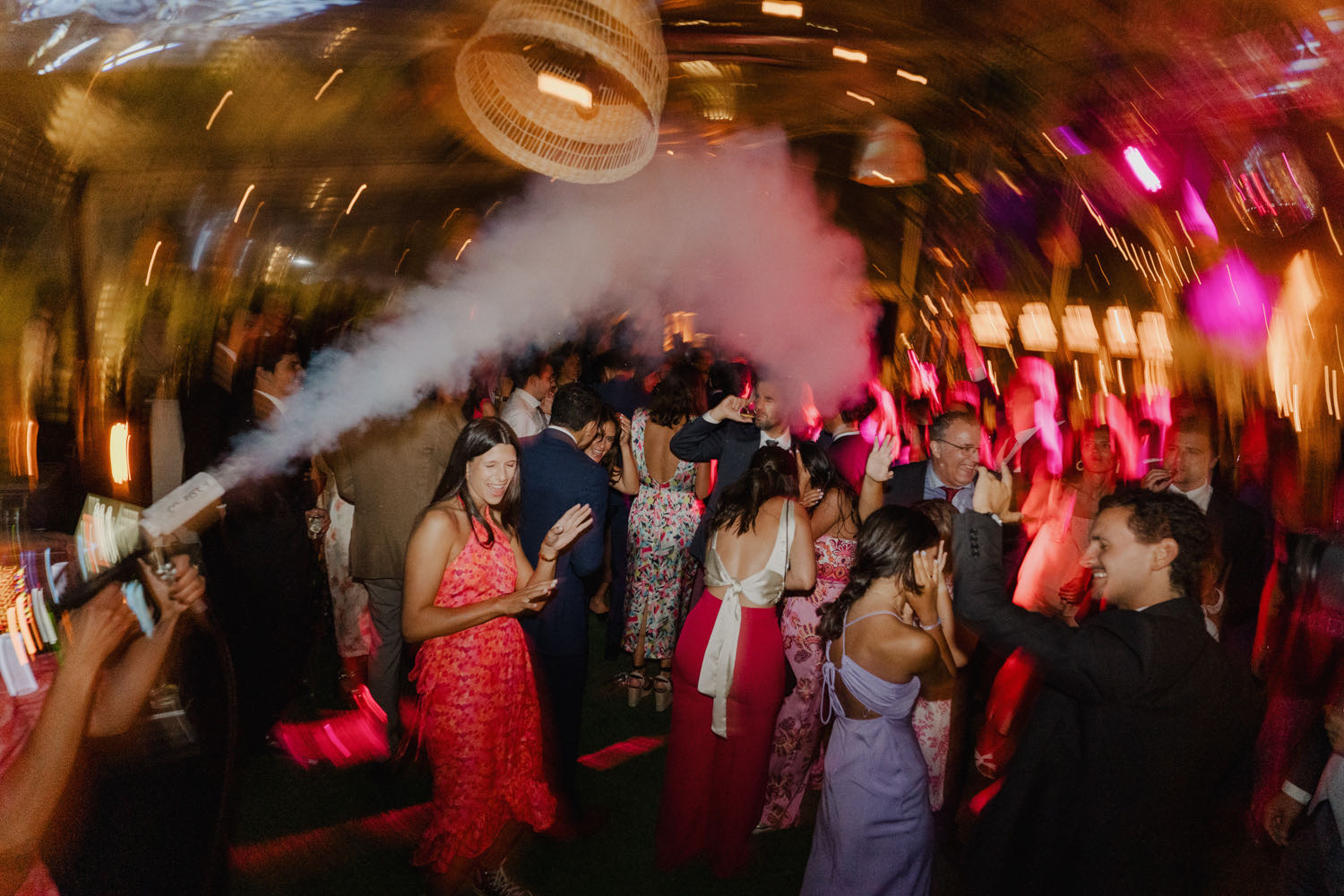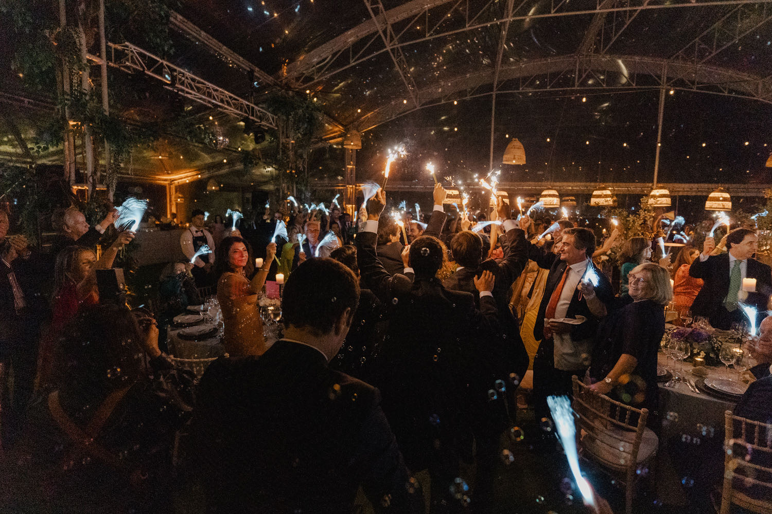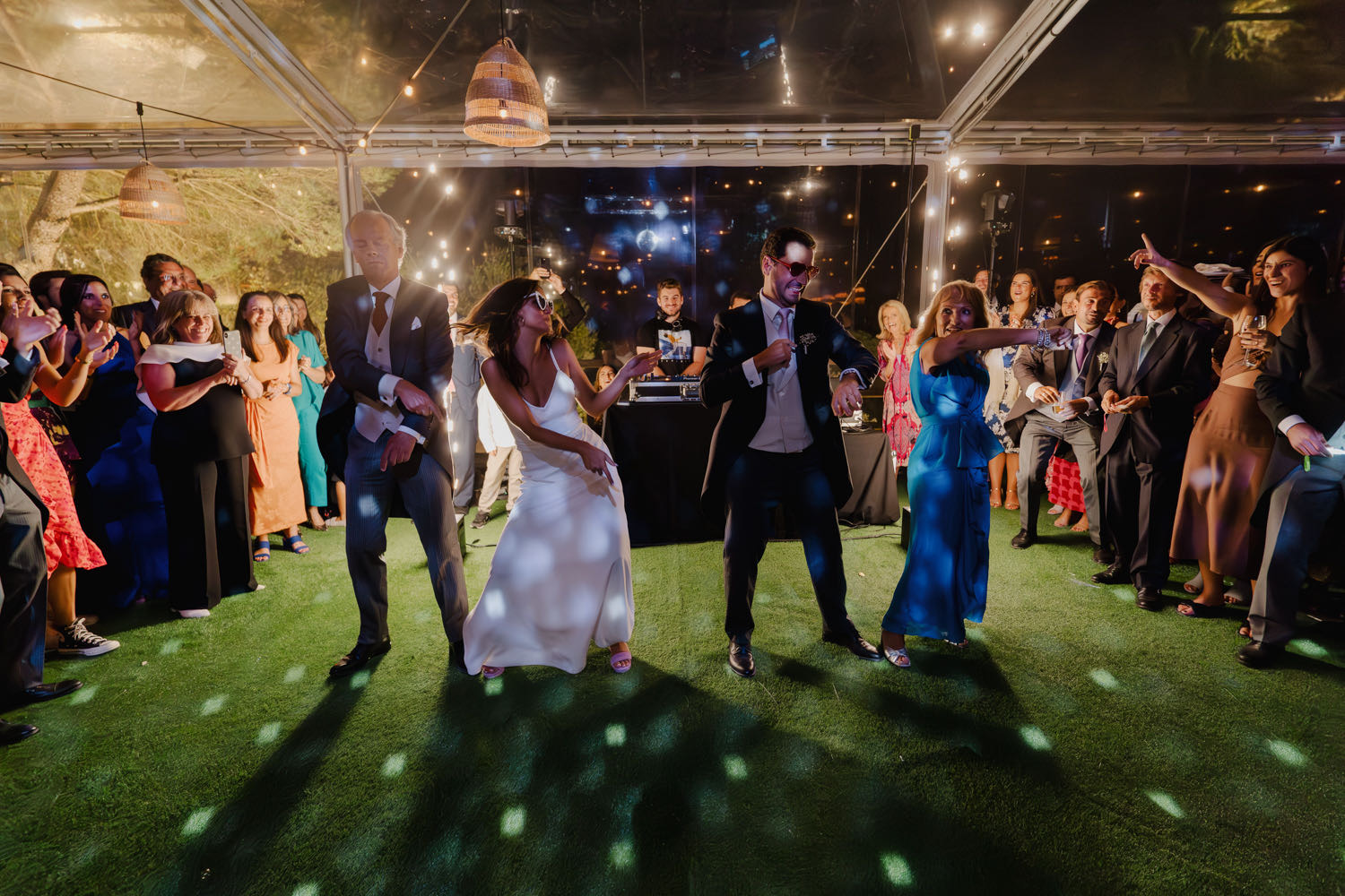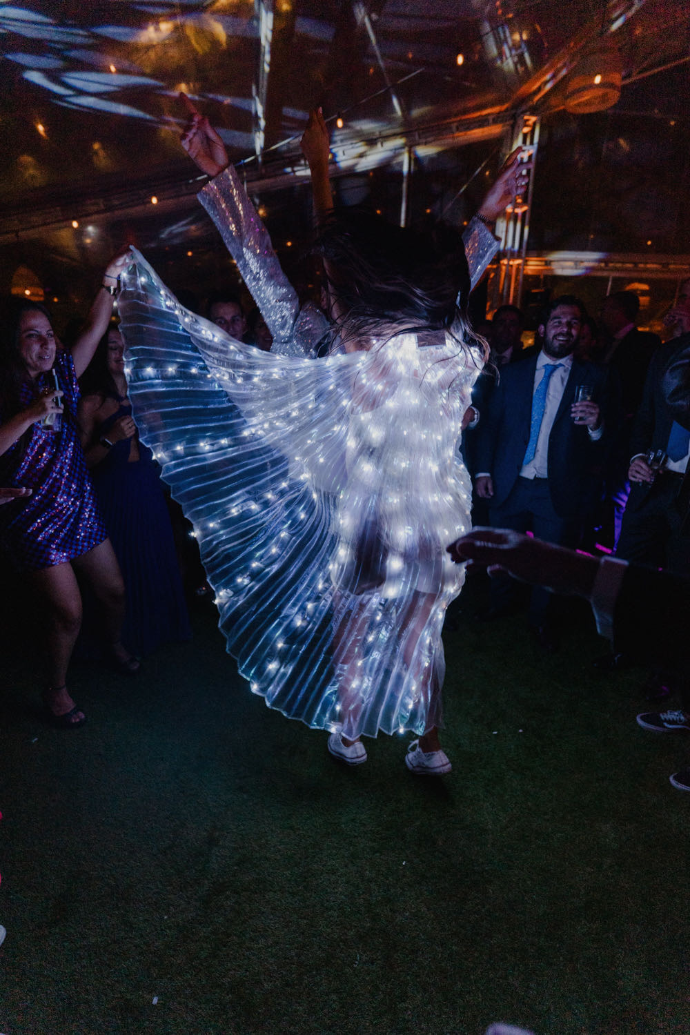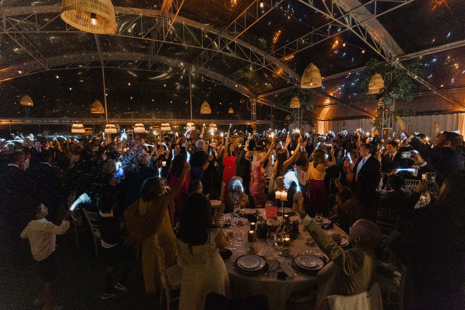 The transition to dinner was legendary. The couple led a parade of 30 guests into the tent, cutting through the darkness with a sea of LED lights. It was high-energy, high-impact, and totally unique.