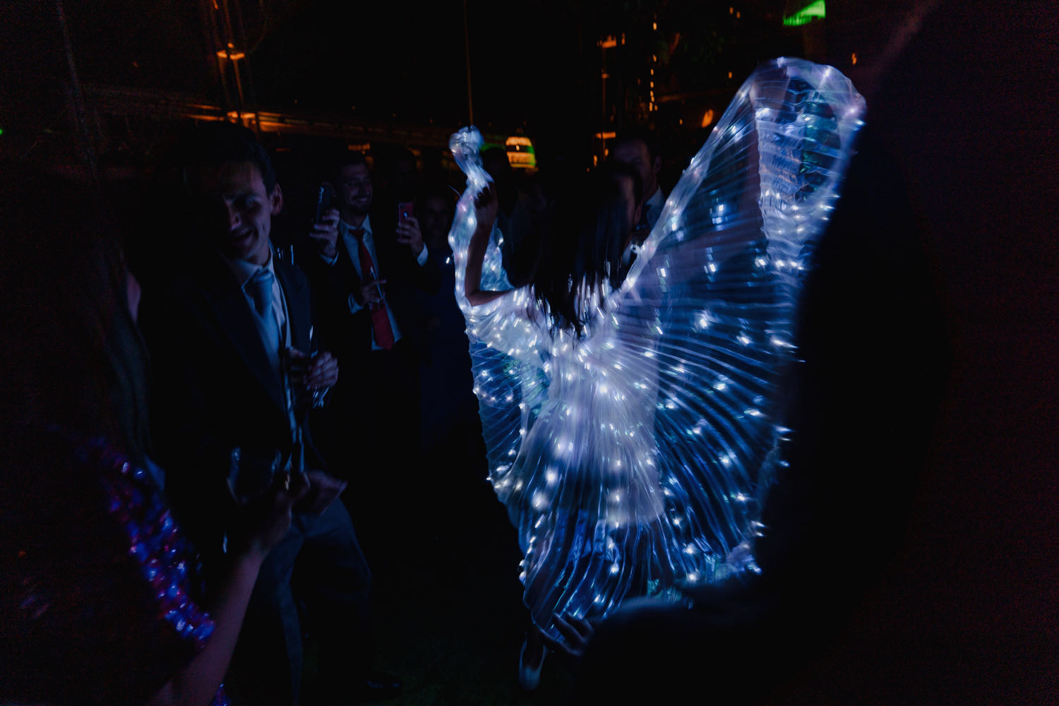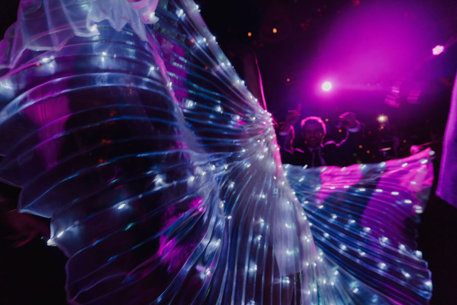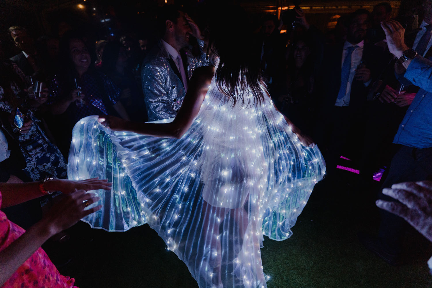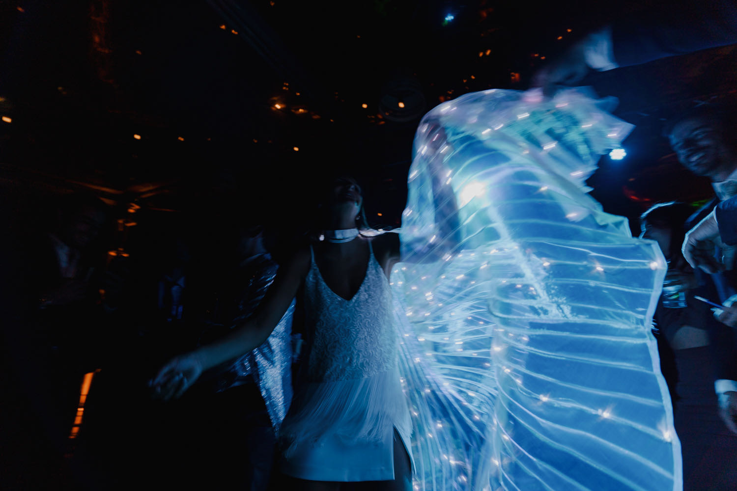 But the showstopper? The bride’s party look. During the peak of the celebration, she donned a cape adorned with blue LED lights.