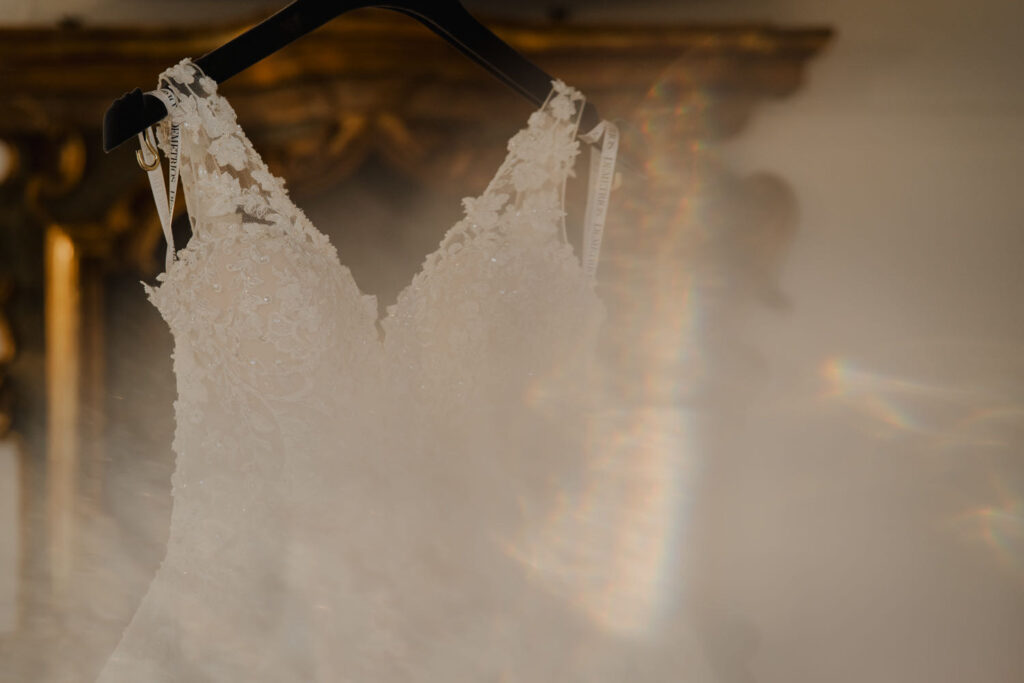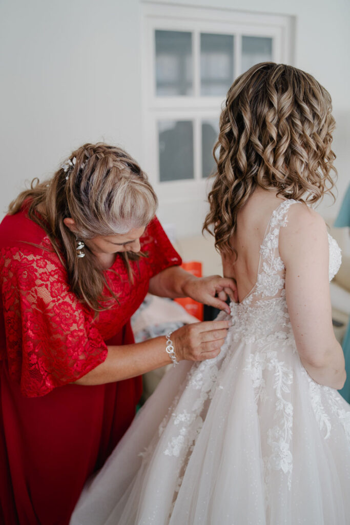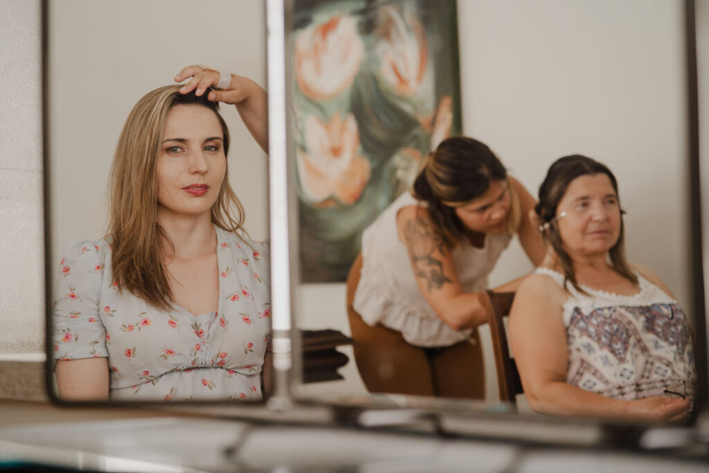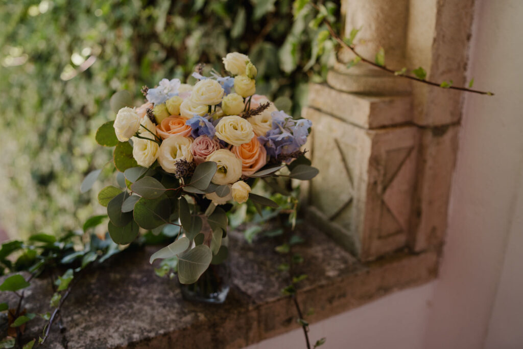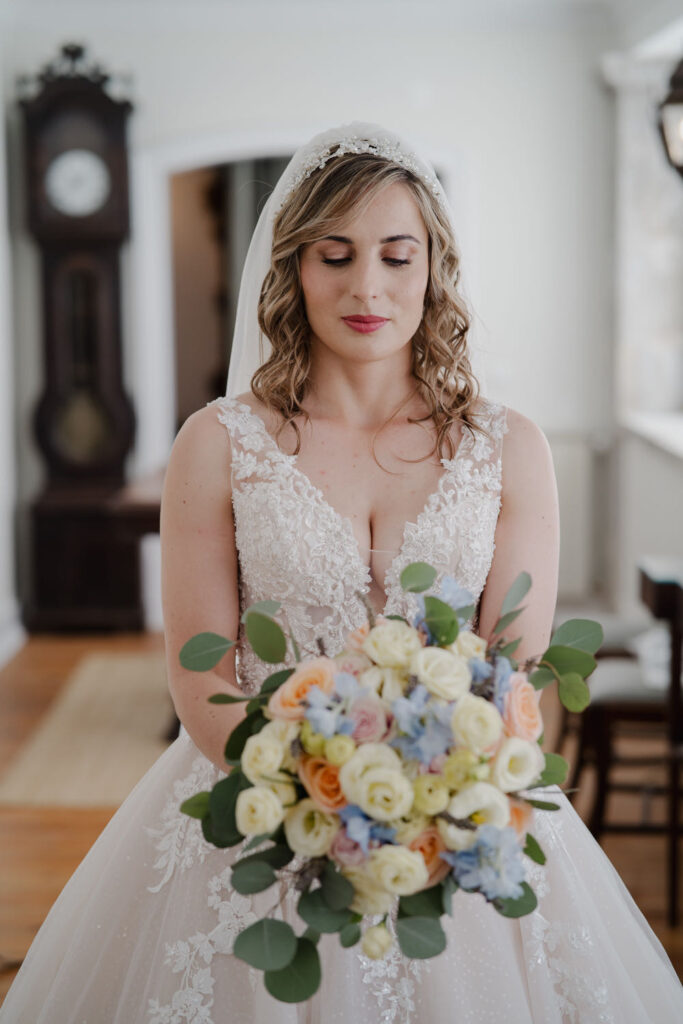 The groom, shy as can be, chose not to be photographed while getting dressed, so all the attention was on the bride, who was getting ready in one of the charming rooms at the estate. The space was simply stunning, with lush greenery creeping up the walls, a super colorful bouquet, and a strategic mirror that allowed me to capture unique moments as makeup and hair were being done. It was definitely a dreamy setting to photograph!