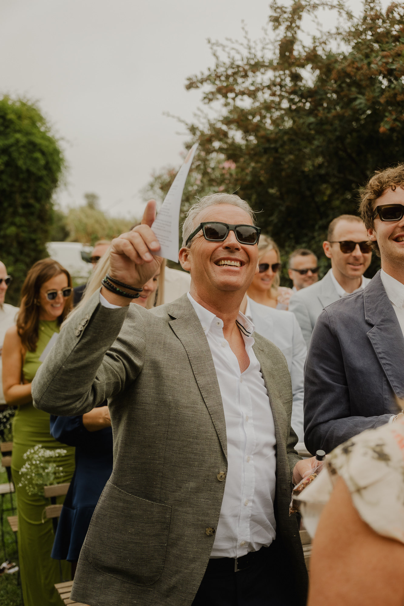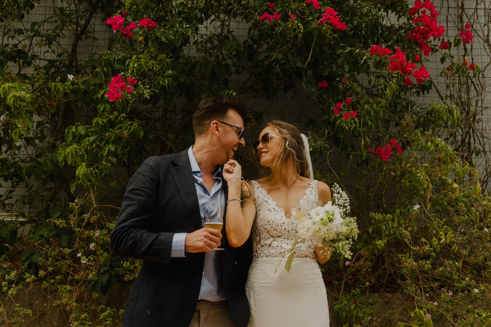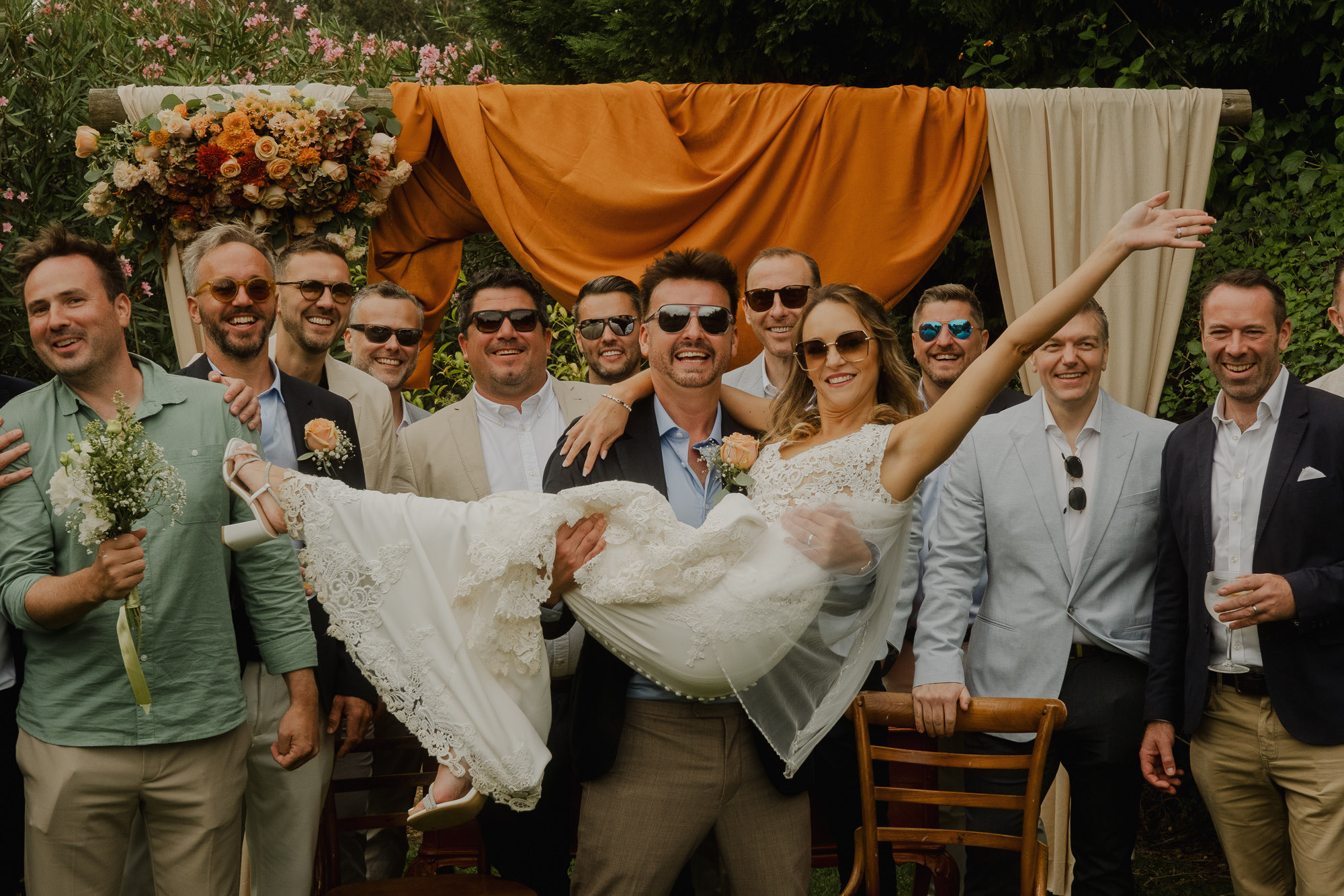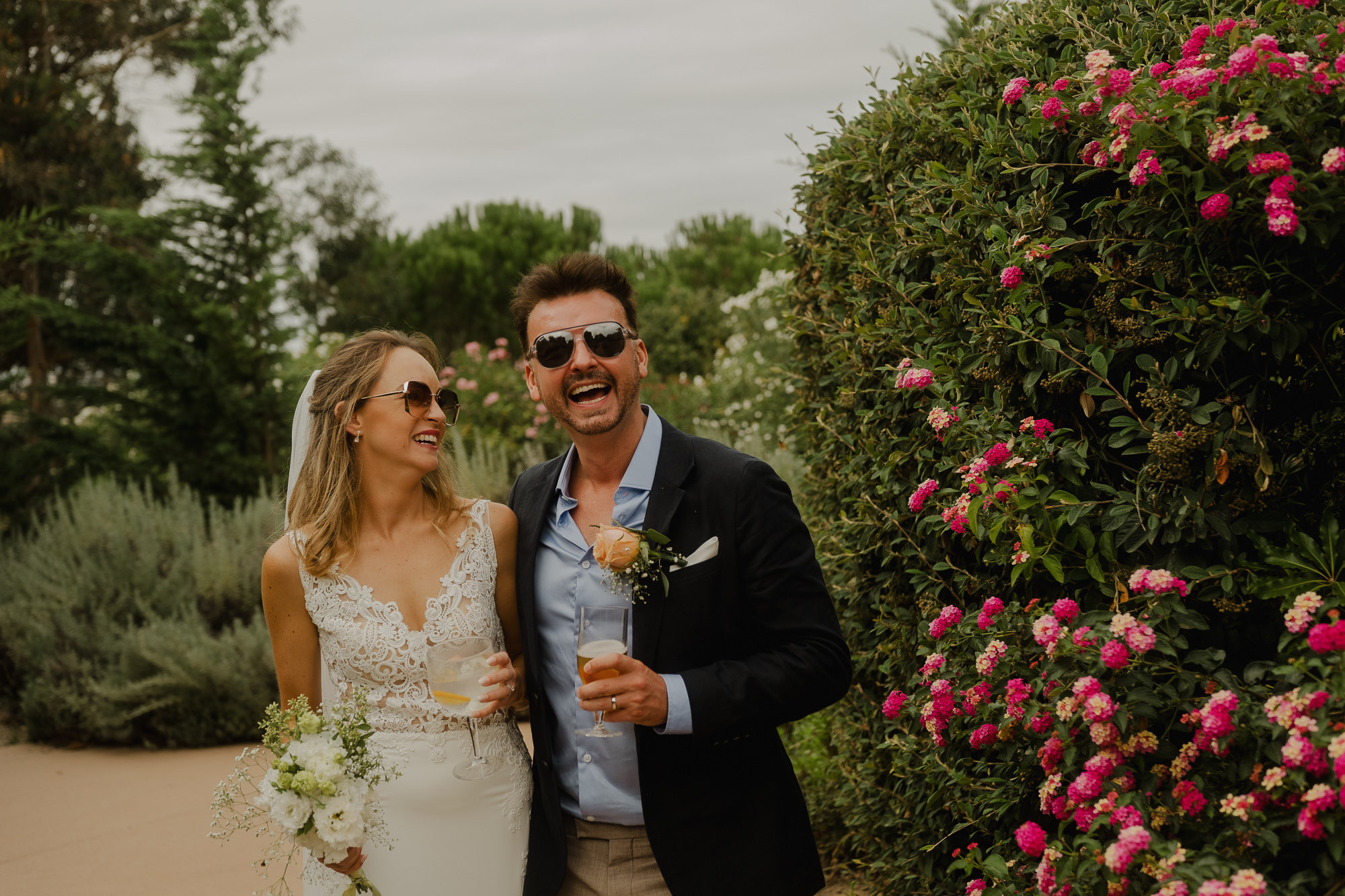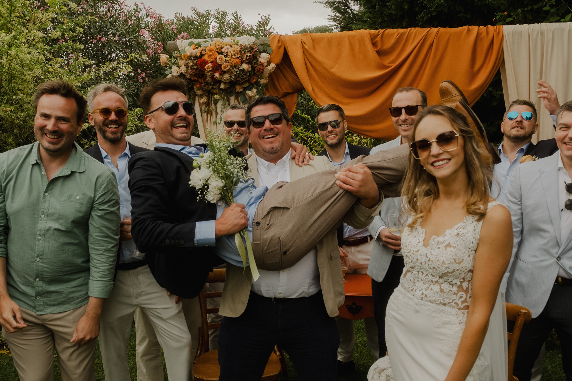 Nothing about this wedding followed a script — and that was the point. Preparations were unhurried, portraits happened quickly and naturally, and the ceremony embraced humour and surprise. Sunglasses, drinks in hand, songs sung by everyone present — moments were lived fully instead of being managed.