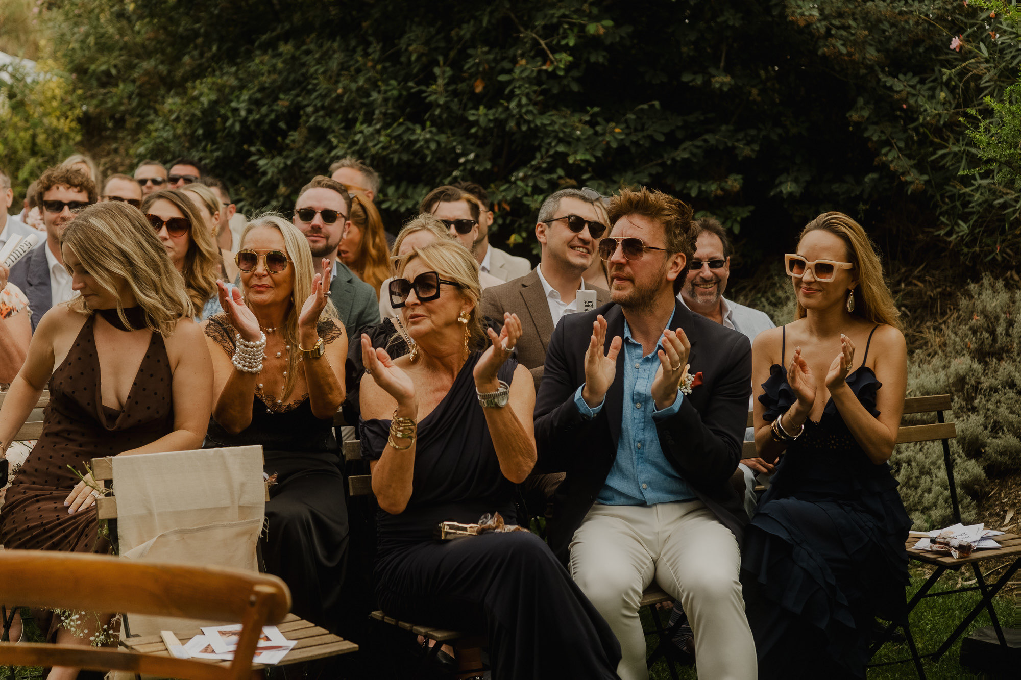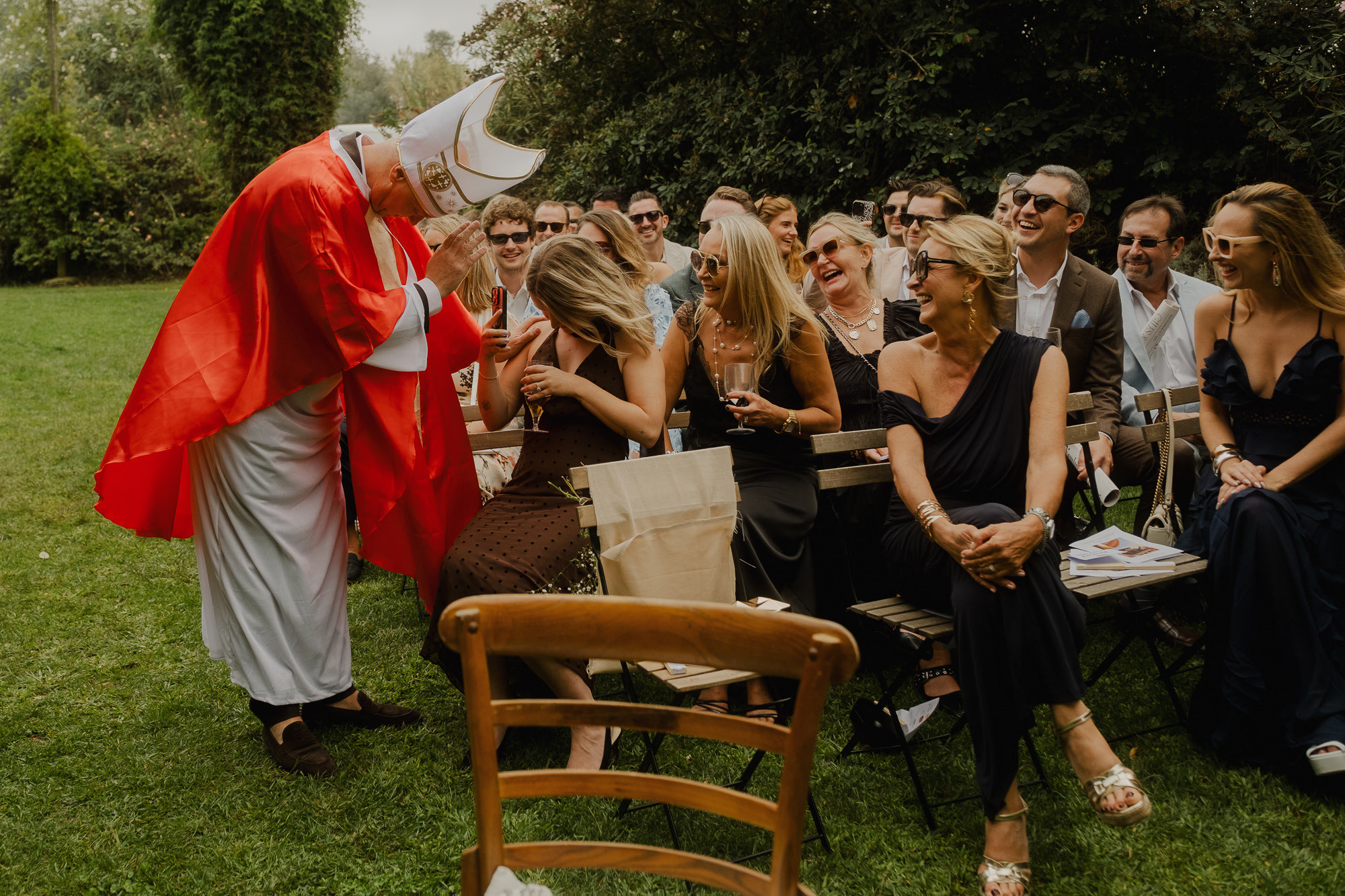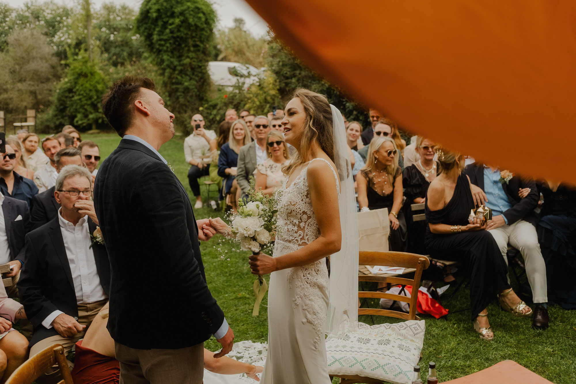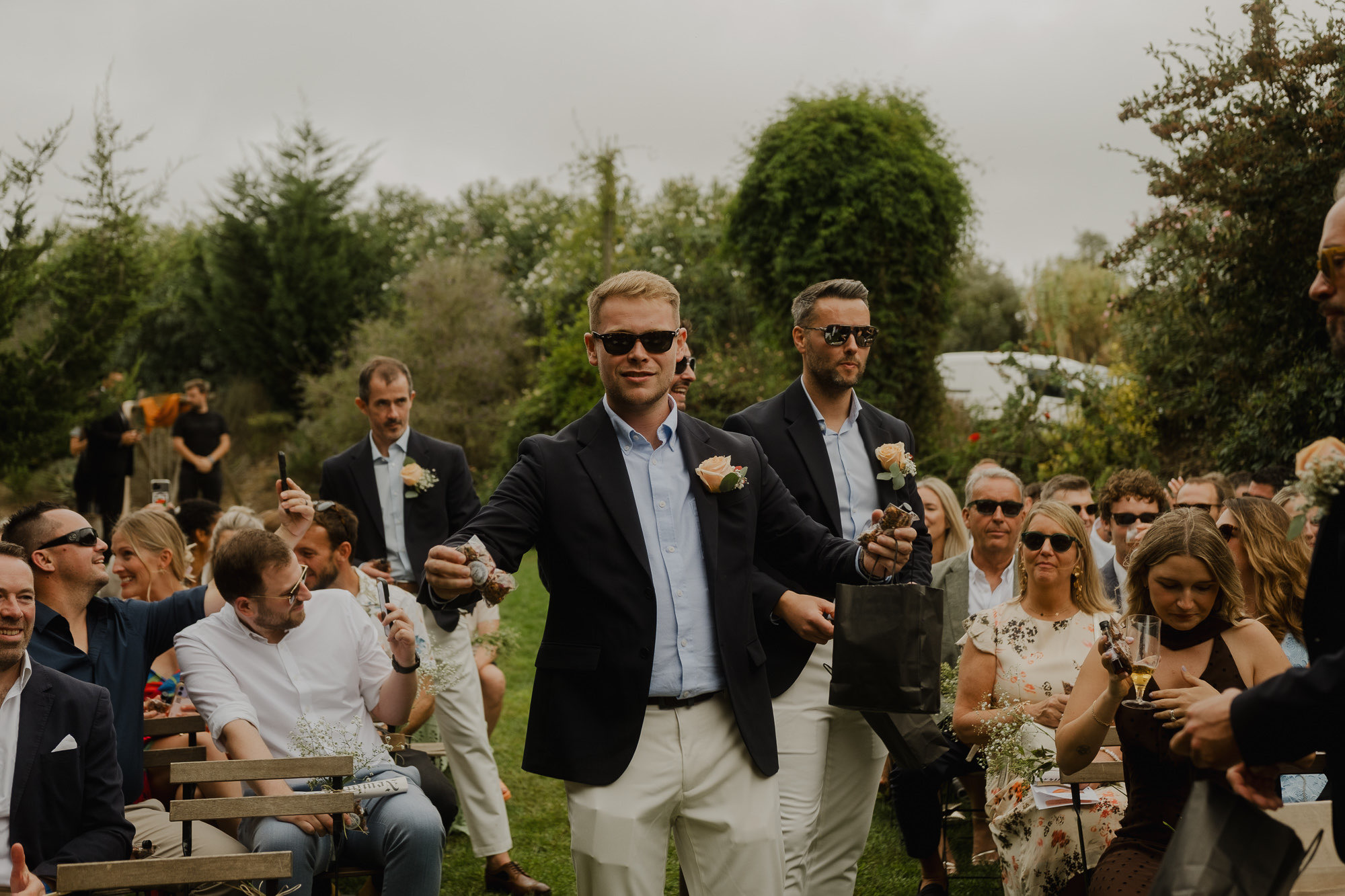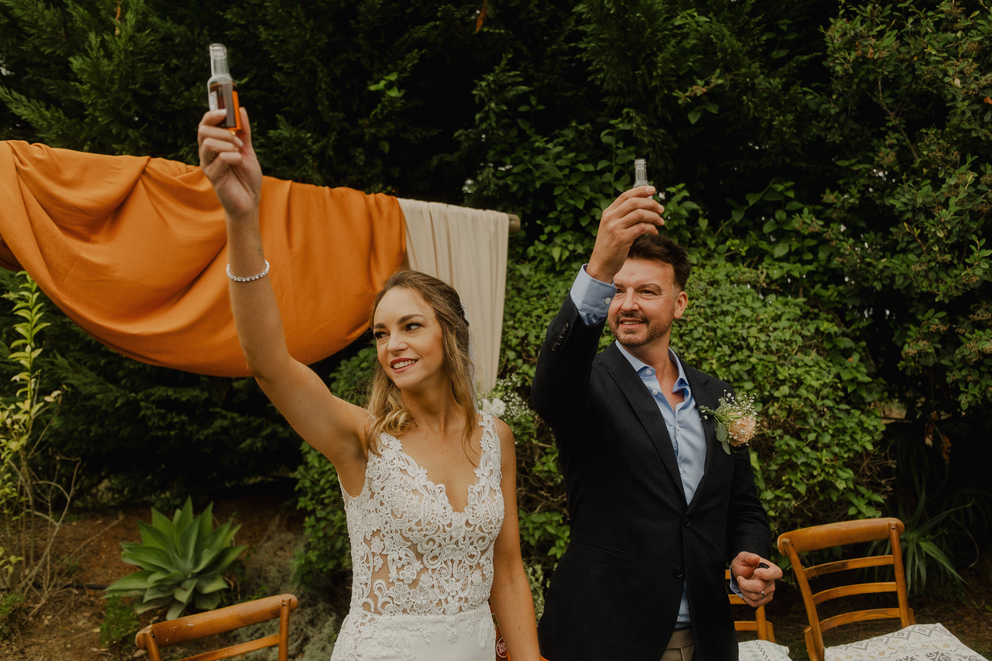 Nothing about this wedding followed a script — and that was the point. Preparations were unhurried, portraits happened quickly and naturally, and the ceremony embraced humour and surprise. Sunglasses, drinks in hand, songs sung by everyone present — moments were lived fully instead of being managed.