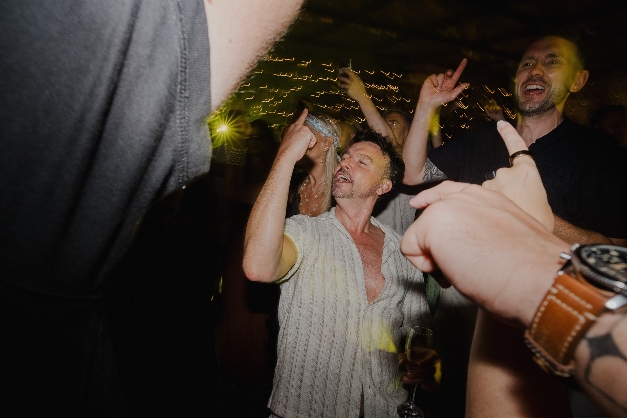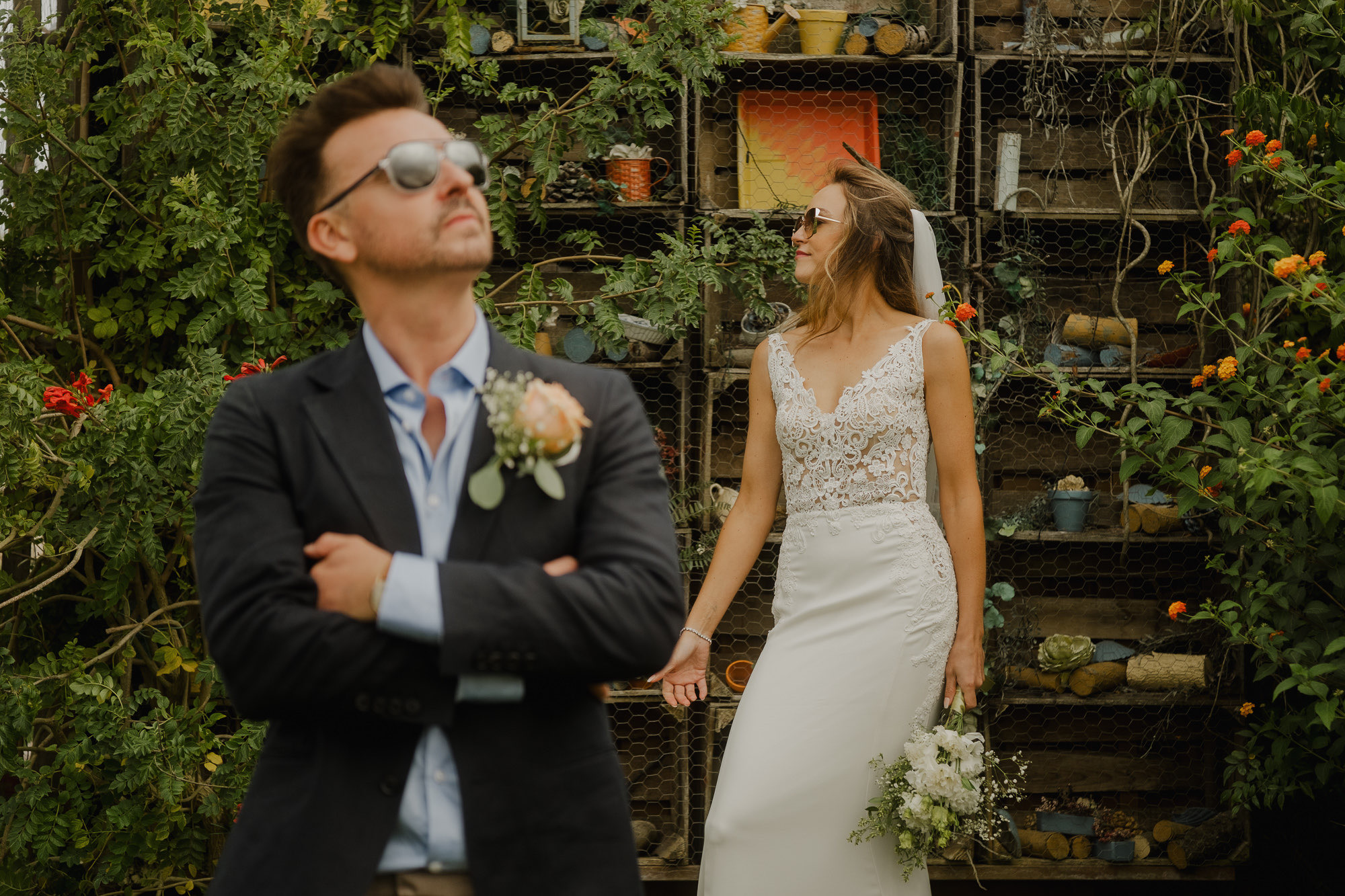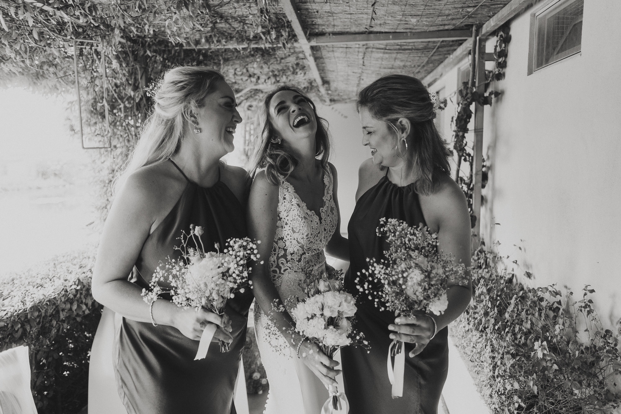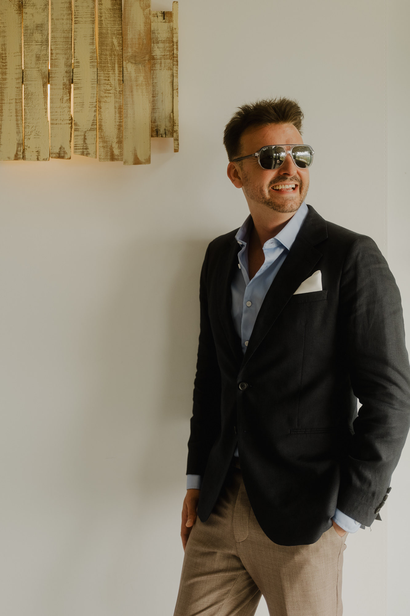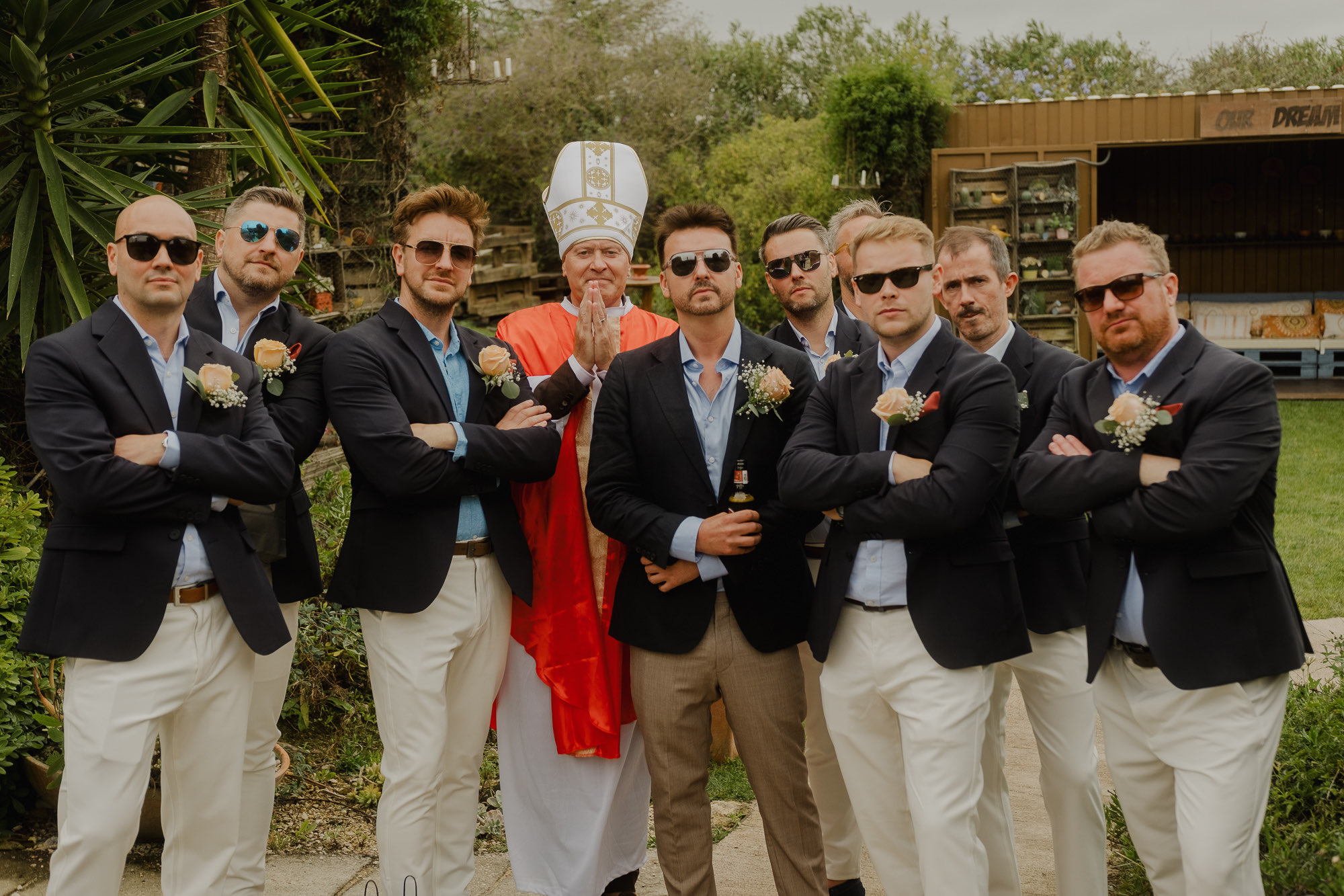 Nothing about this wedding followed a script — and that was the point. Preparations were unhurried, portraits happened quickly and naturally, and the ceremony embraced humour and surprise. Sunglasses, drinks in hand, songs sung by everyone present — moments were lived fully instead of being managed.