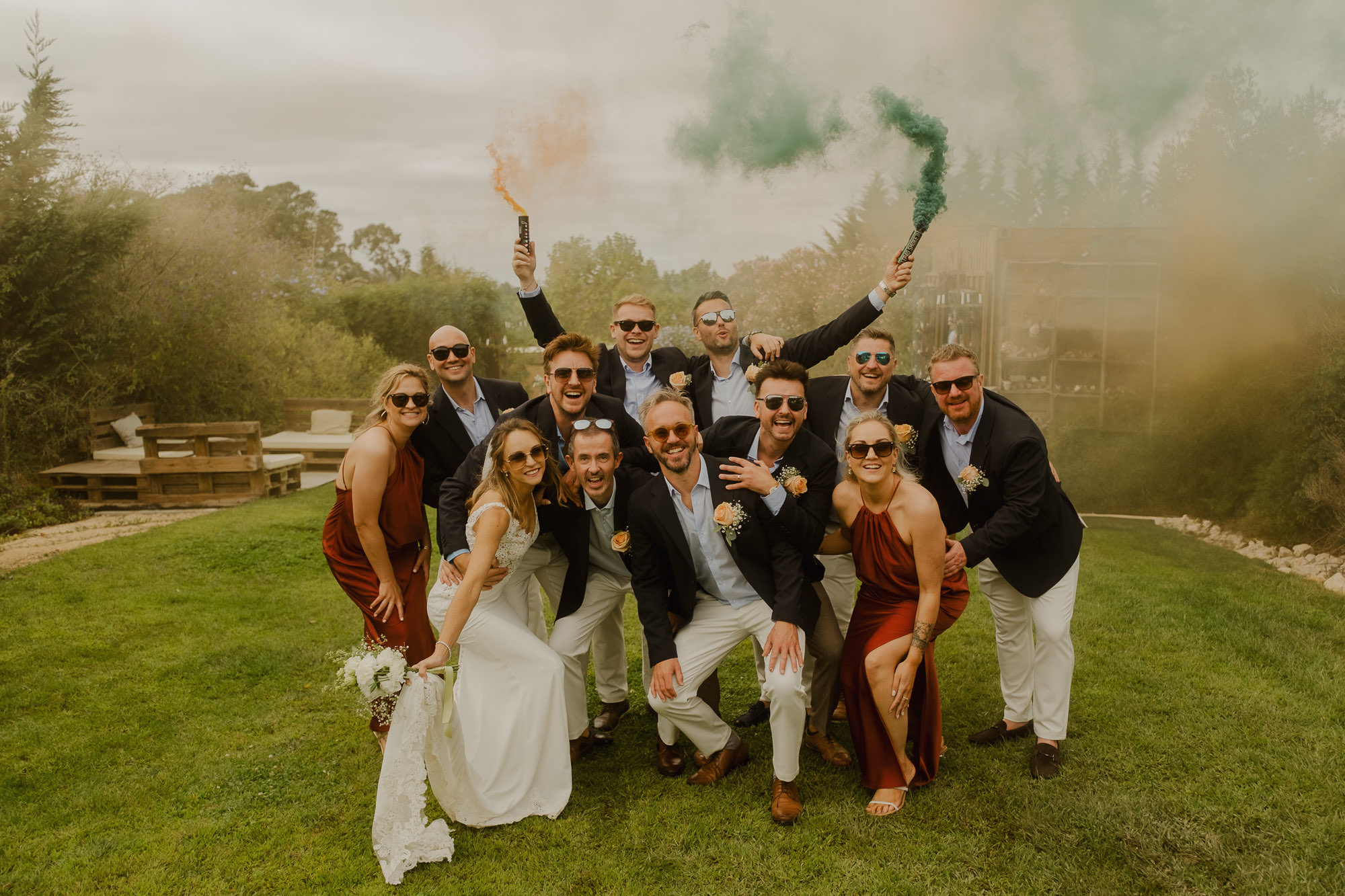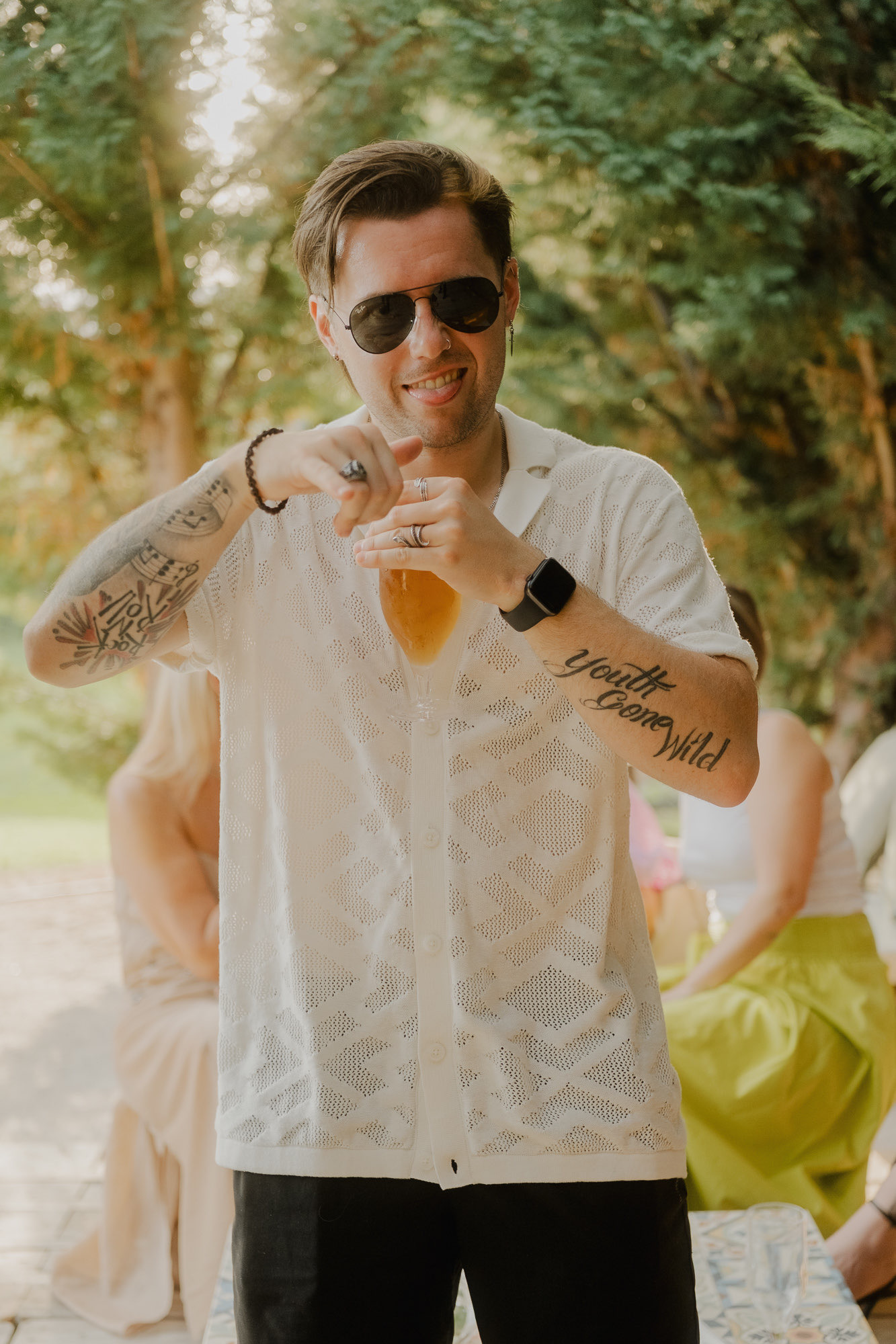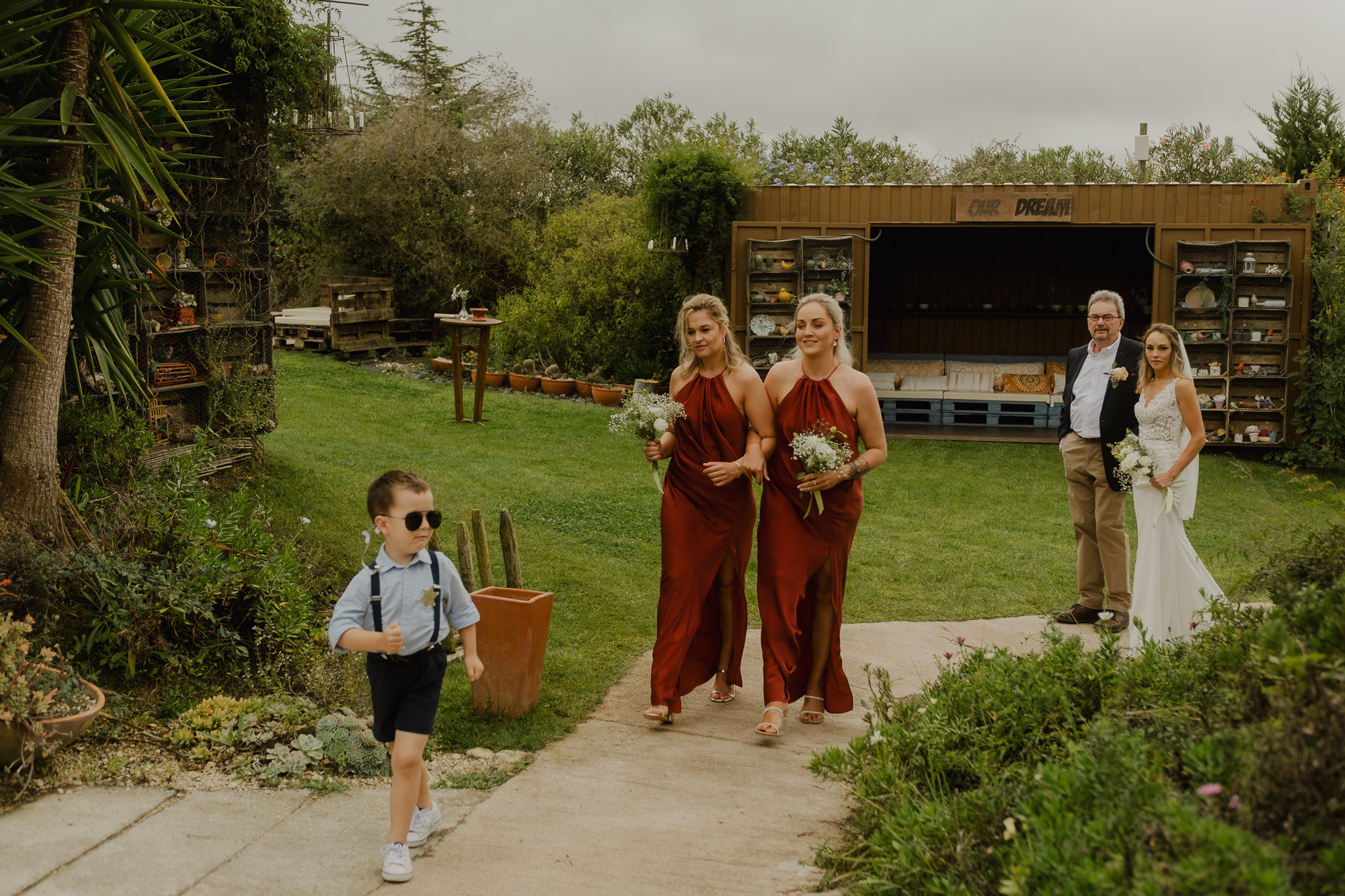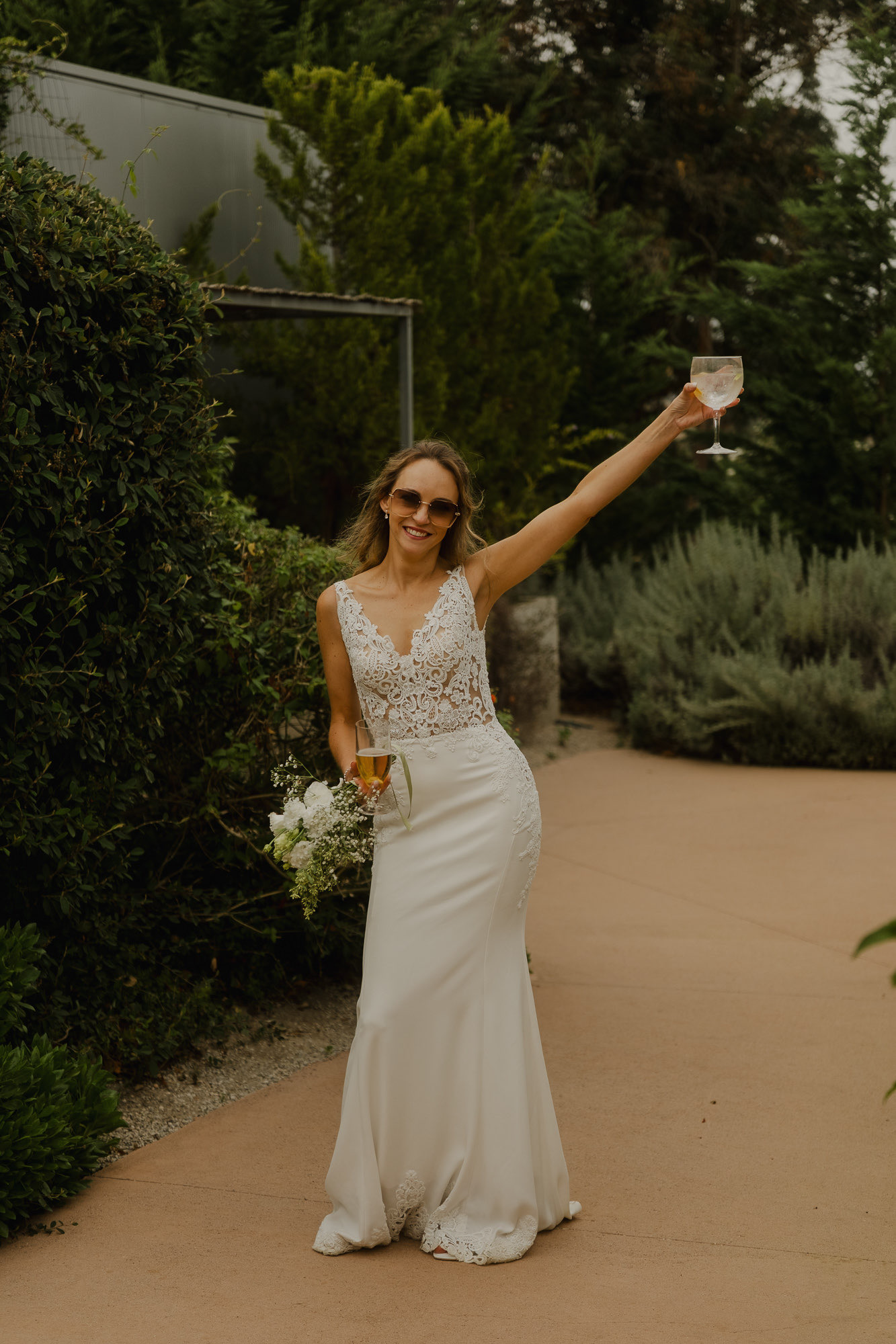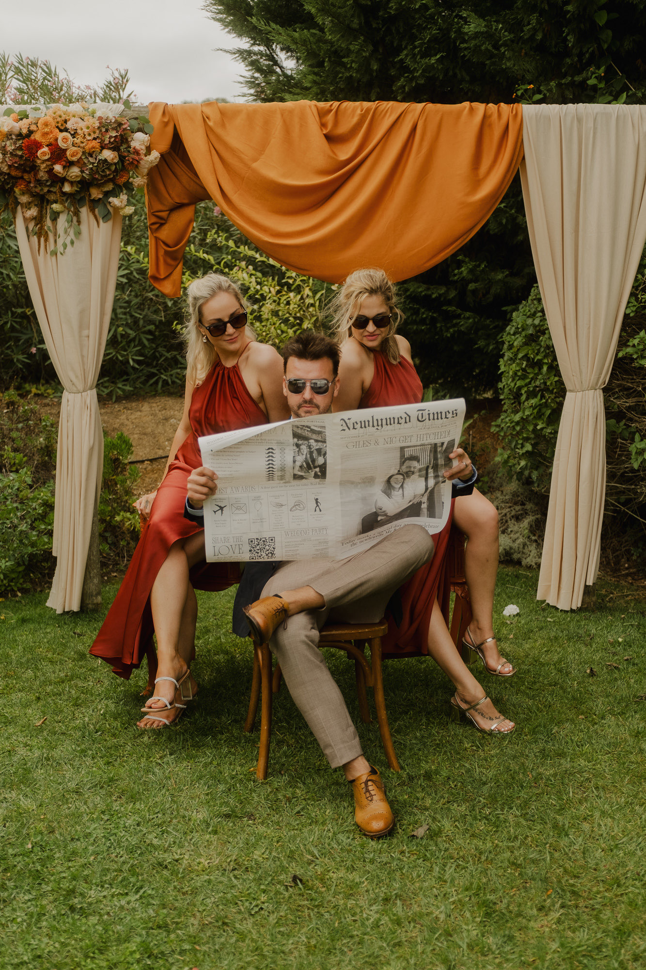 Nothing about this wedding followed a script — and that was the point. Preparations were unhurried, portraits happened quickly and naturally, and the ceremony embraced humour and surprise. Sunglasses, drinks in hand, songs sung by everyone present — moments were lived fully instead of being managed.