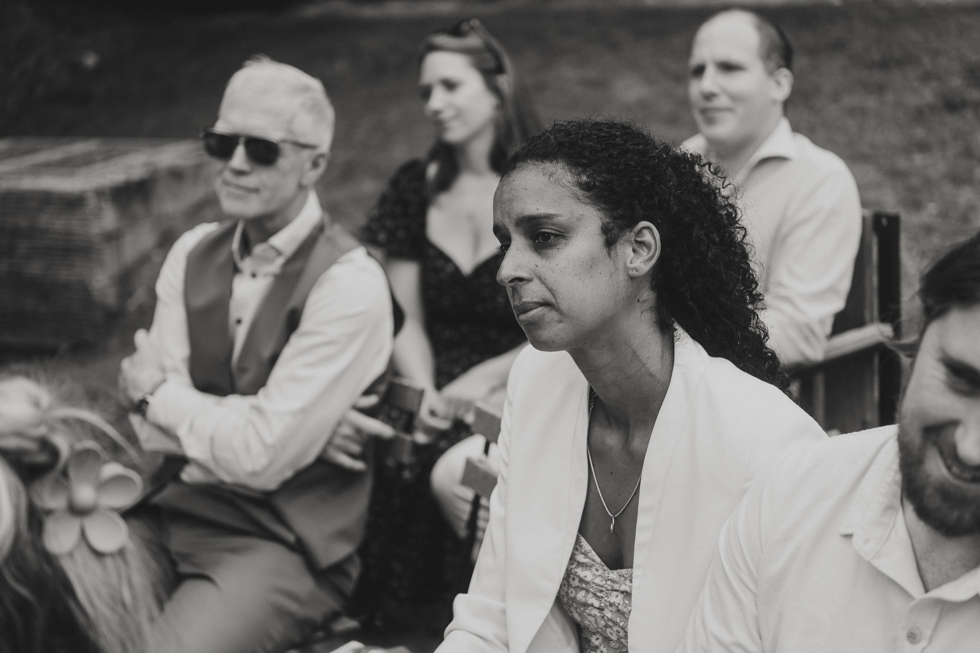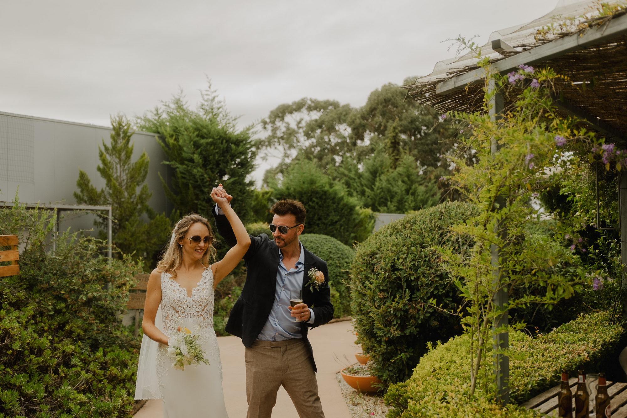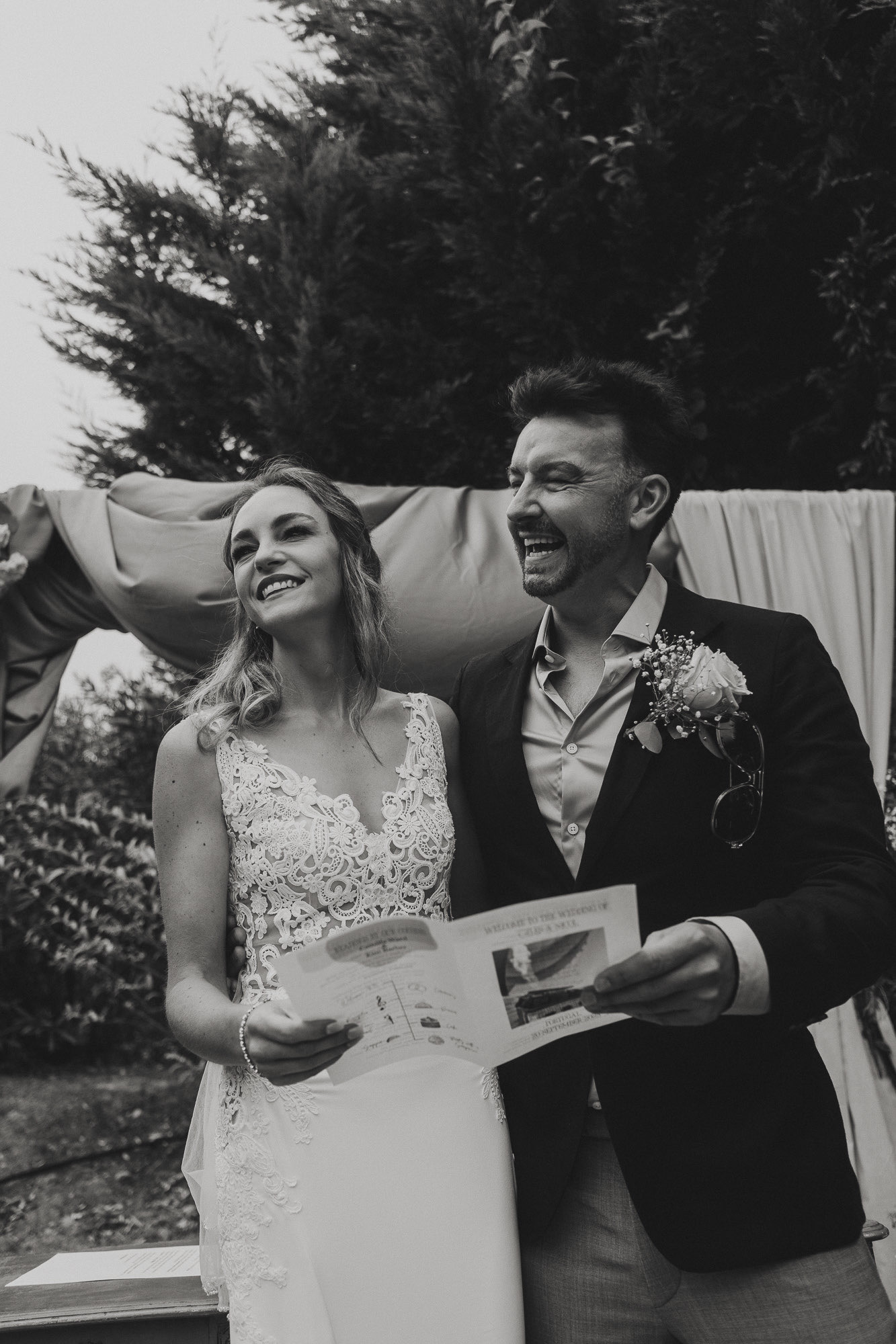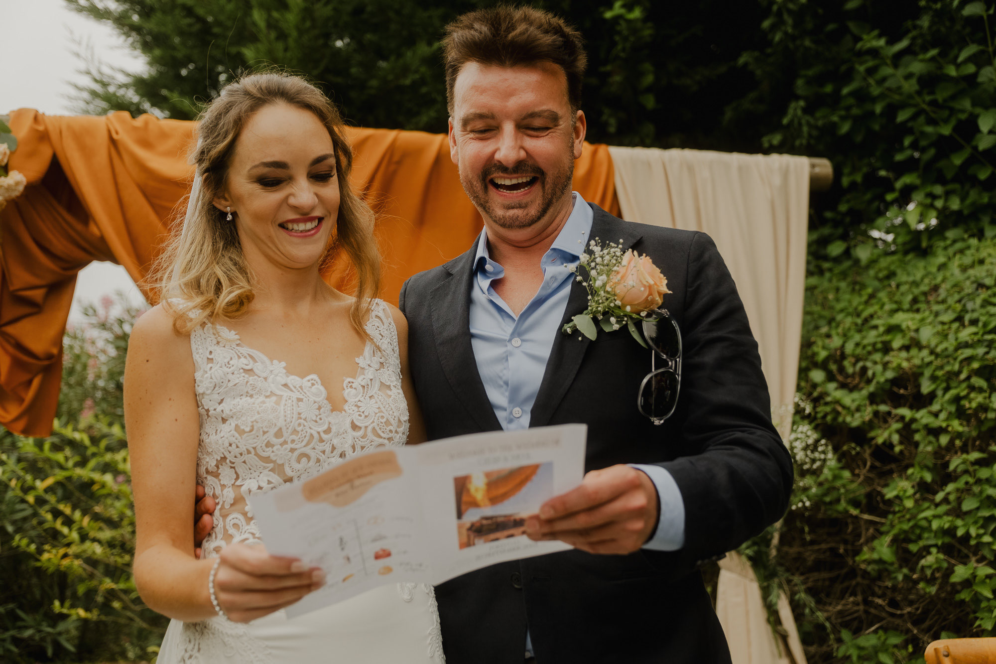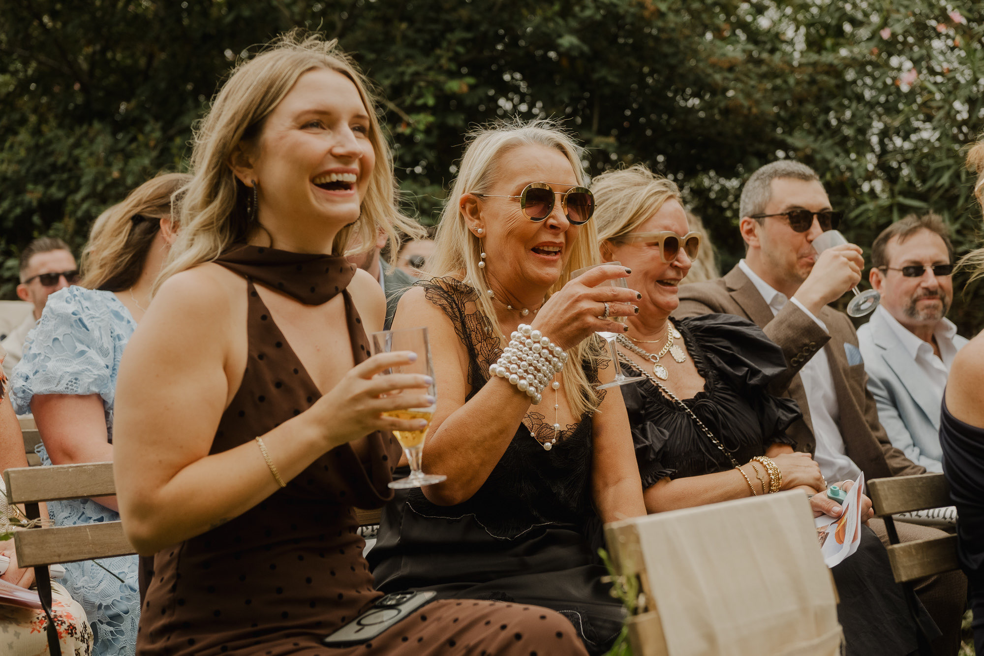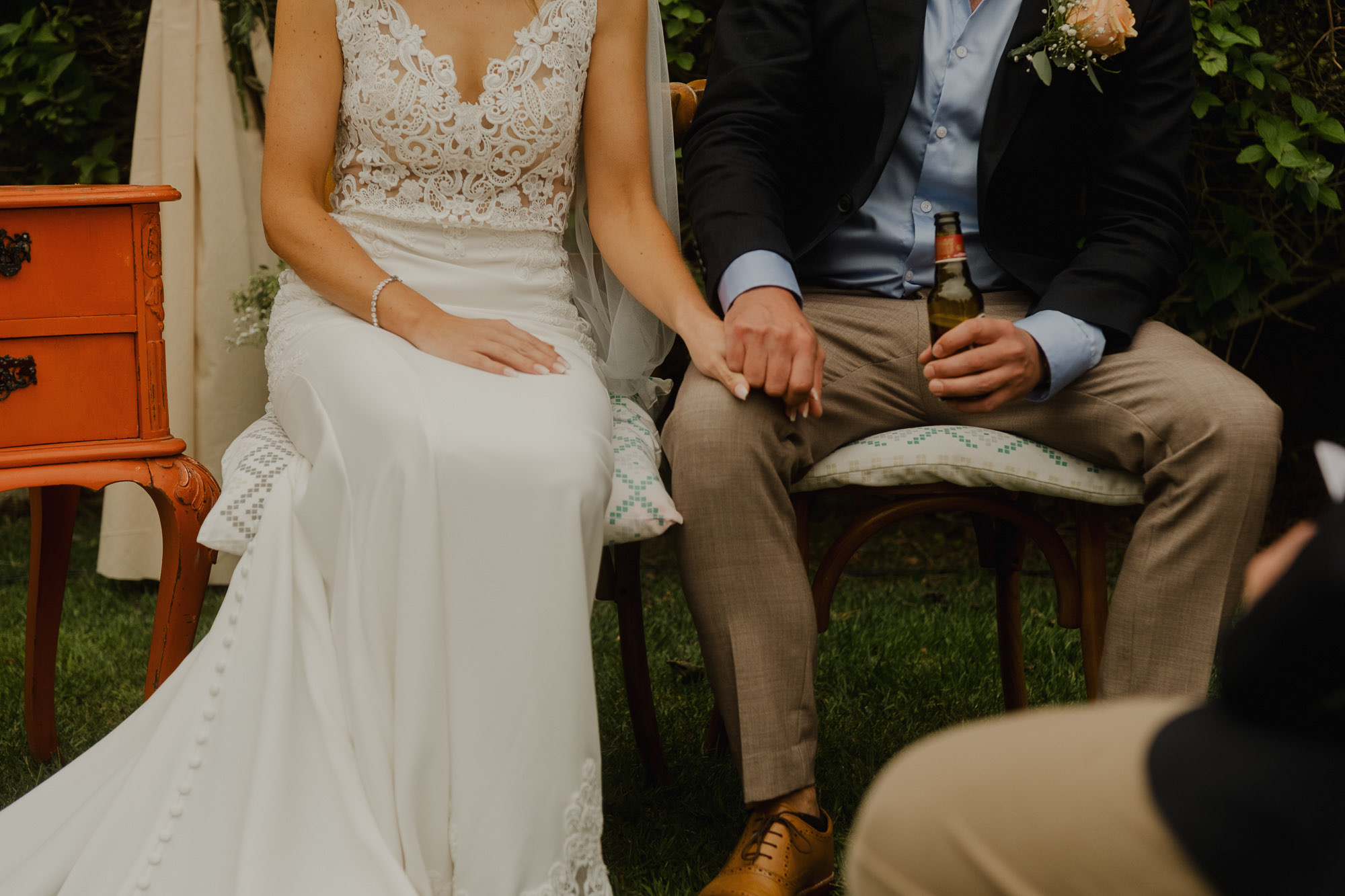 Nothing about this wedding followed a script — and that was the point. Preparations were unhurried, portraits happened quickly and naturally, and the ceremony embraced humour and surprise. Sunglasses, drinks in hand, songs sung by everyone present — moments were lived fully instead of being managed.