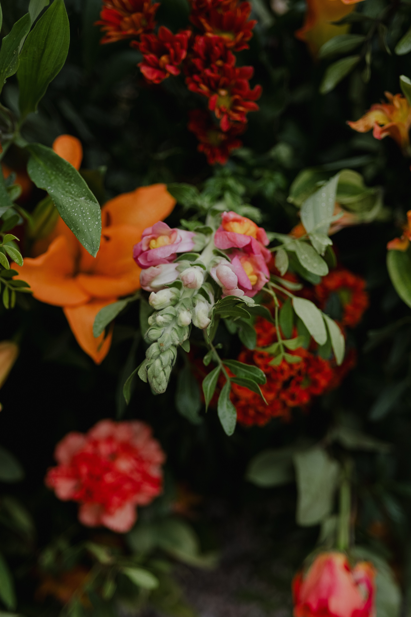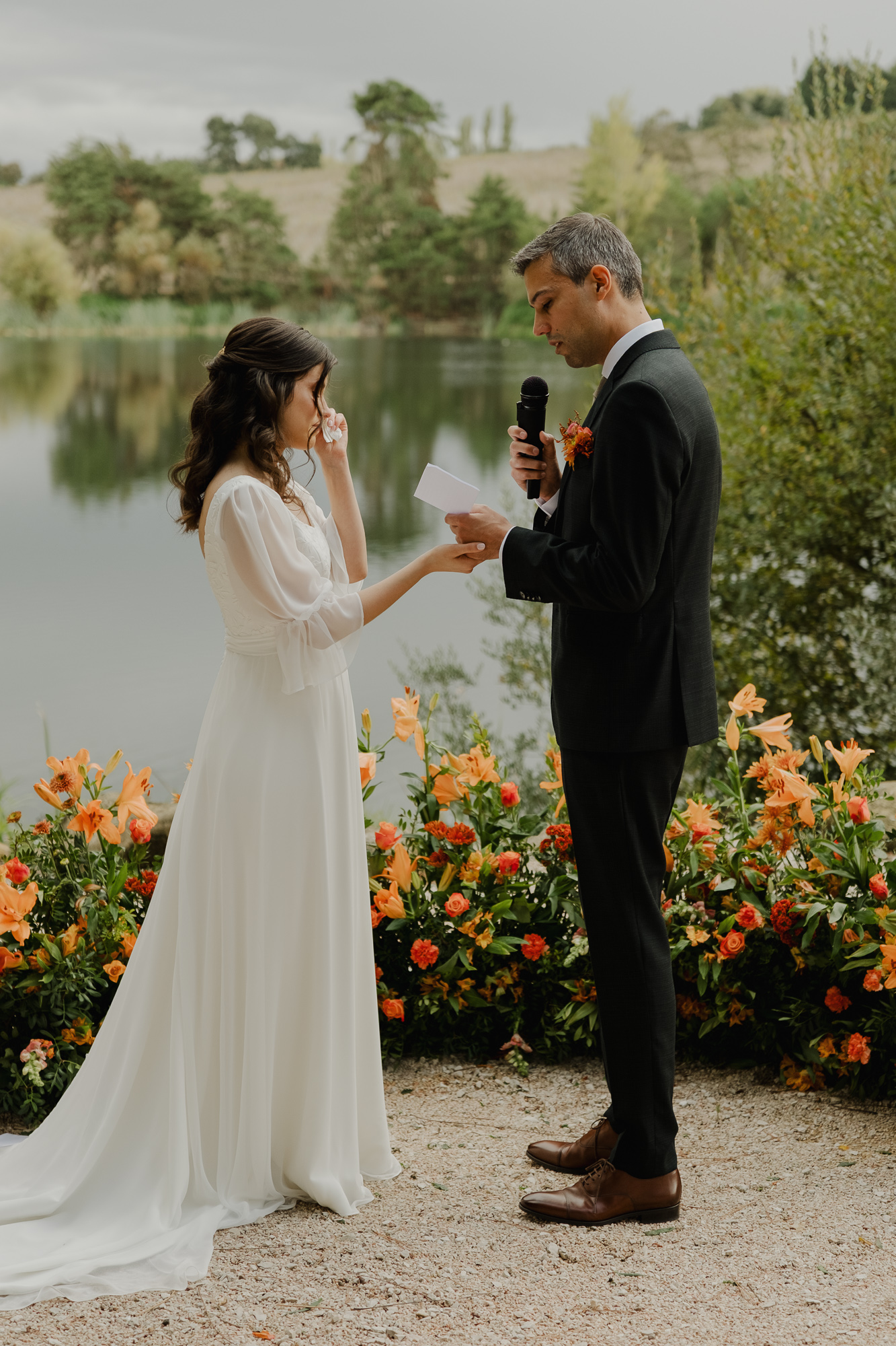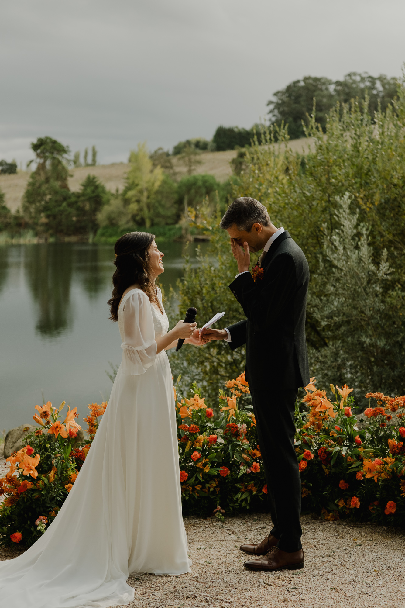 What could have felt uncertain instead became calm and intimate — deep greens and rich florals standing out beautifully against the muted light, laughter carrying easily across the lake, and moments given space to happen without rush.
