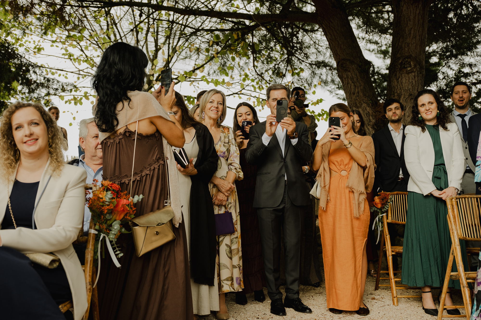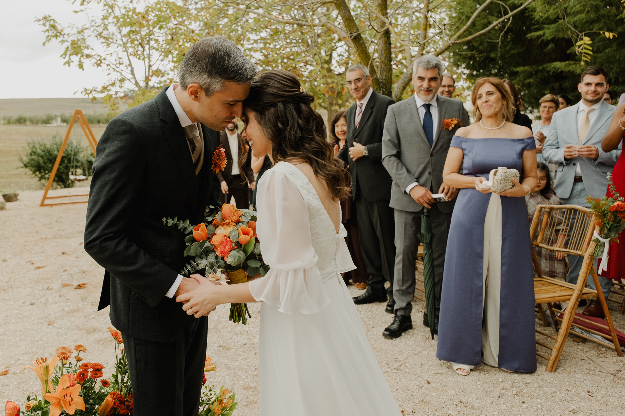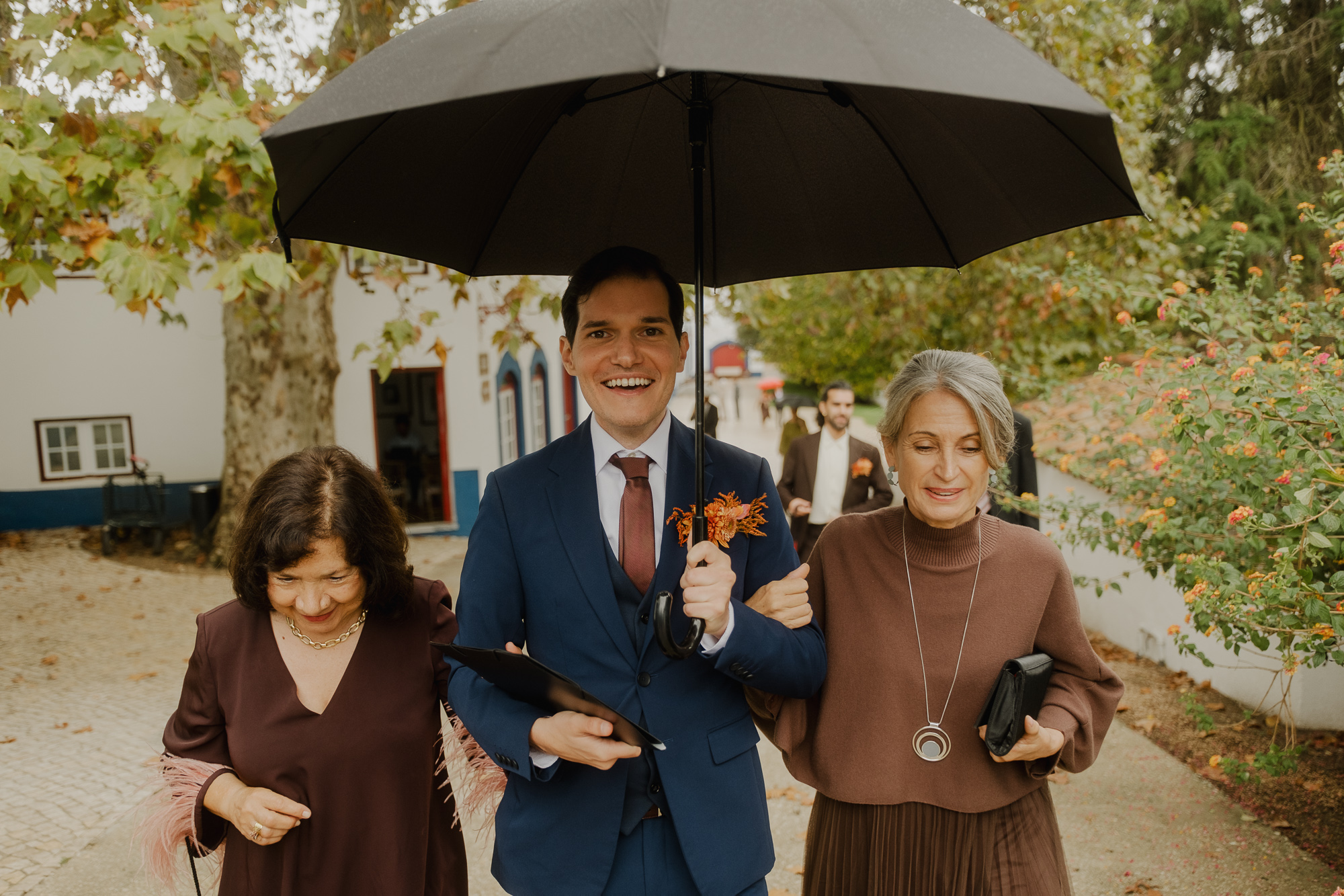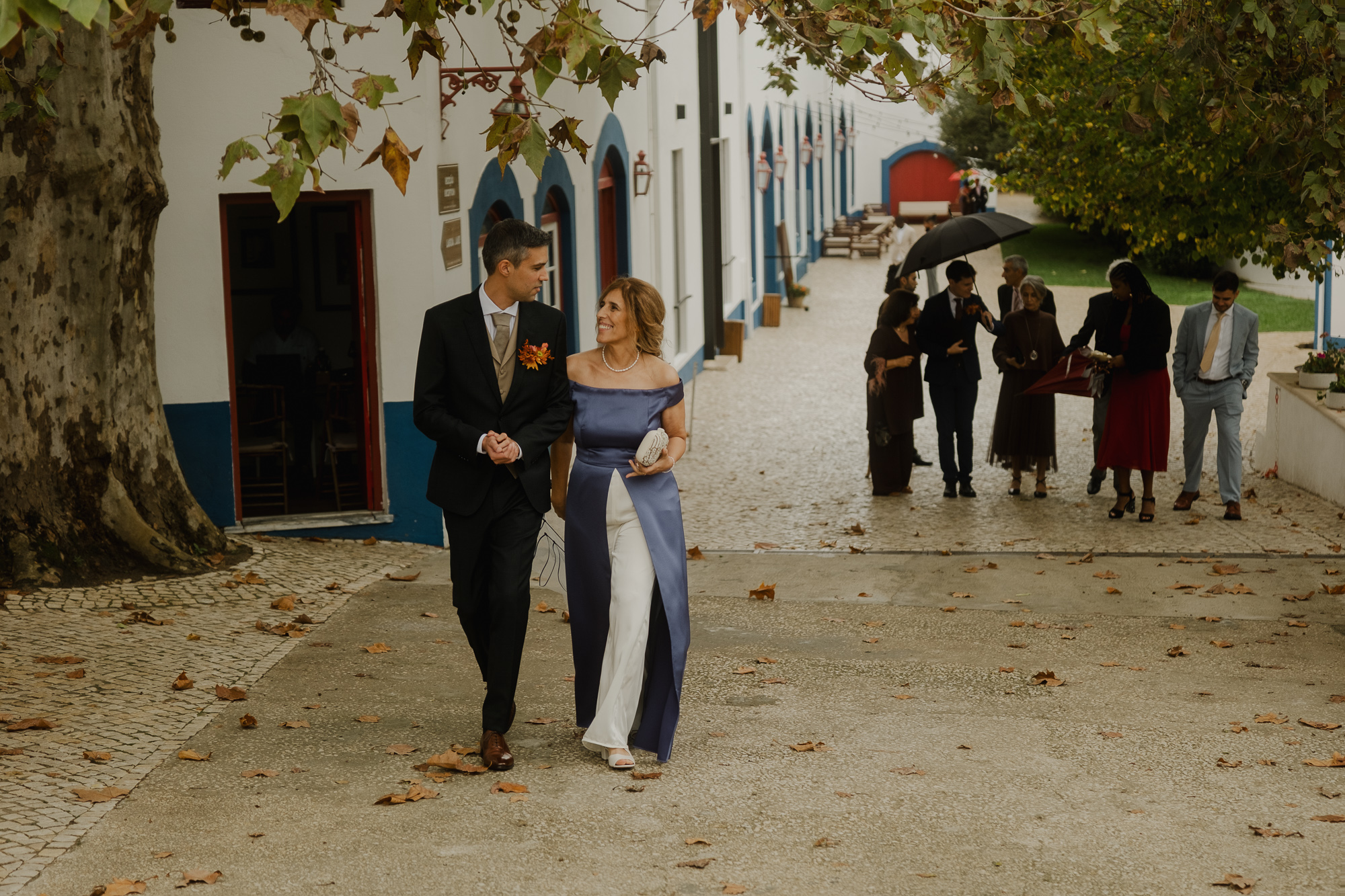 This October wedding at Quinta da Bichinha in Portugal unfolded under changing skies, where rain and soft overcast light shaped the rhythm of the day rather than stopping it.