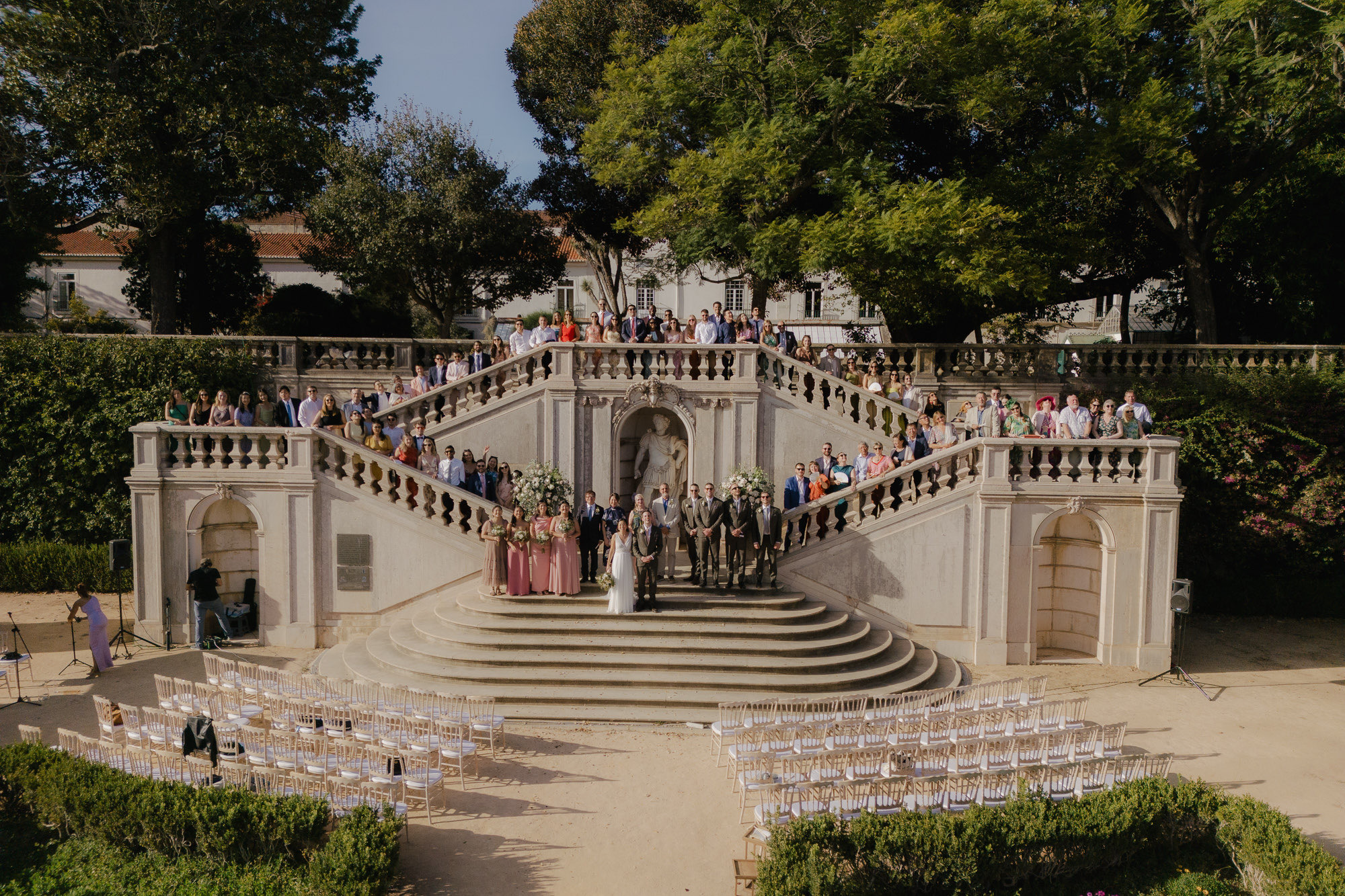 Vandelli Gardens is one of Lisbon’s most distinctive venues, combining 18th-century history with layered outdoor spaces and architectural drama. The staircase ceremony location is instantly recognisable, offering depth, symmetry, and natural framing, while the surrounding gardens provide texture, shade, and atmosphere throughout the day. As night falls, the venue truly comes alive — with terraces and pathways that adapt beautifully to creative lighting and open-air celebrations.