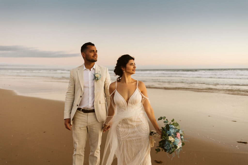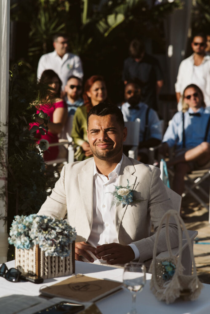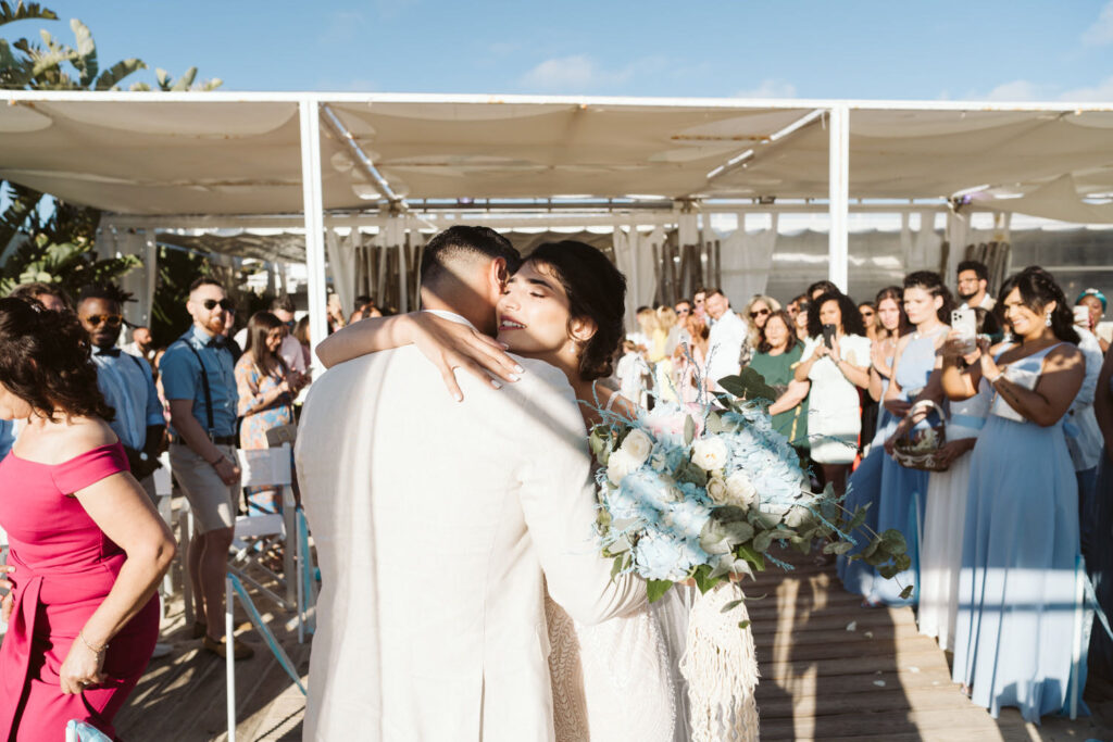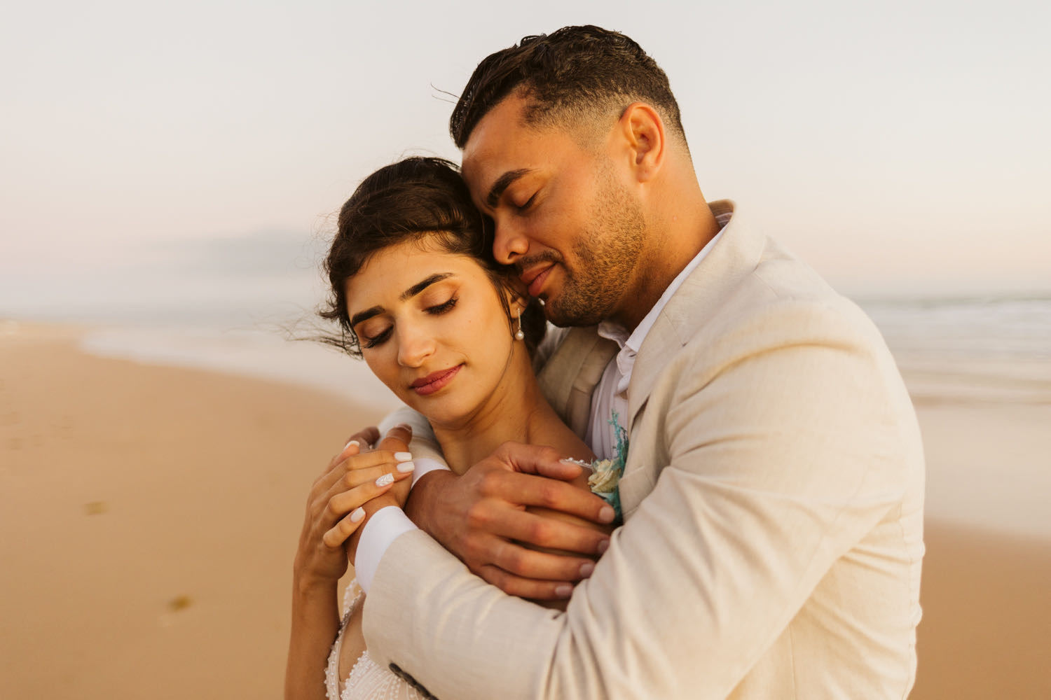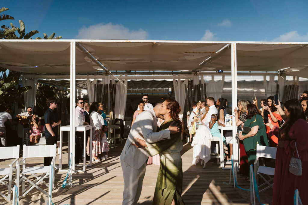 No pitoresco local à beira-mar vi acontecer este casamento no Waikiki, na Costa da Caparica. Os protagonistas desta vez foram a Bruna e Mabyo, um encantador casal do Brasil, para mais um belo destination wedding. O dia começou com um toque único: um primeiro toque em que optaram por não se verem de imediato. Em vez disso, escolheram partilhar um momento de conexão, conversando e tocando as mãos, ficando assim criado o tom emocional para o dia.