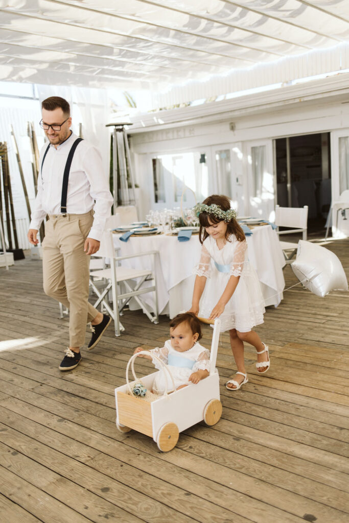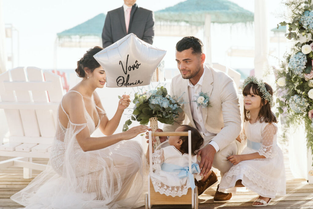 A cerimónia foi um momento comovente, tornando-se ainda mais especial com a entrada da filha do casal. Entrando num carro de madeira, segurava um balão em forma de estrela com o nome do avô, que carinhosamente observava o casamento das estrelas. Foi um tributo tocante que adicionou um toque poético à ocasião.